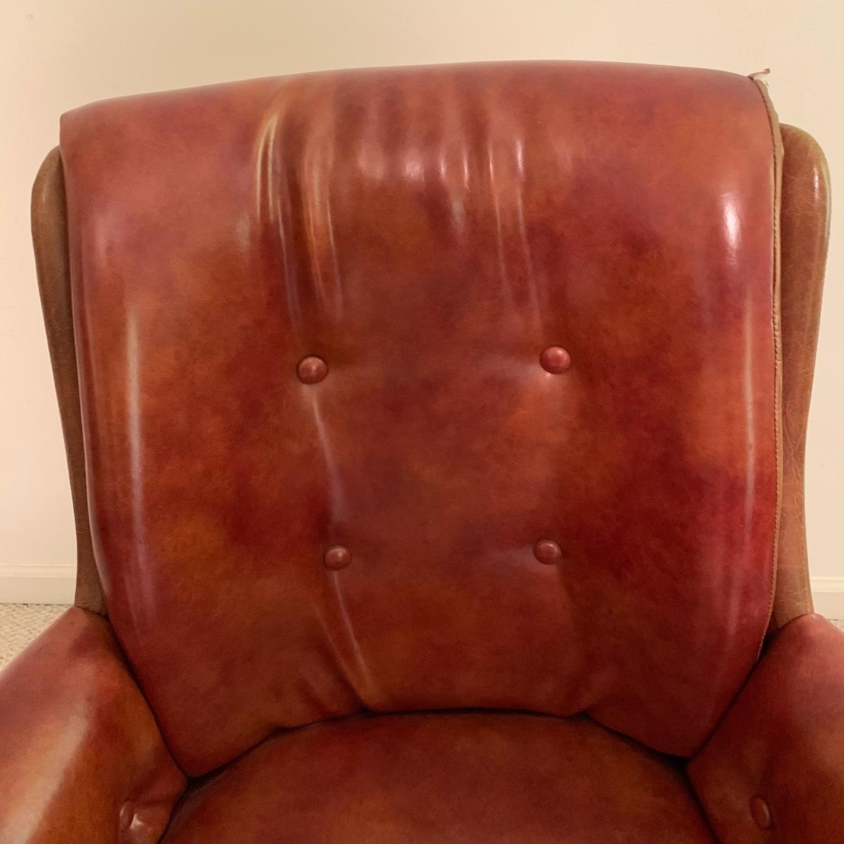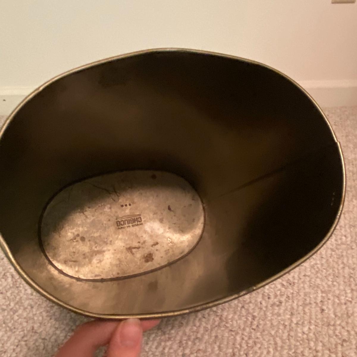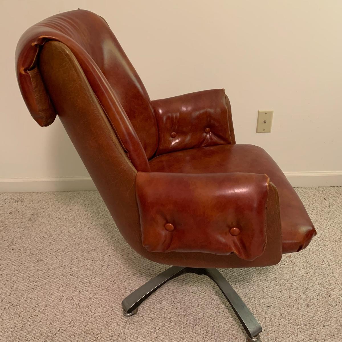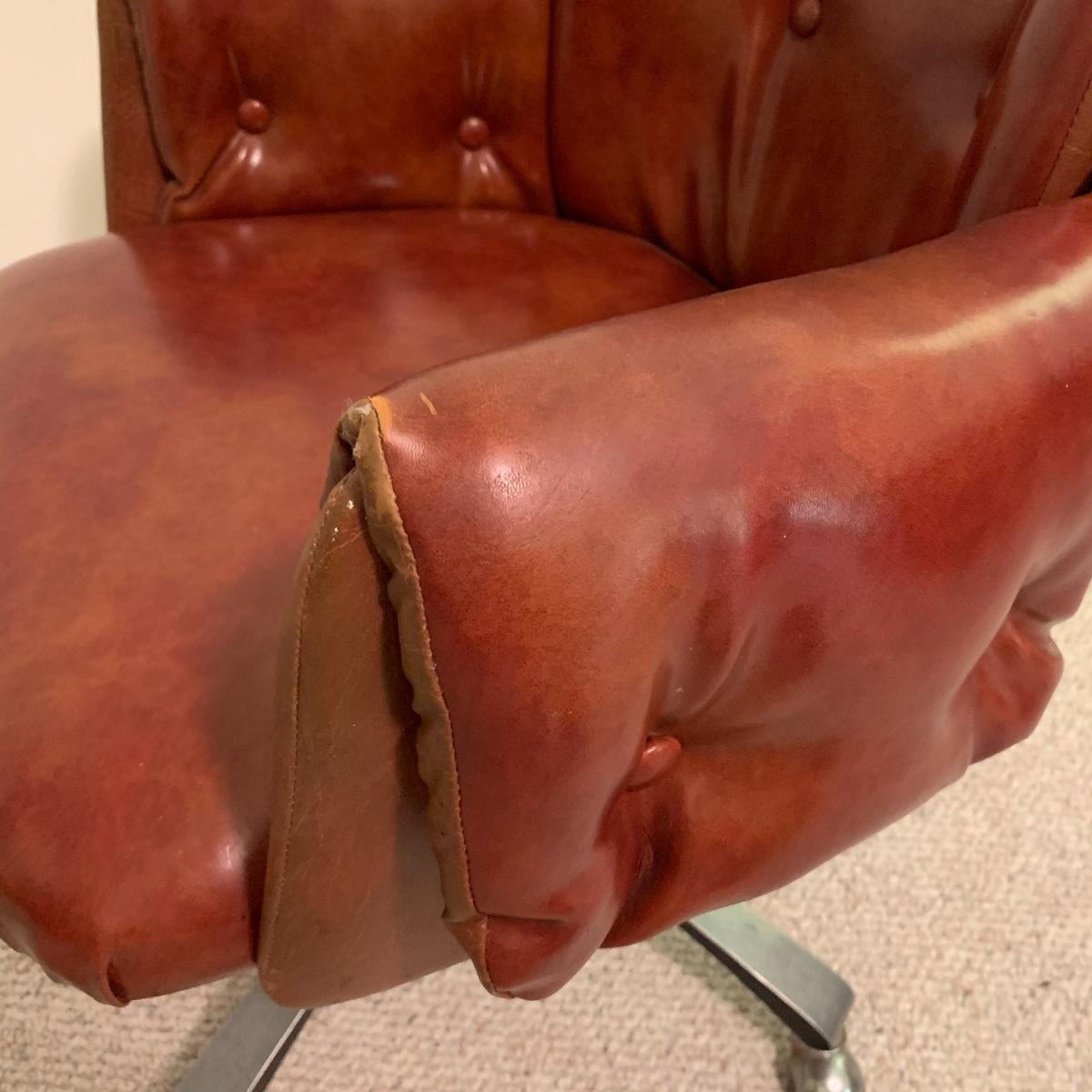 Lot includes a dark red leather-like office chair. Chair measurements are 25”x18”x17”. Including back, chair stands 36” tall. Chair swivels and is on wheels. Sturdy back with button details, does not rock. Copper colored waste bin with unique continuous design measures 13” tall. See photos. Local pickup only.