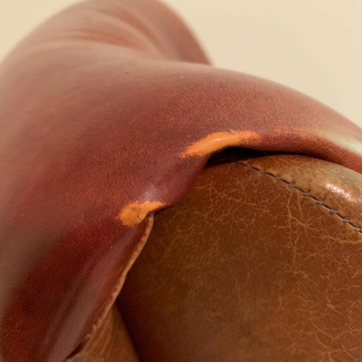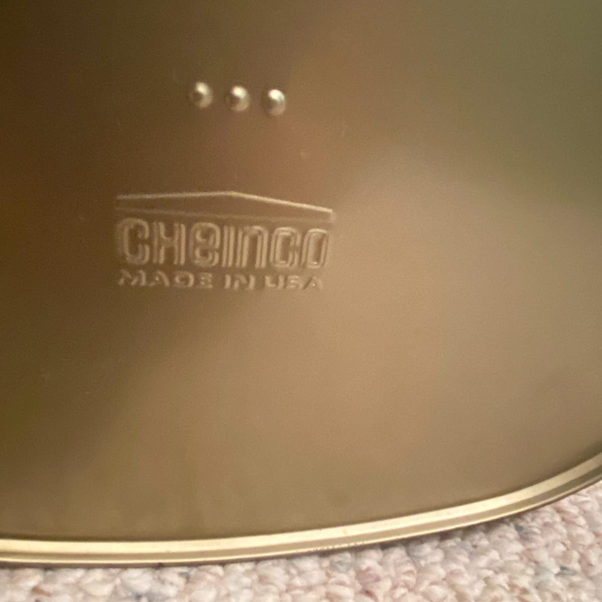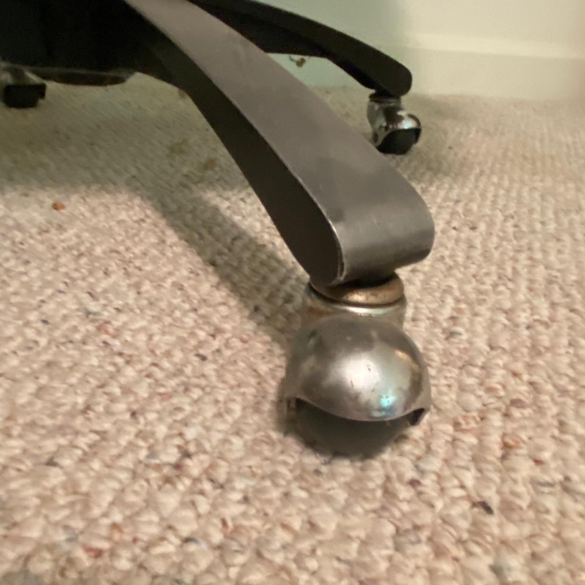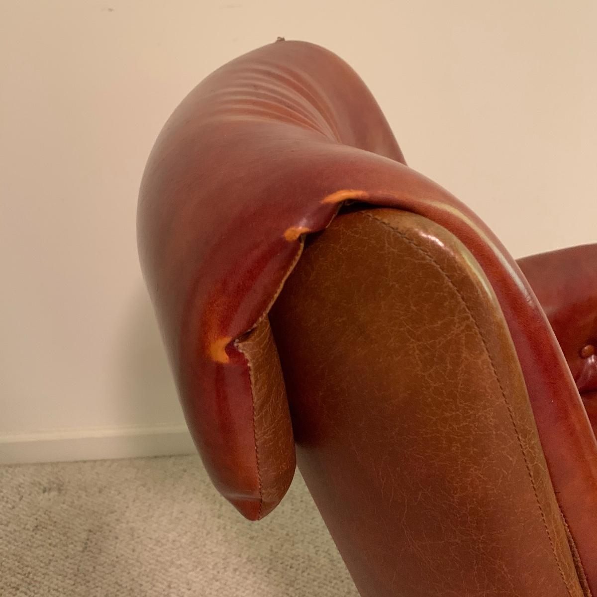 Lot includes a dark red leather-like office chair. Chair measurements are 25”x18”x17”. Including back, chair stands 36” tall. Chair swivels and is on wheels. Sturdy back with button details, does not rock. Copper colored waste bin with unique continuous design measures 13” tall. See photos. Local pickup only.