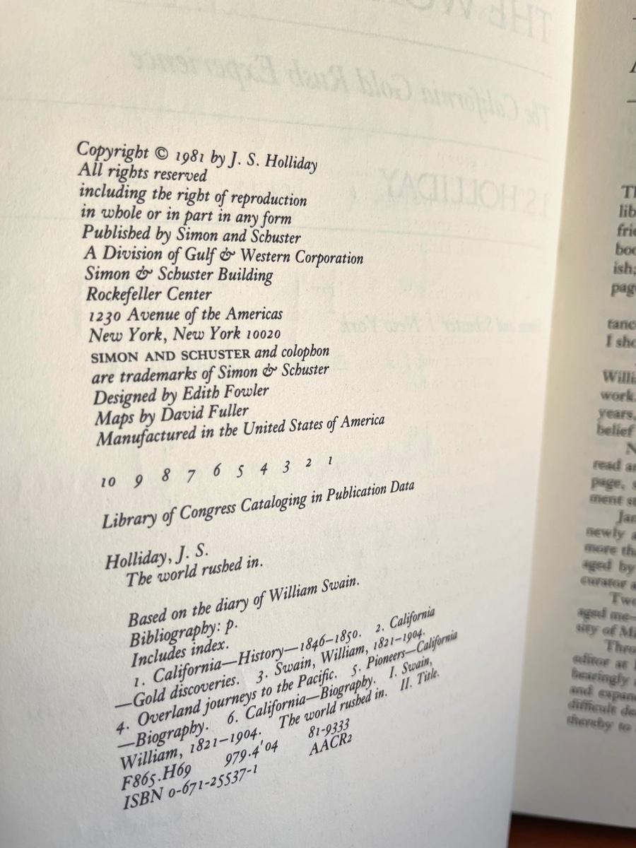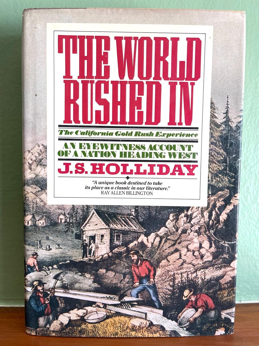 LOT 19 - The World Rushed In by J. S. Holliday. A Book of the California Gold Rush, an eyewitness account of a nation heading west. It is signed by the author with a personal inscription to Sylvia Gilman but mentions David. The book includes the original dust jacket with price attached. First edition / First Printing. Inside pages and clean and neat. Dust jacket has some light wear.