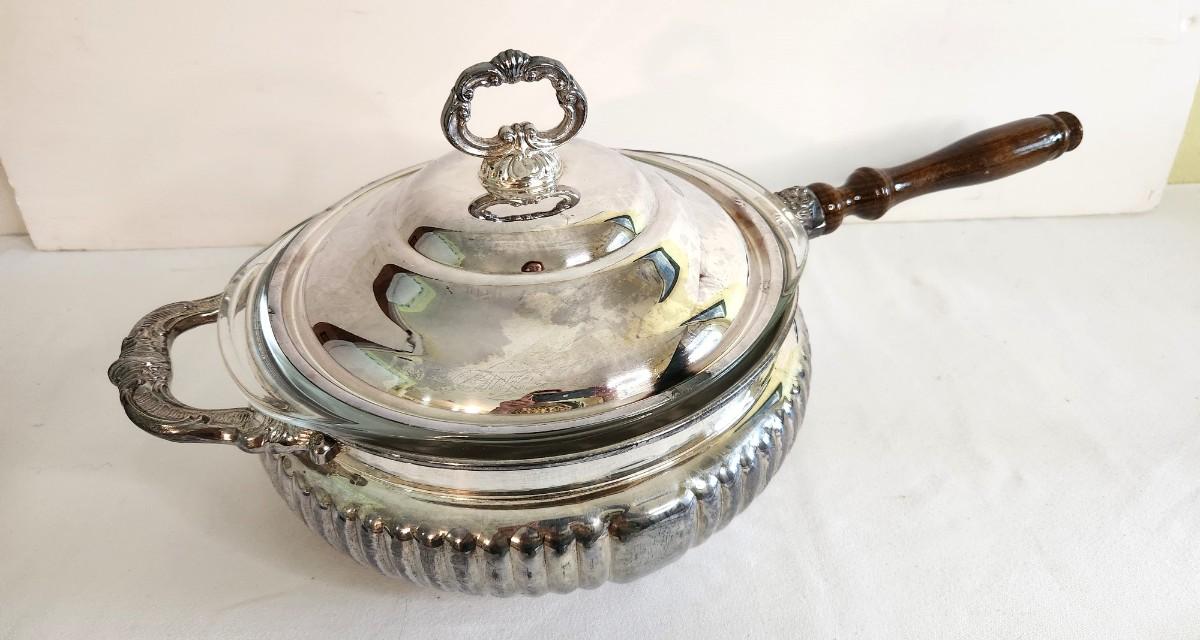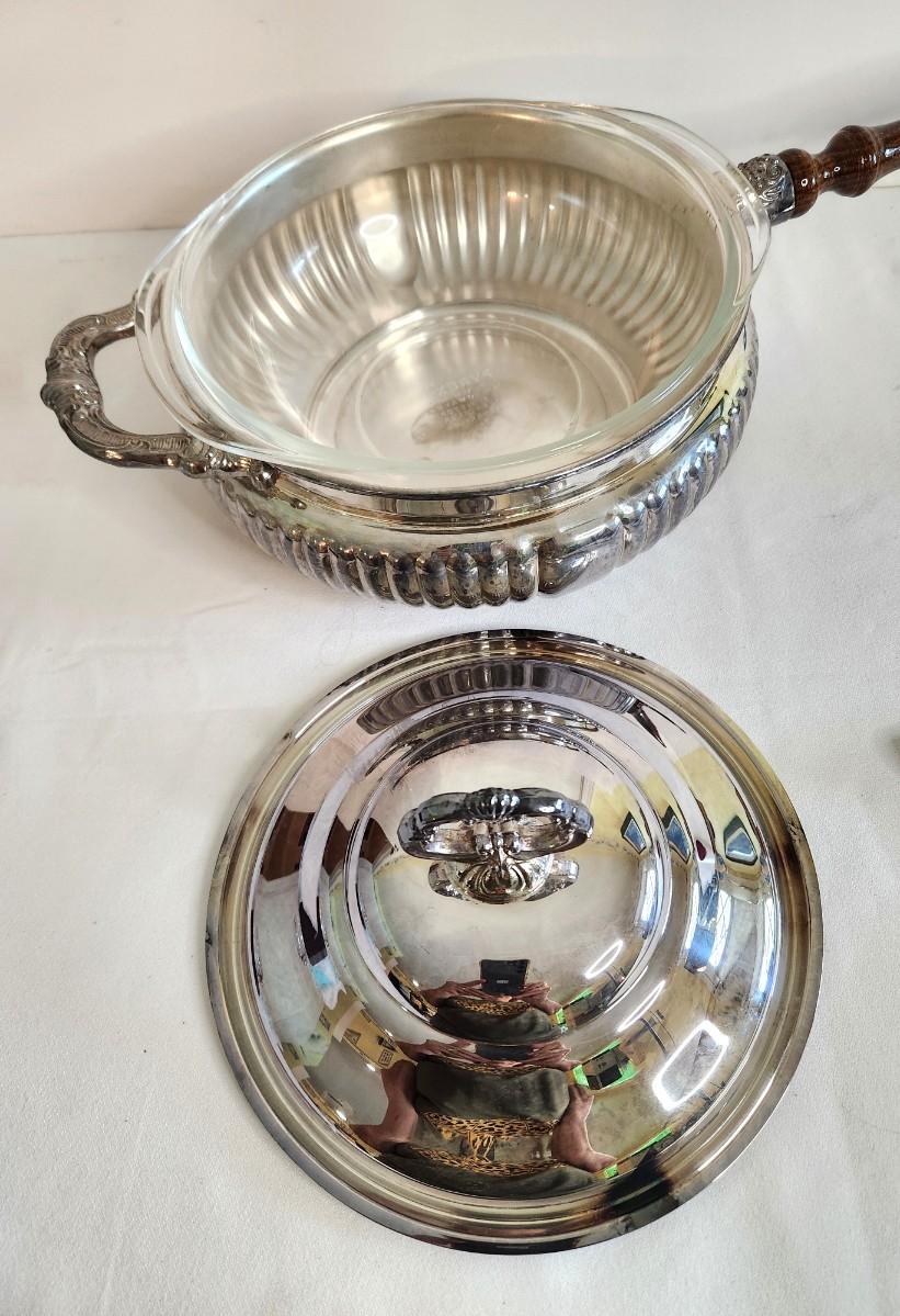 Pretty silverplate covered casserole with liner and detachable wooden handle. 19" long including handle, 9" tall. Needs a light polish - good condition.