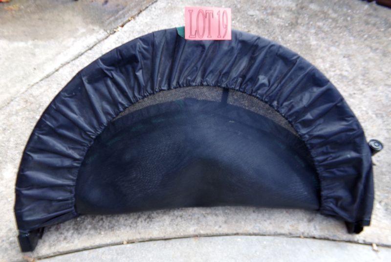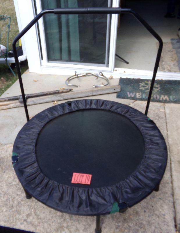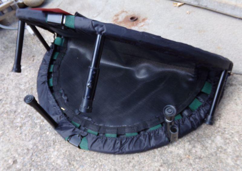 This exercise trampoline has a removable safety handle and folds in half for storage.