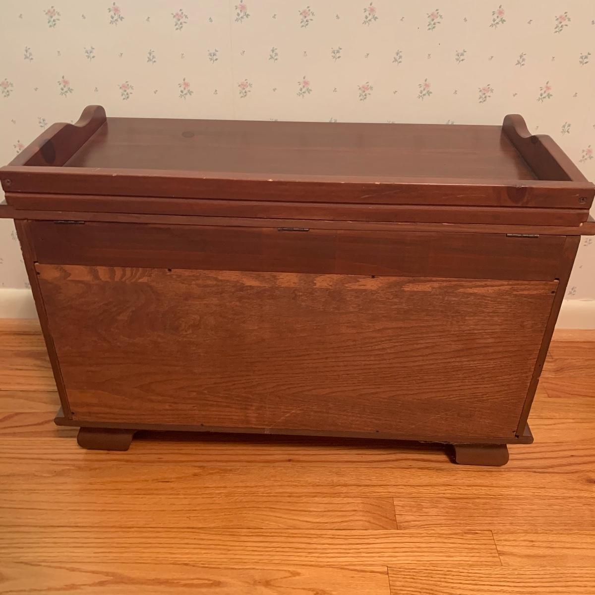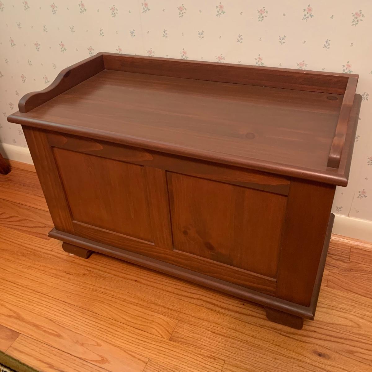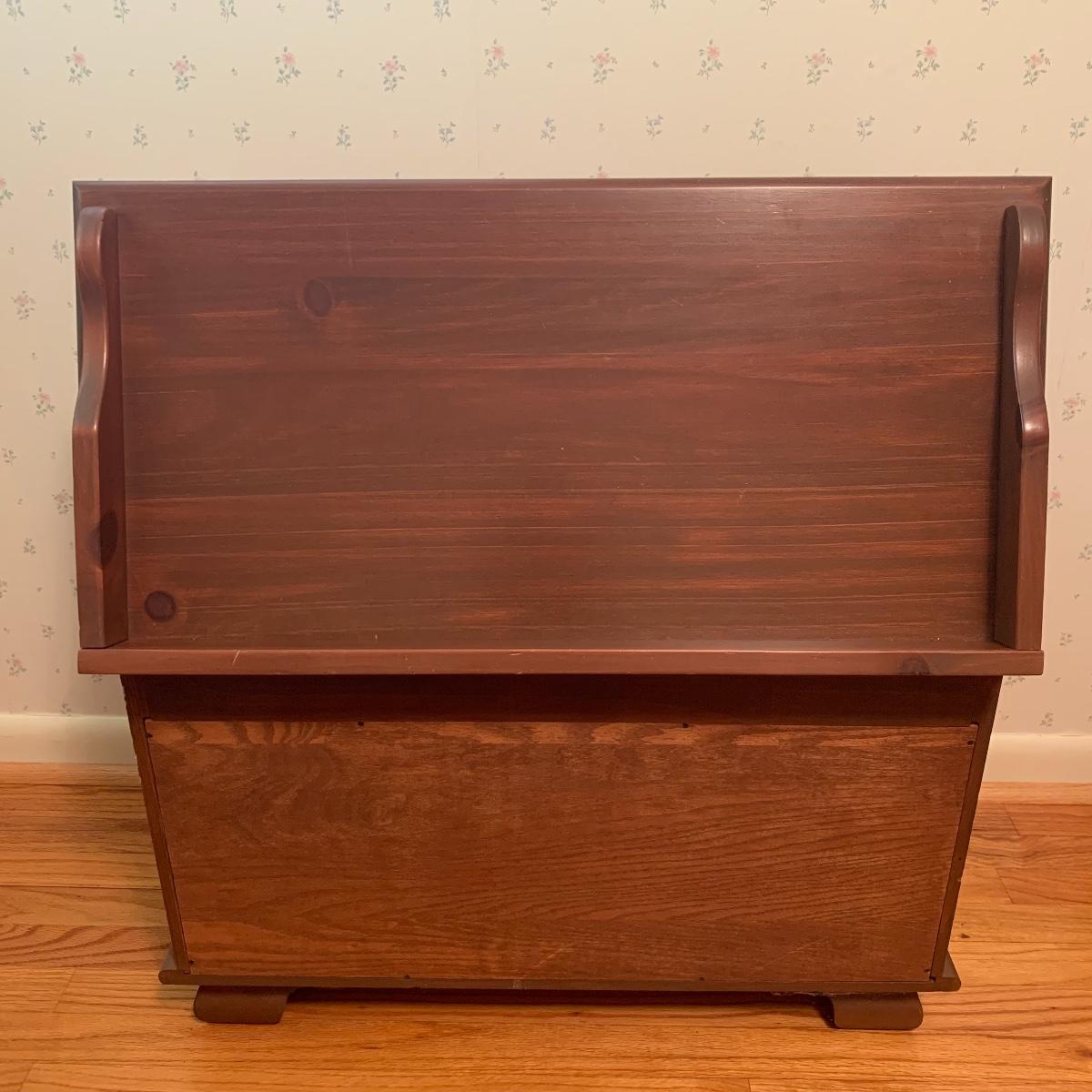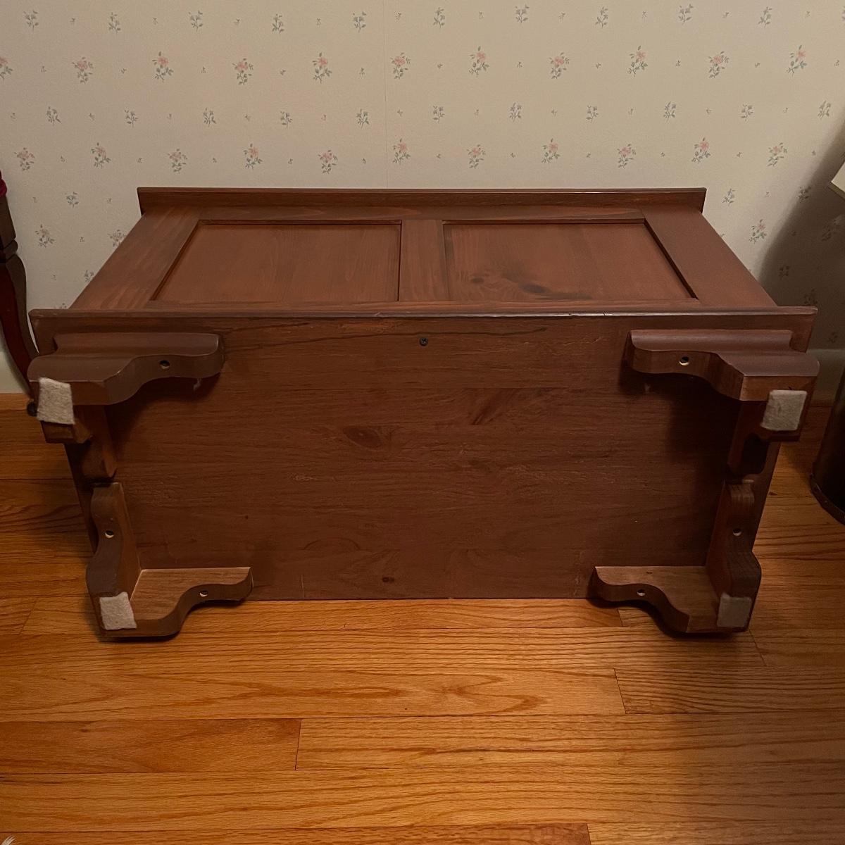 This lot includes one small wooden bench. The top of the bench opens up for storage inside. The wood is a lightweight material. It measures about 29in x 15in x 20in. Local pick up only.
