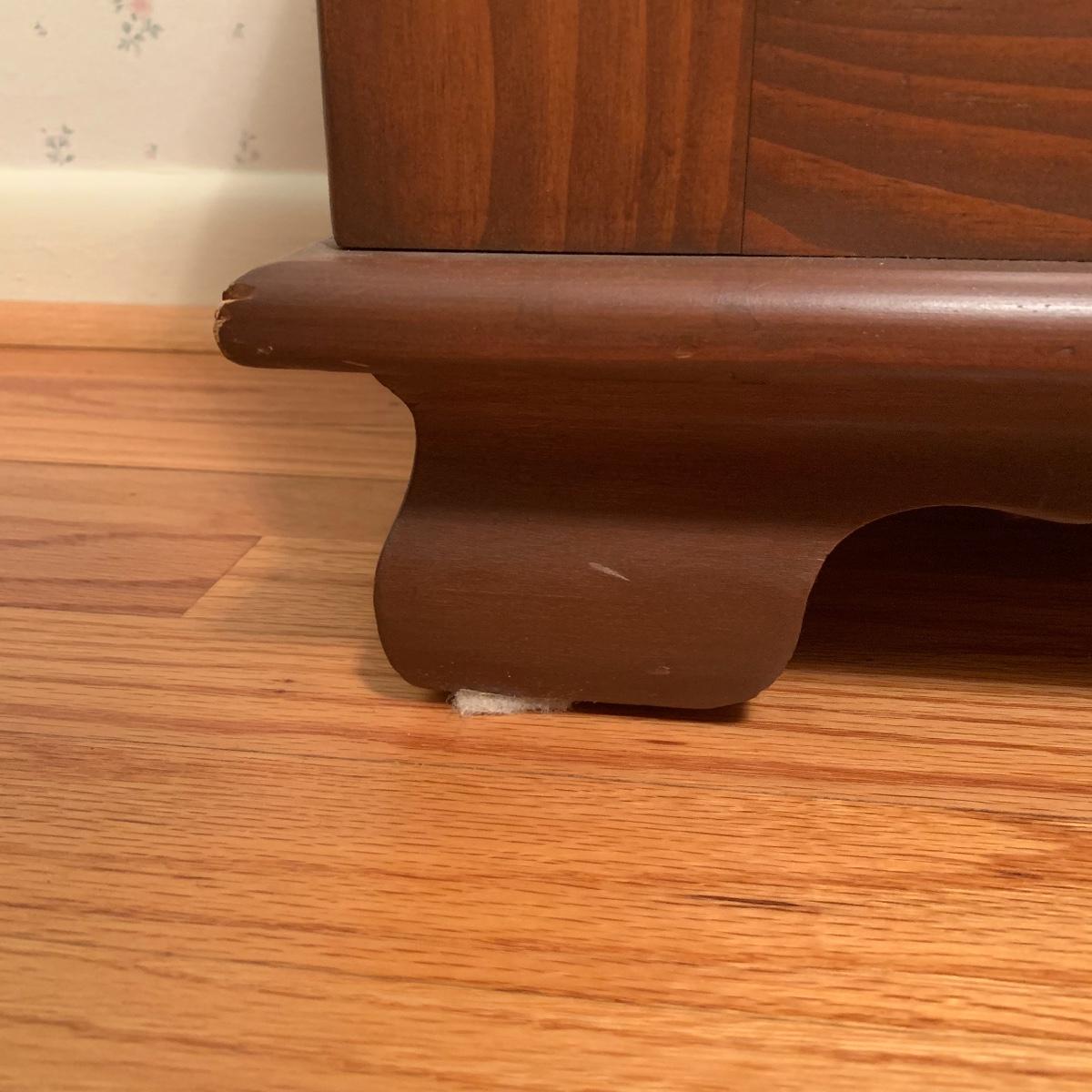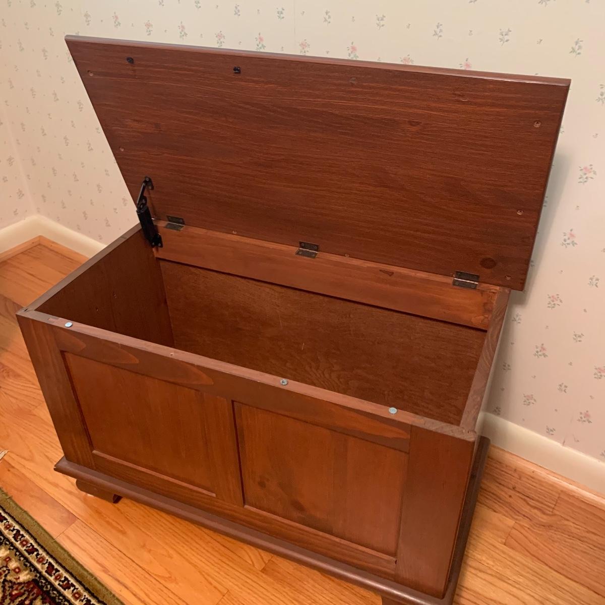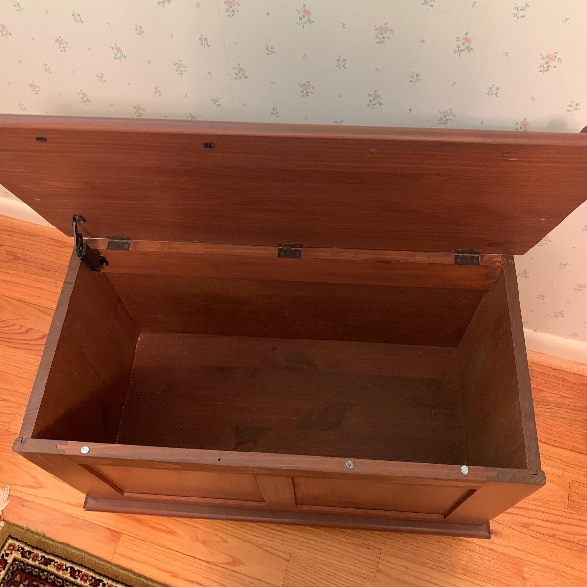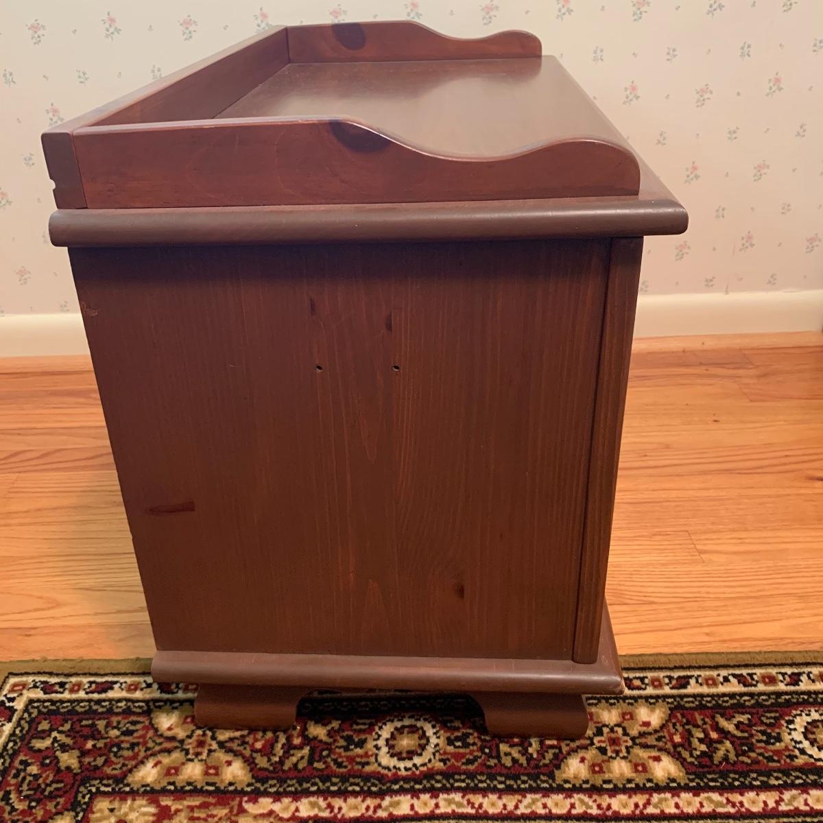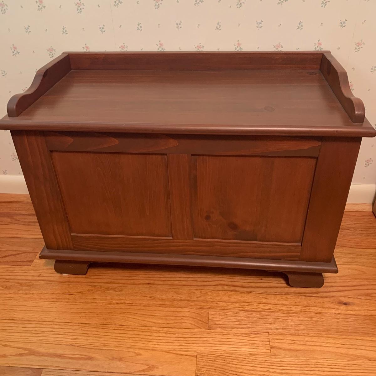This lot includes one small wooden bench. The top of the bench opens up for storage inside. The wood is a lightweight material. It measures about 29in x 15in x 20in. Local pick up only.