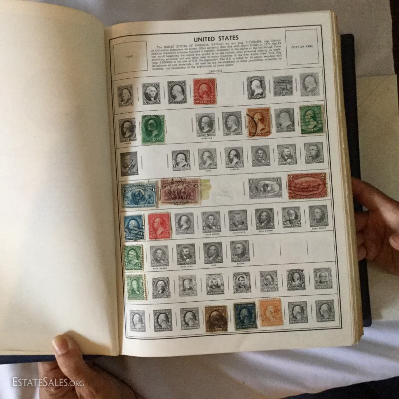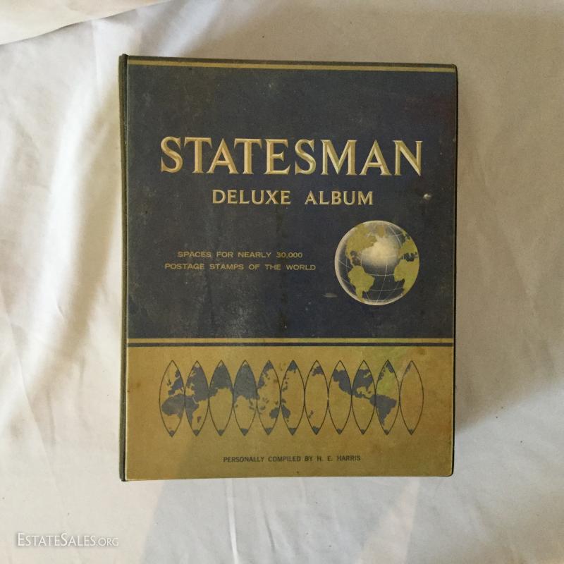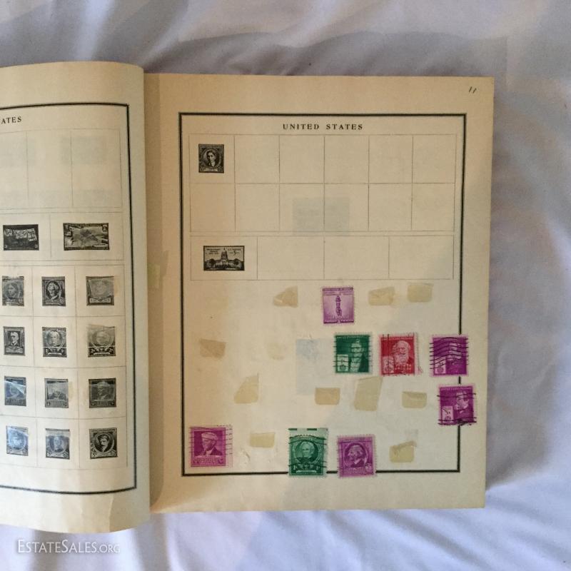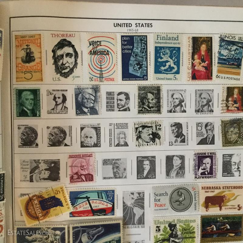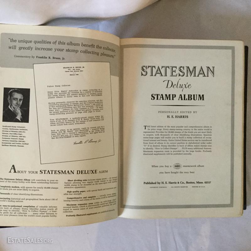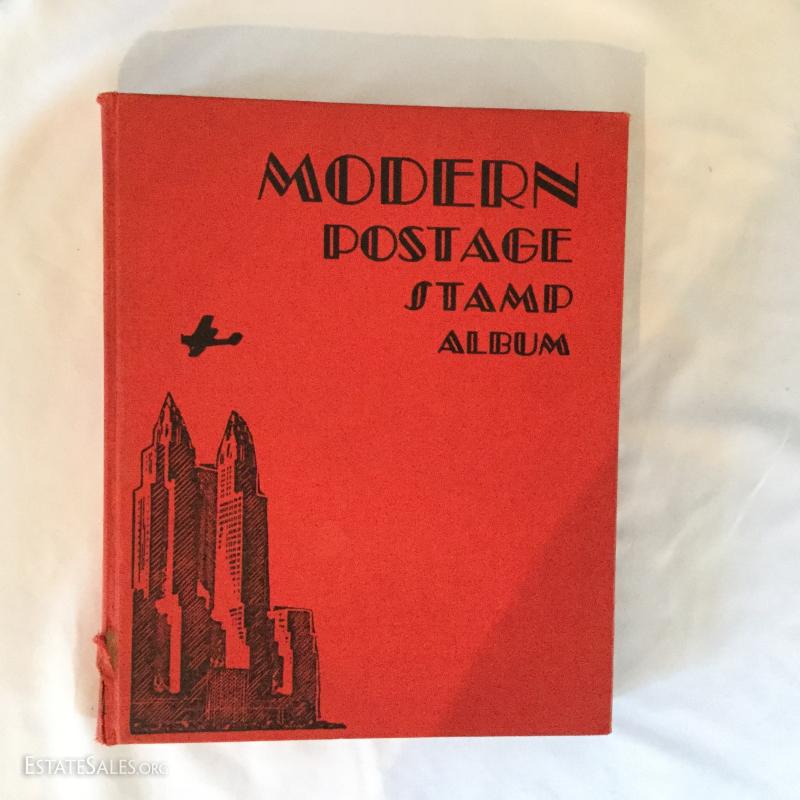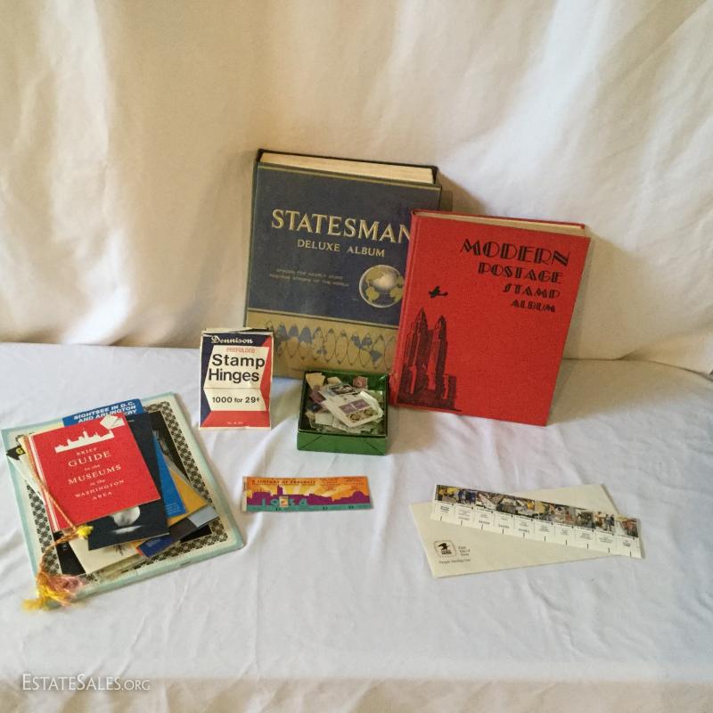 Lot of collectible stamps includes two books and a small box of used international stamps. One book is "A Statesman Deluxe Stamp Album" and includes US and international stamps. The second book is "1940's Modern Postage Stamp Album" with few stamps included. Also included are a set of First Day Issue Postal People Stamps, several vintage travel brochures, maps, and a 1934 Chicago expo ticket.
