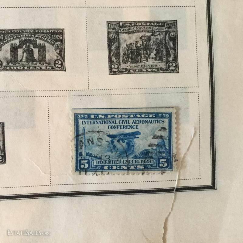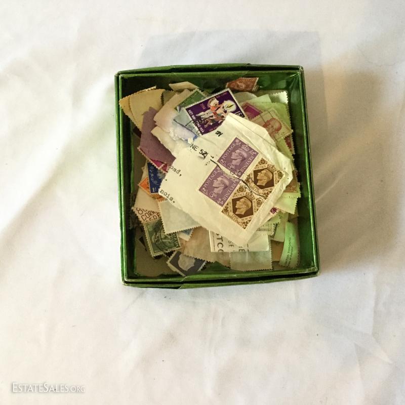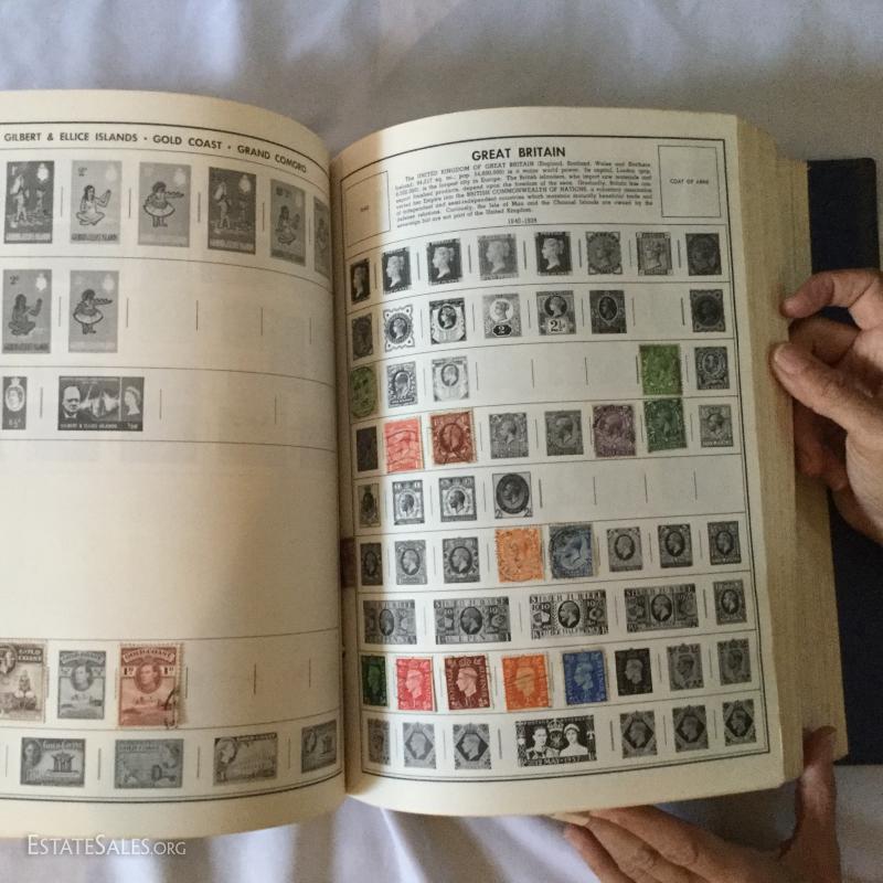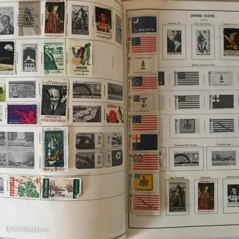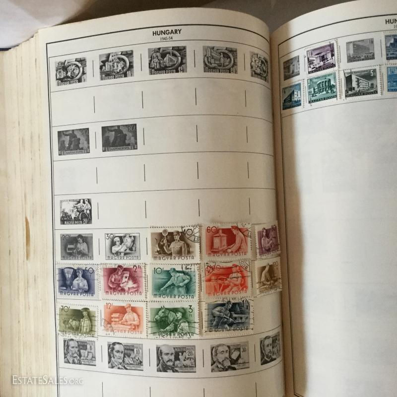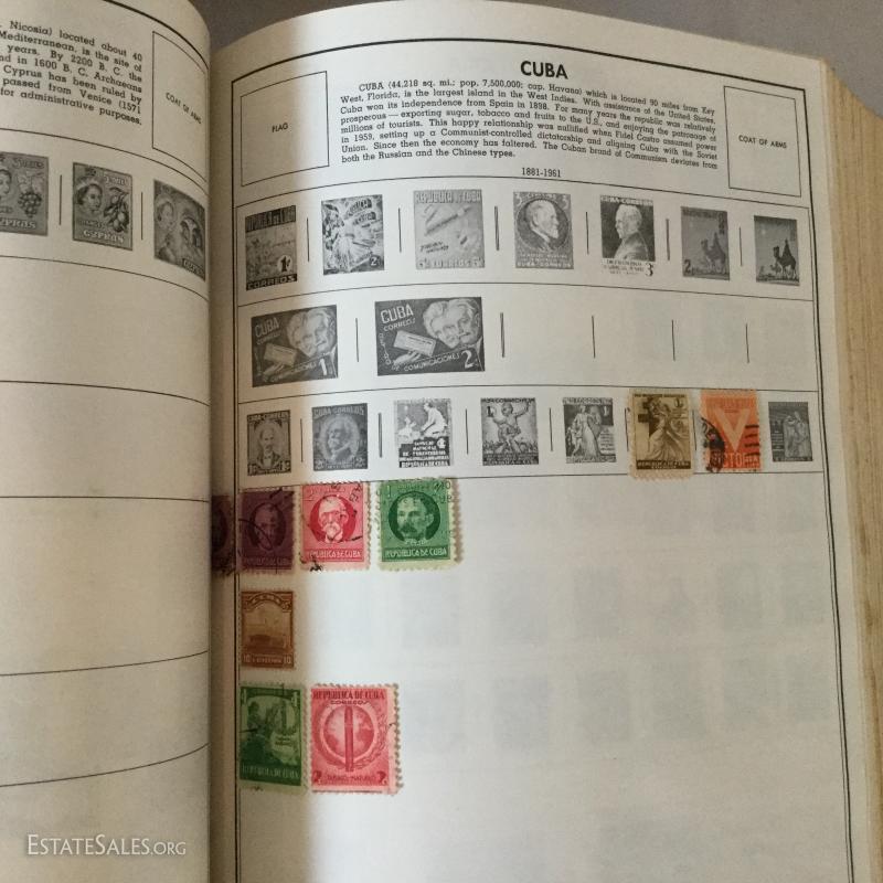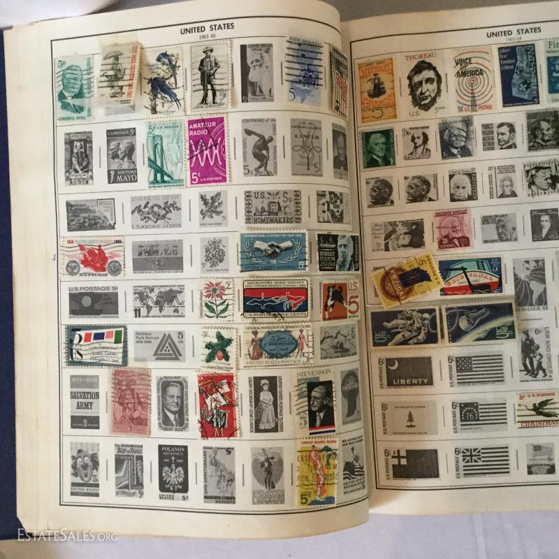 Lot of collectible stamps includes two books and a small box of used international stamps. One book is "A Statesman Deluxe Stamp Album" and includes US and international stamps. The second book is "1940's Modern Postage Stamp Album" with few stamps included. Also included are a set of First Day Issue Postal People Stamps, several vintage travel brochures, maps, and a 1934 Chicago expo ticket.