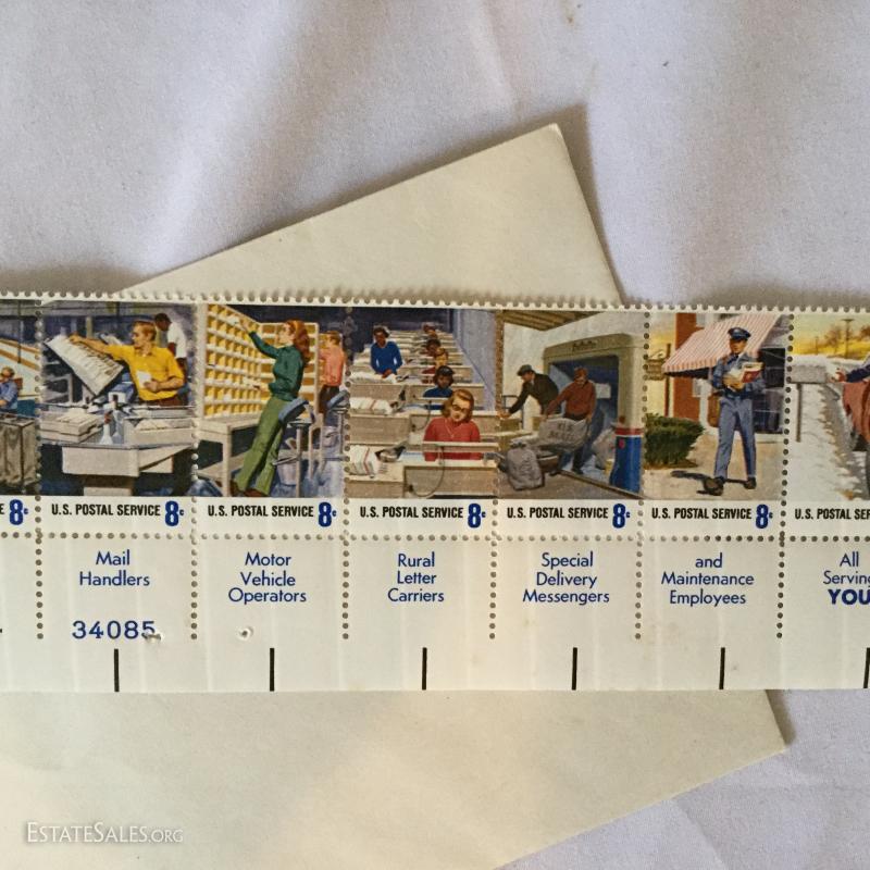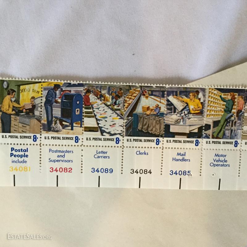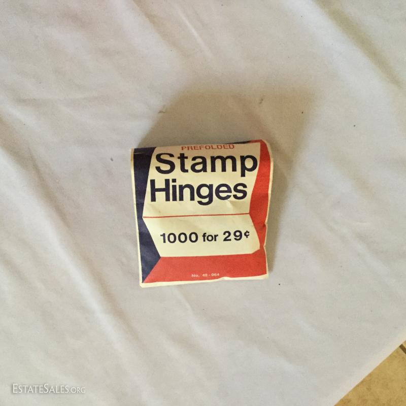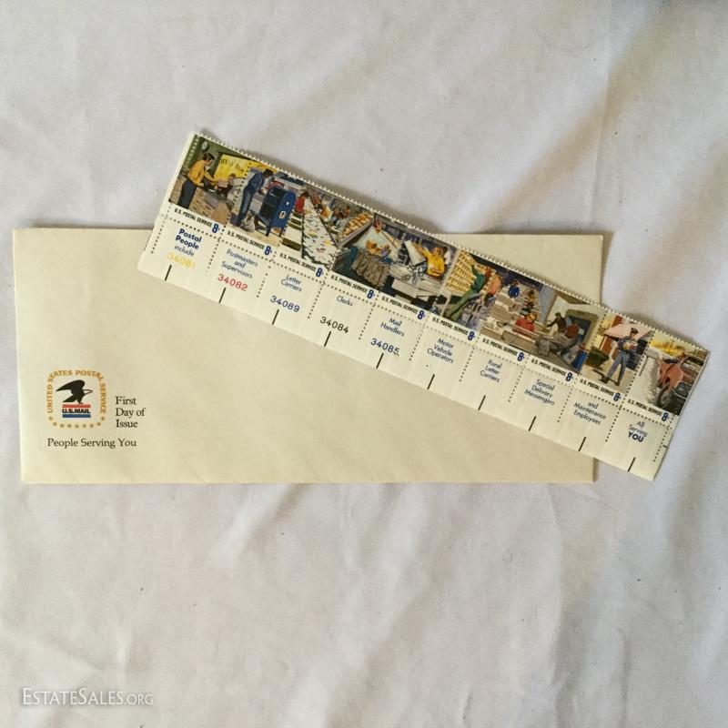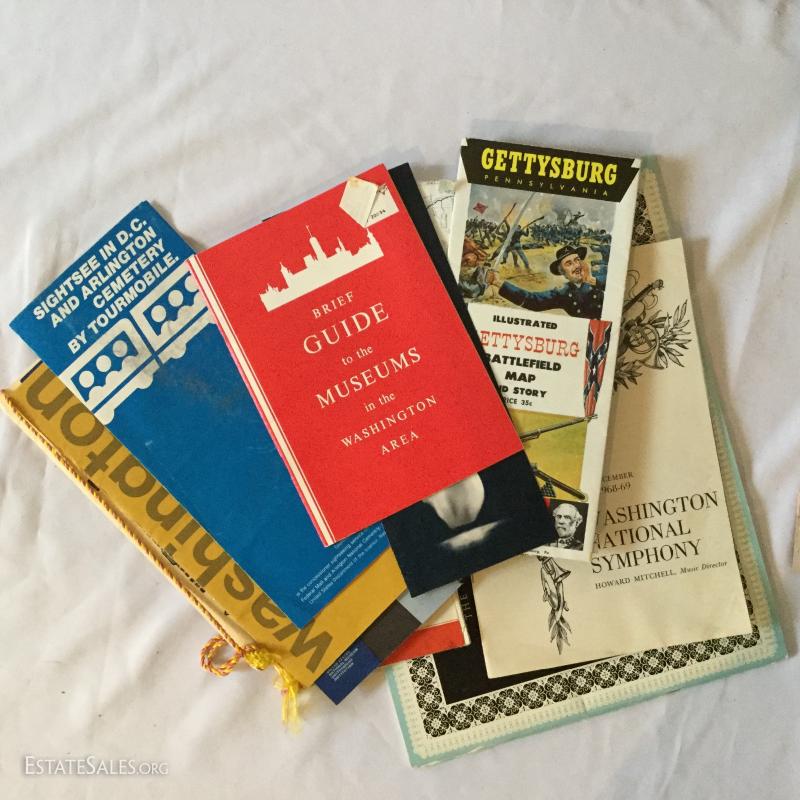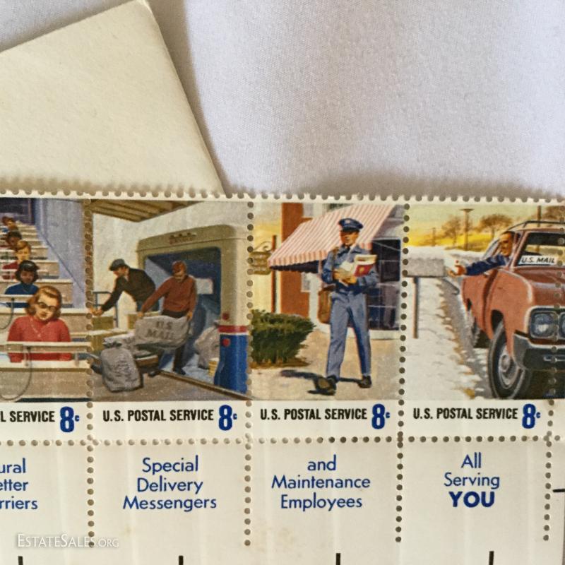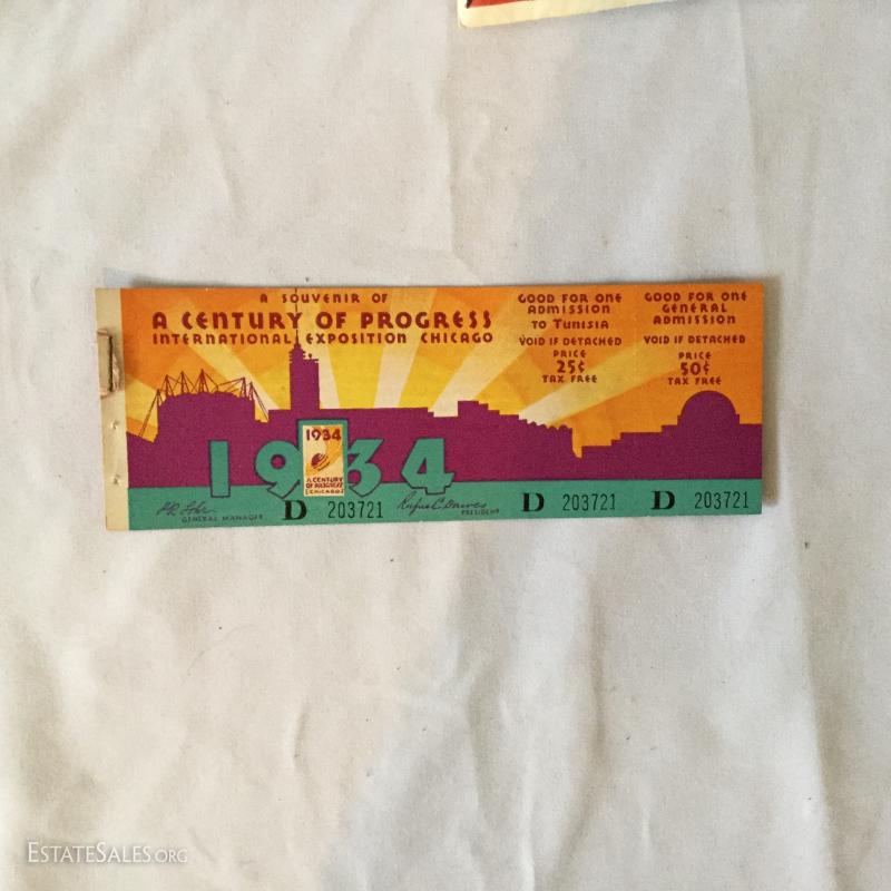 Lot of collectible stamps includes two books and a small box of used international stamps. One book is "A Statesman Deluxe Stamp Album" and includes US and international stamps. The second book is "1940's Modern Postage Stamp Album" with few stamps included. Also included are a set of First Day Issue Postal People Stamps, several vintage travel brochures, maps, and a 1934 Chicago expo ticket.