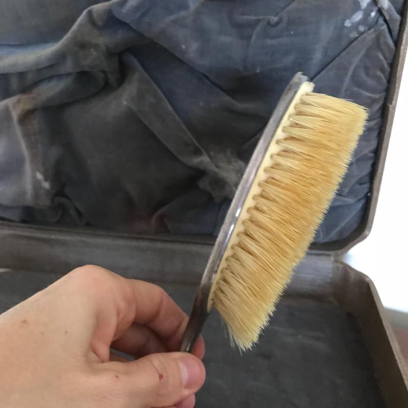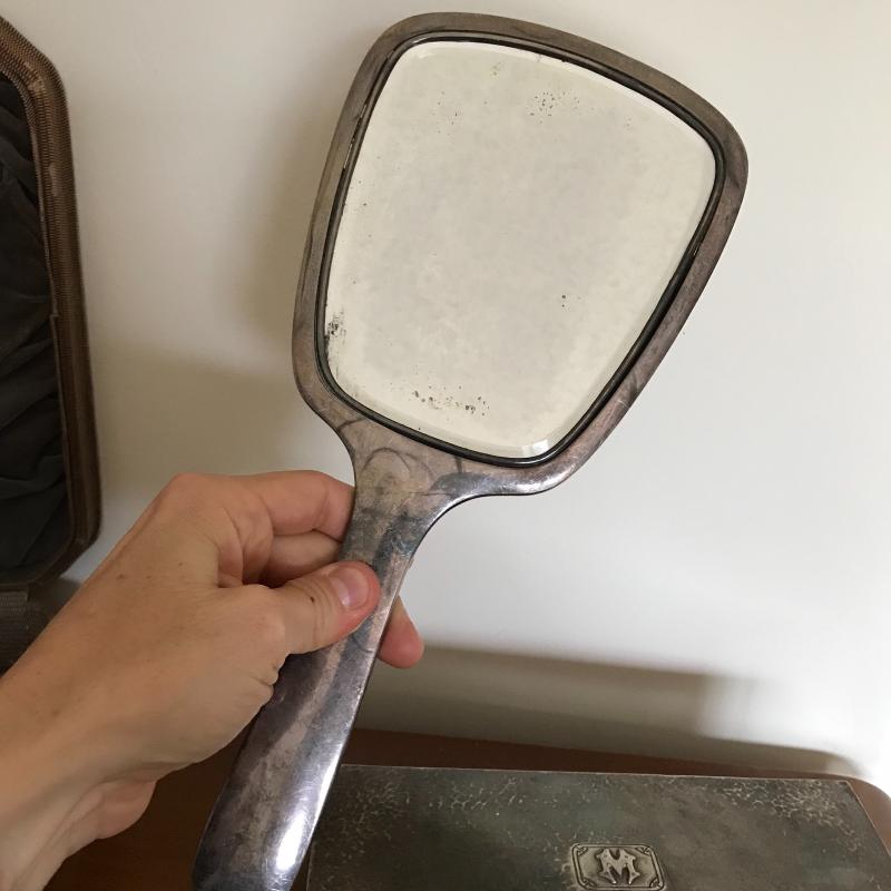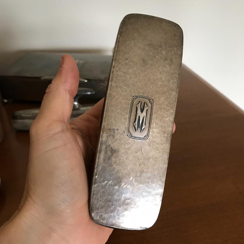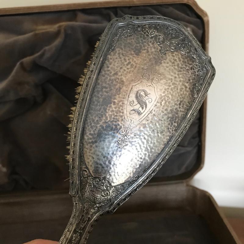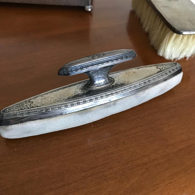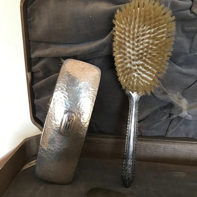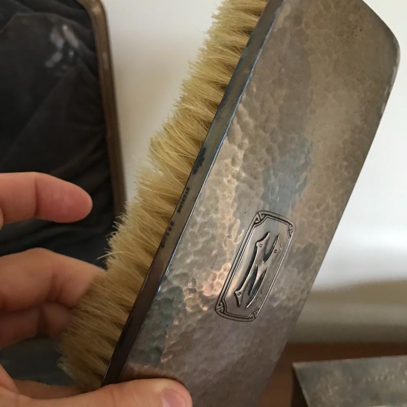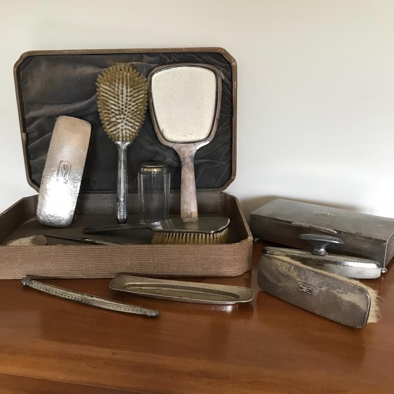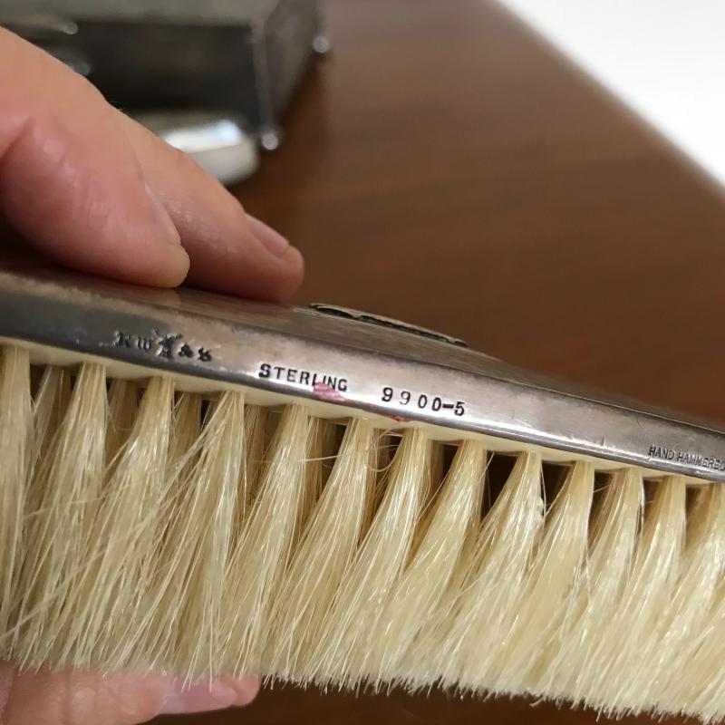 This Sterling vanity set includes for brushes of different sizes and styles, a jewelry box, a buffer, a nail file, a tray, a lid, a hand mirror, a powder jar, and two pieces that appear to be from combs. Shipping available.