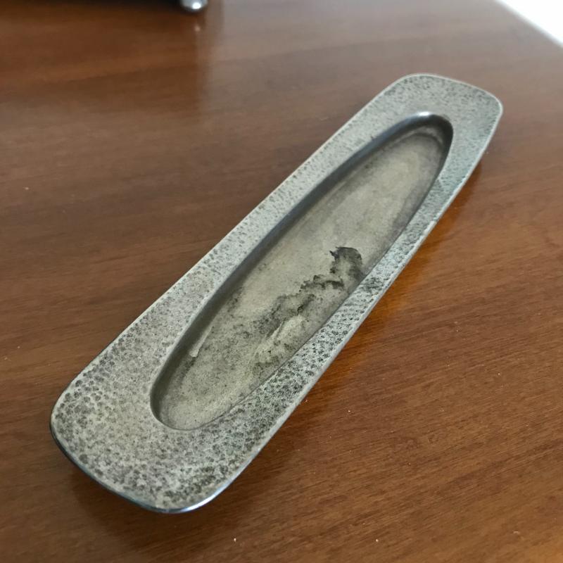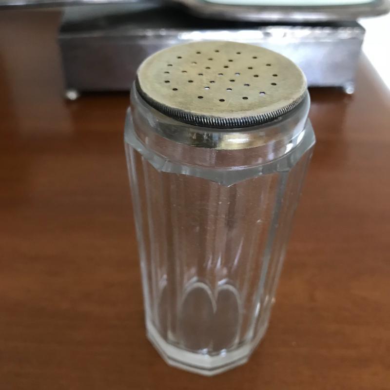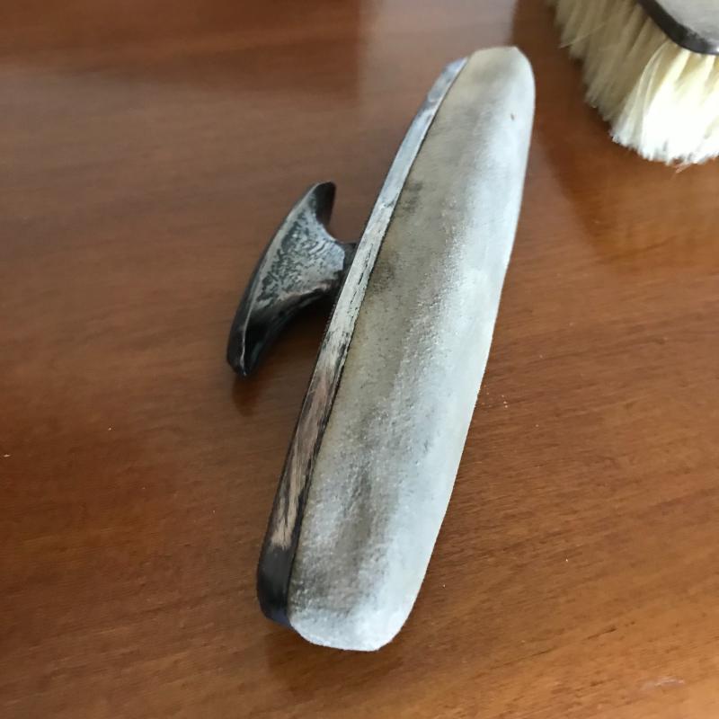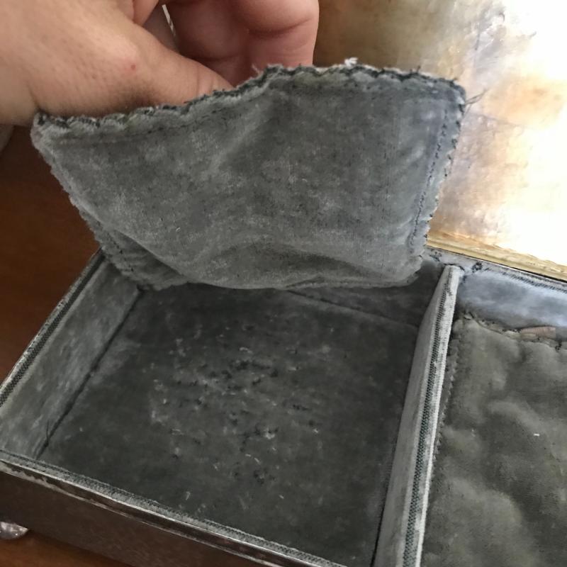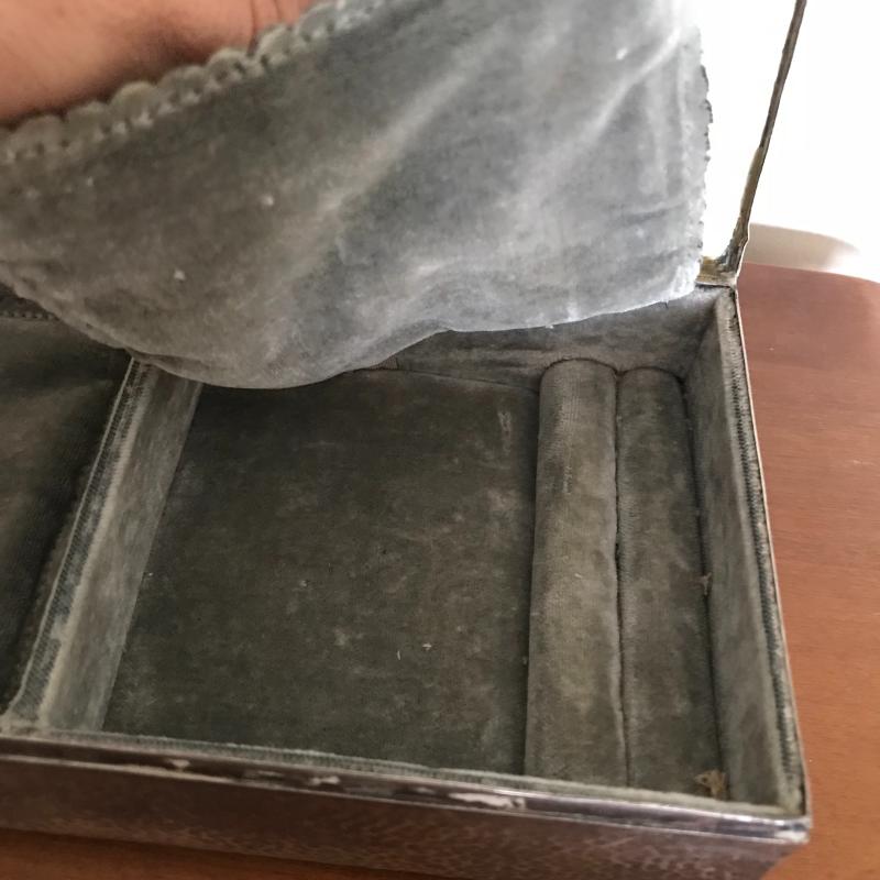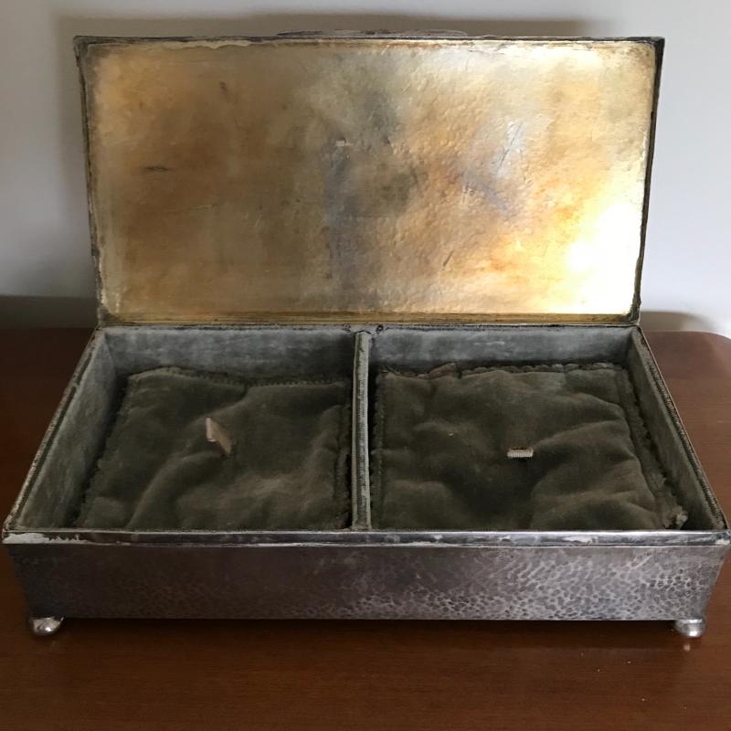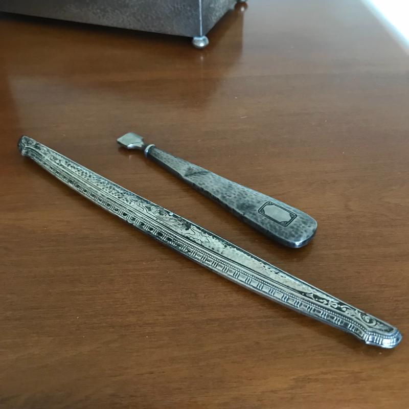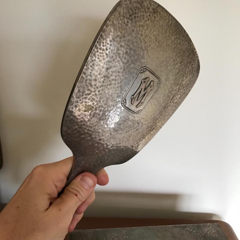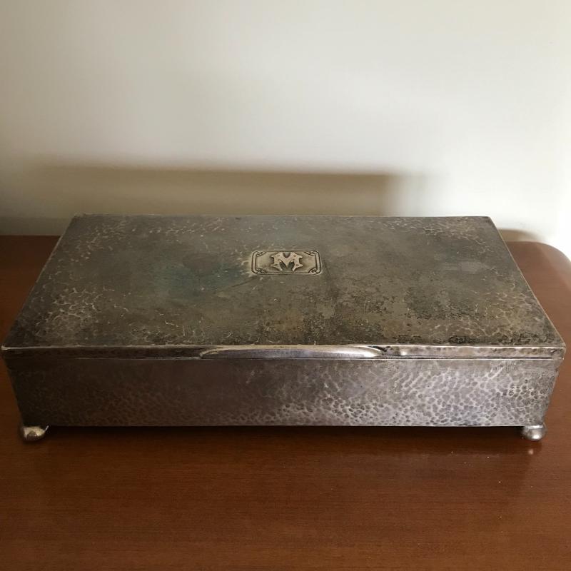 This Sterling vanity set includes for brushes of different sizes and styles, a jewelry box, a buffer, a nail file, a tray, a lid, a hand mirror, a powder jar, and two pieces that appear to be from combs. Shipping available.