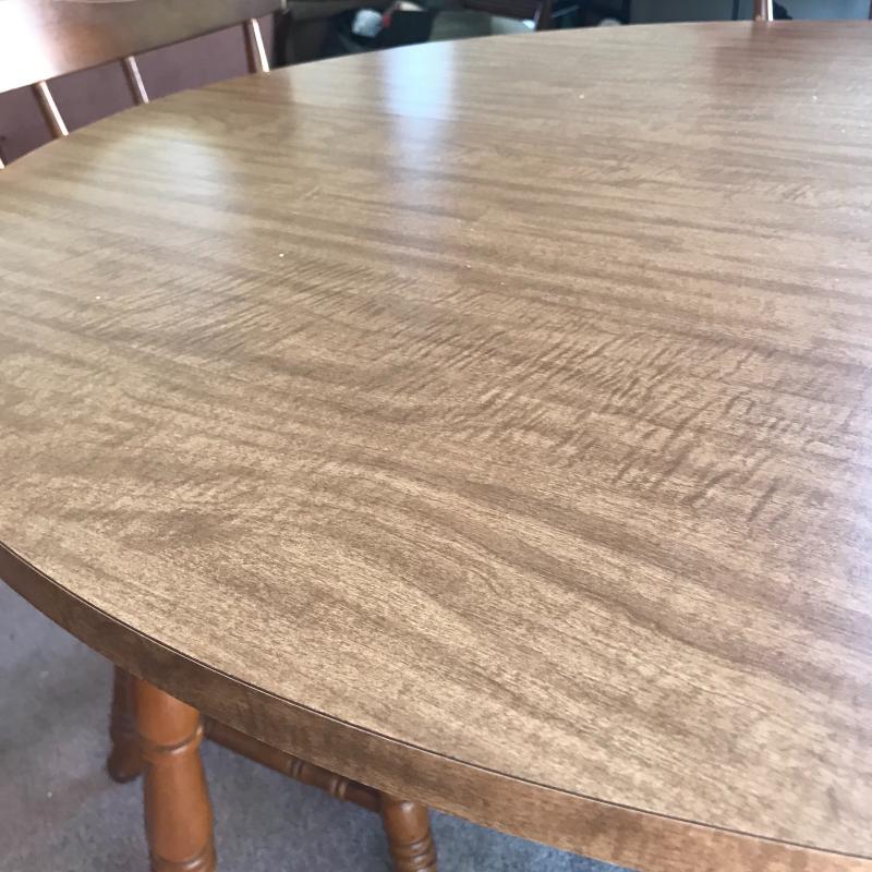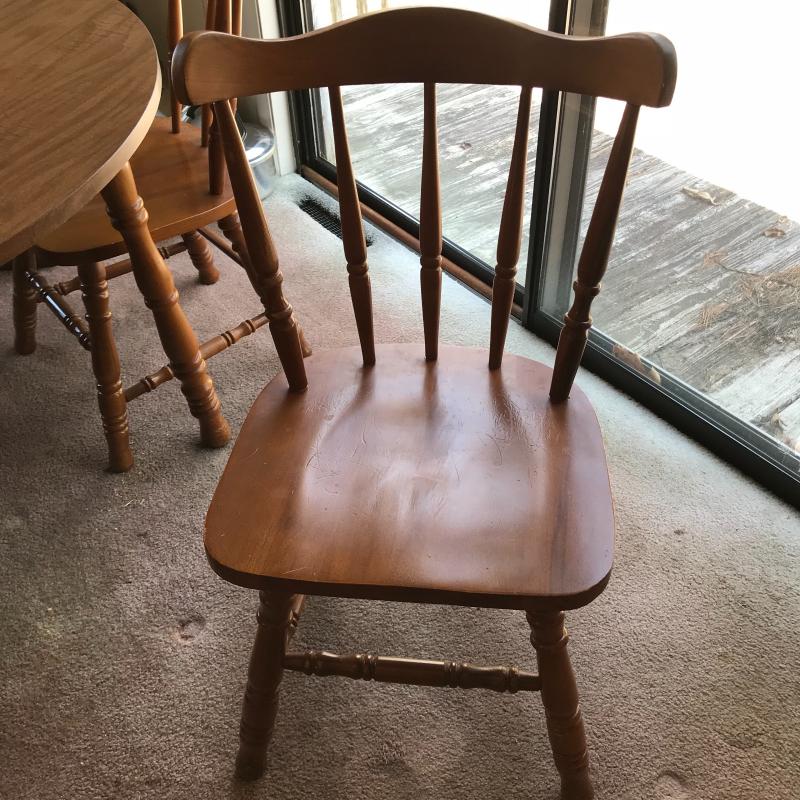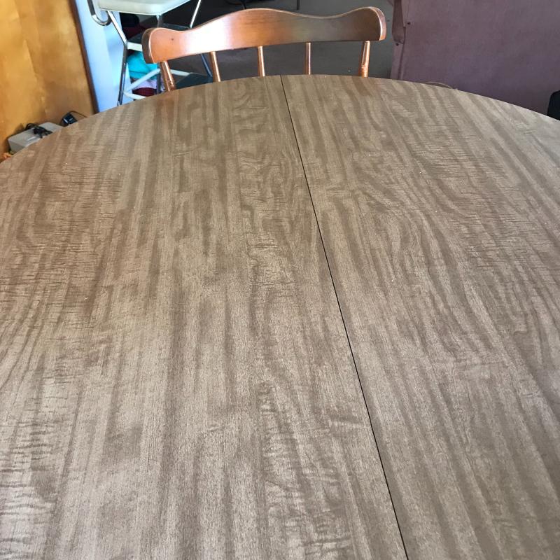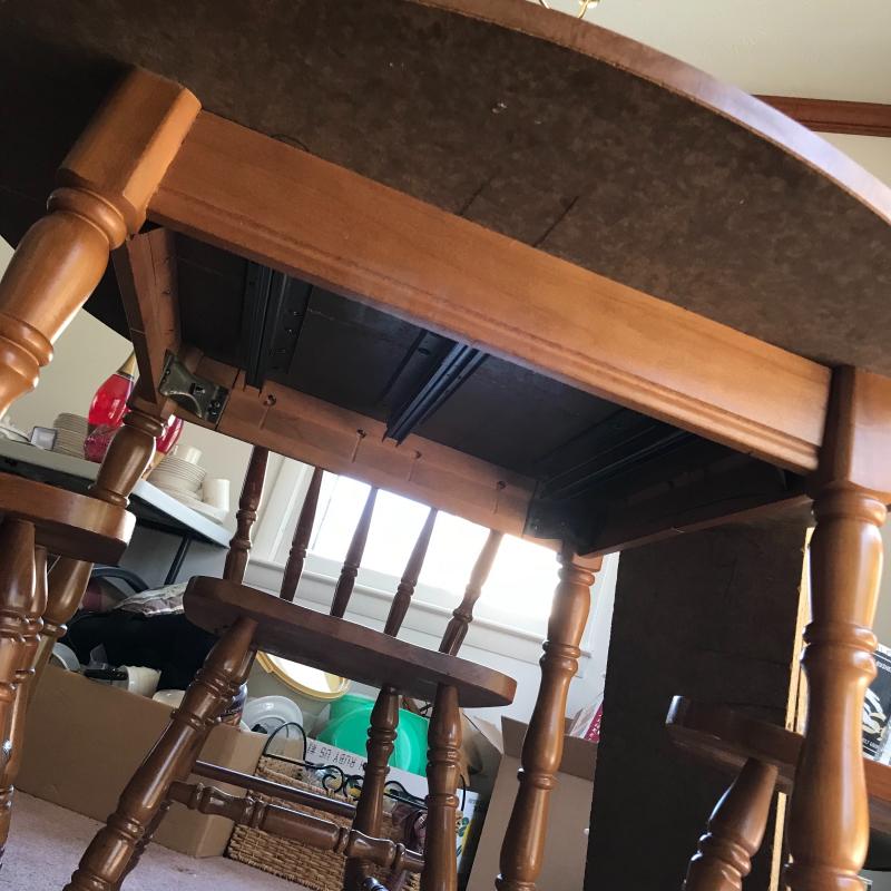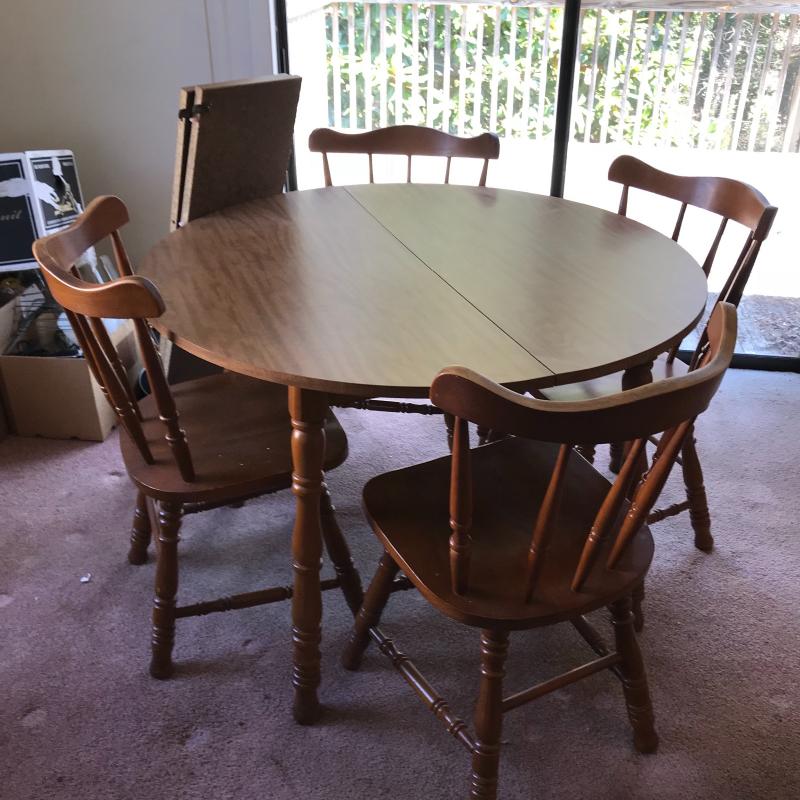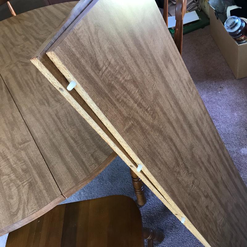 Table with two leaves and four chairs. Table made of particle board, but sturdy and in good shape. Round table is 42"d. Each leave measures 42" x 11.5'. Chairs are wood. No shipping available. Local pickup only in Asheville, NC.
