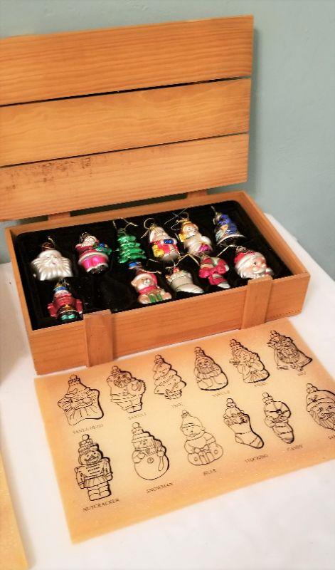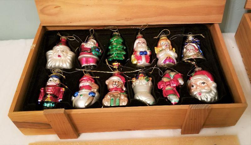There are two identical boxes of Christmas ornaments here - Thomas Pacconi (QVC - expensive). One box is missing the Snowman ornament. Good used condition. You get both boxes. One box has 12 ornaments - the other has 11. Each crate/box measures 14.25" x 8.75".