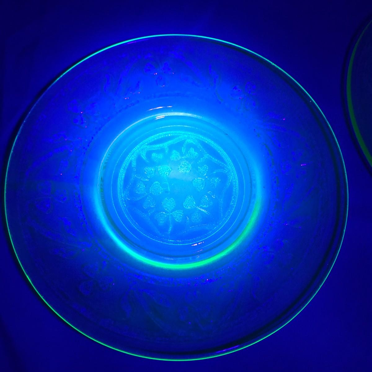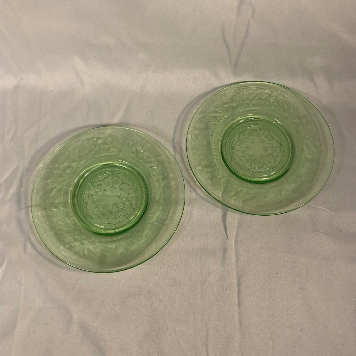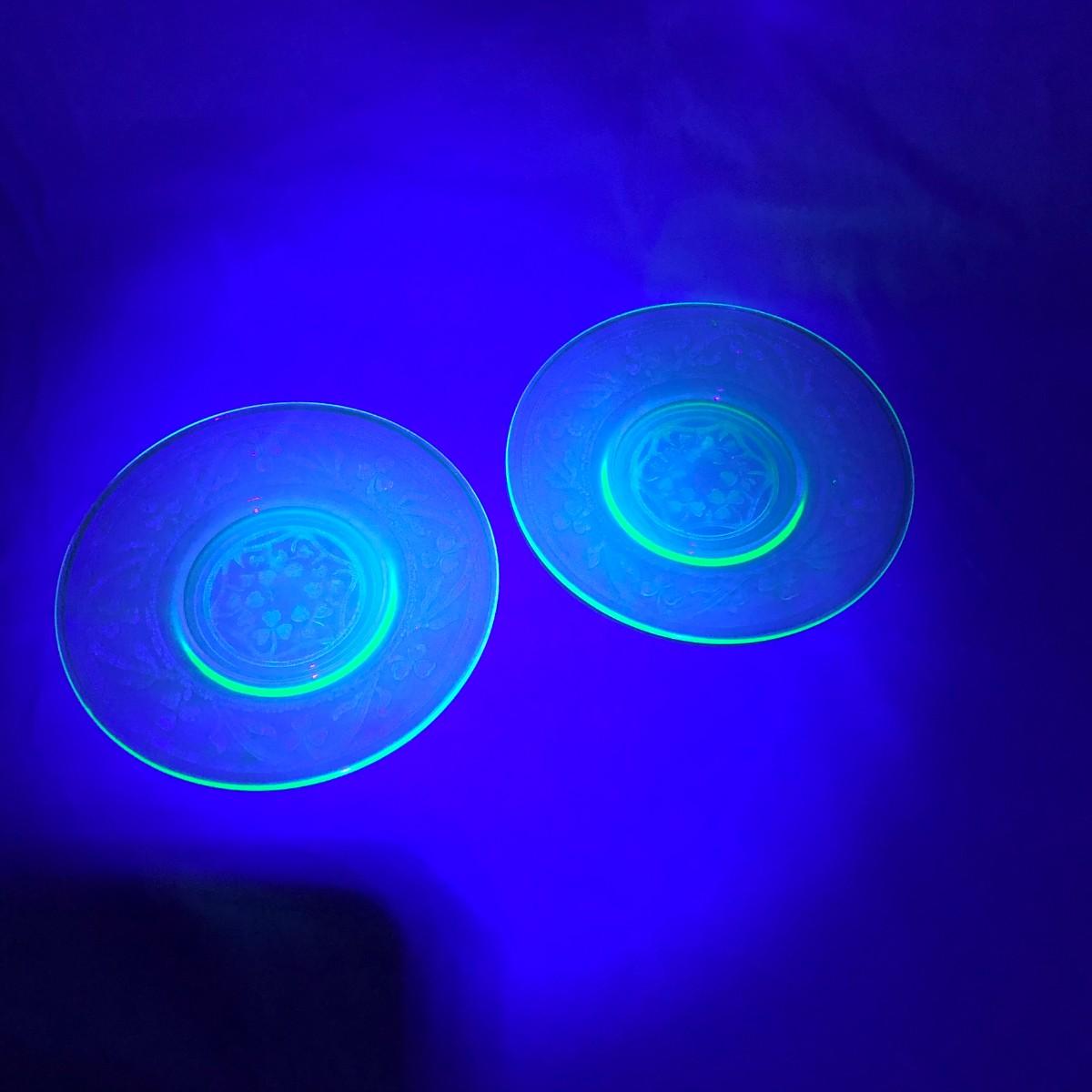 These two saucers are in excellent condition and about 6" in diameter each. They were made by Hazel Atlas between 1930-1936 and glow beautifully under a black light.