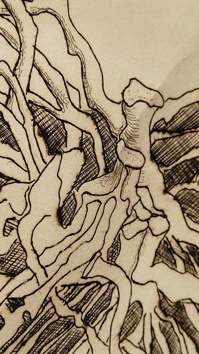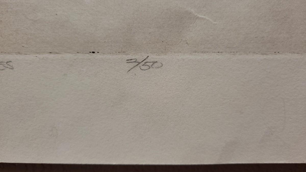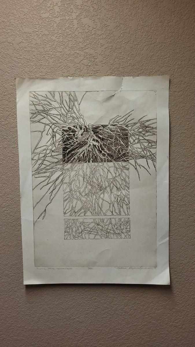 Is this lot features an original artwork creation is creation signed and numbered by Barbara by Barbara in 1975. 24.5" x 17.75". This numbered early edition (#2/50) called "Roots and Rectangles" does show a 2" rip at the top and some creases that actually only add to the chaotic path of roots depicted in this submission. Would benefit greatly by being framed an hung in a olive where it could be allowed to intrigue your visitors for years to come.