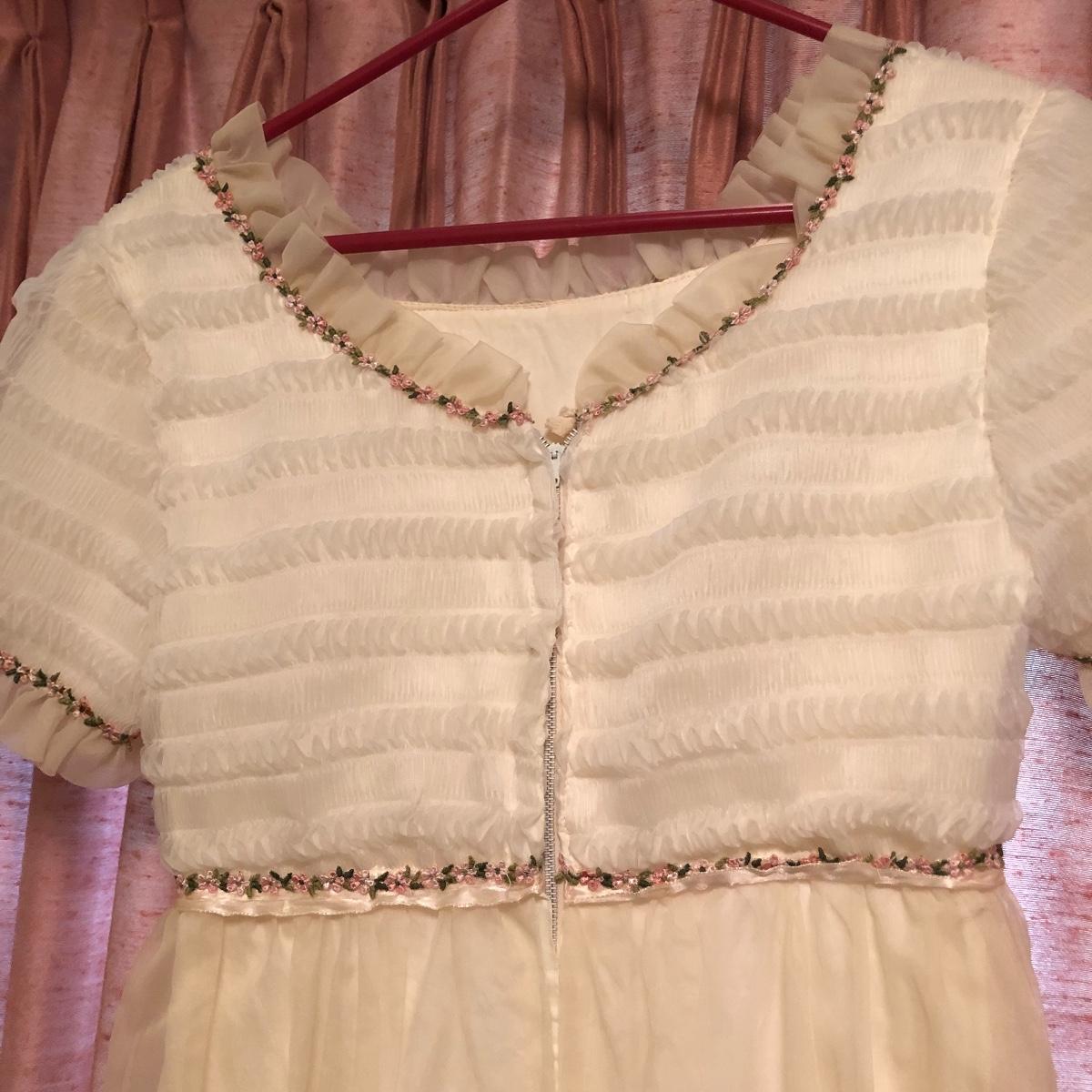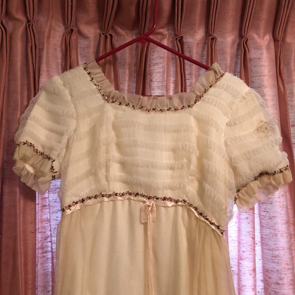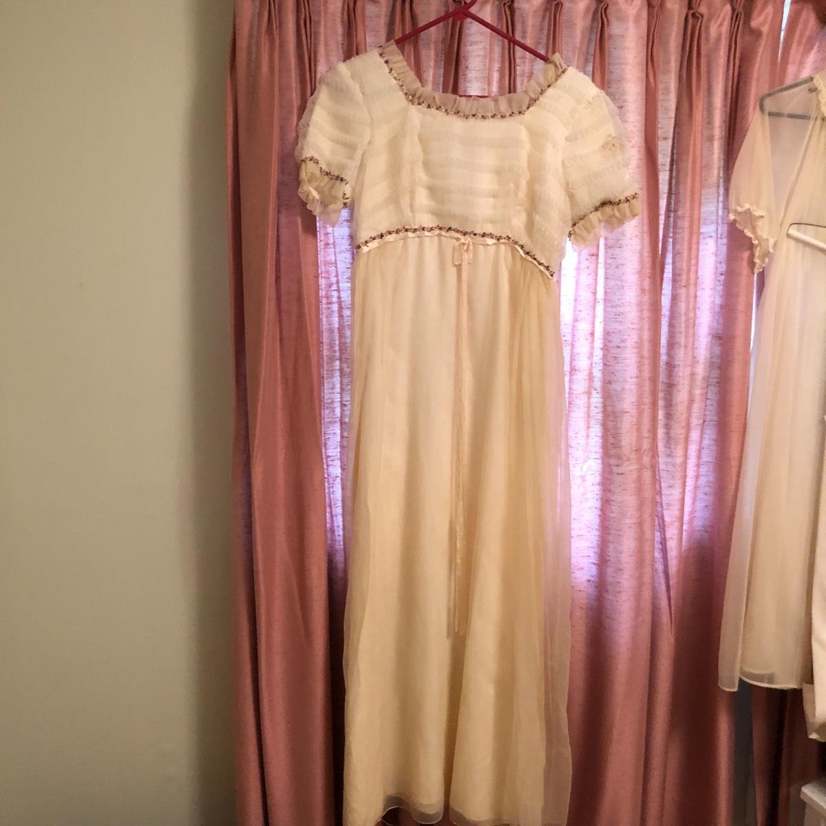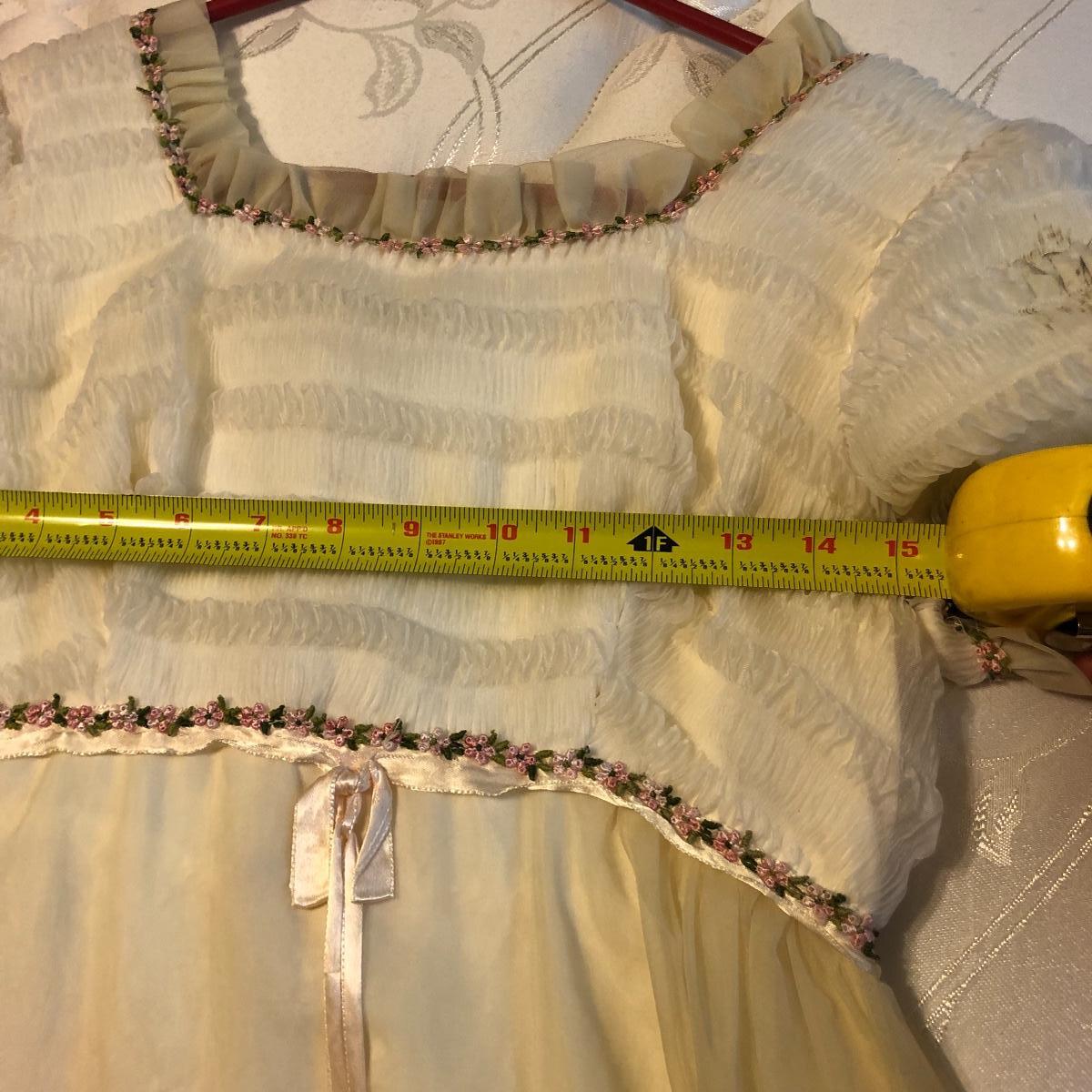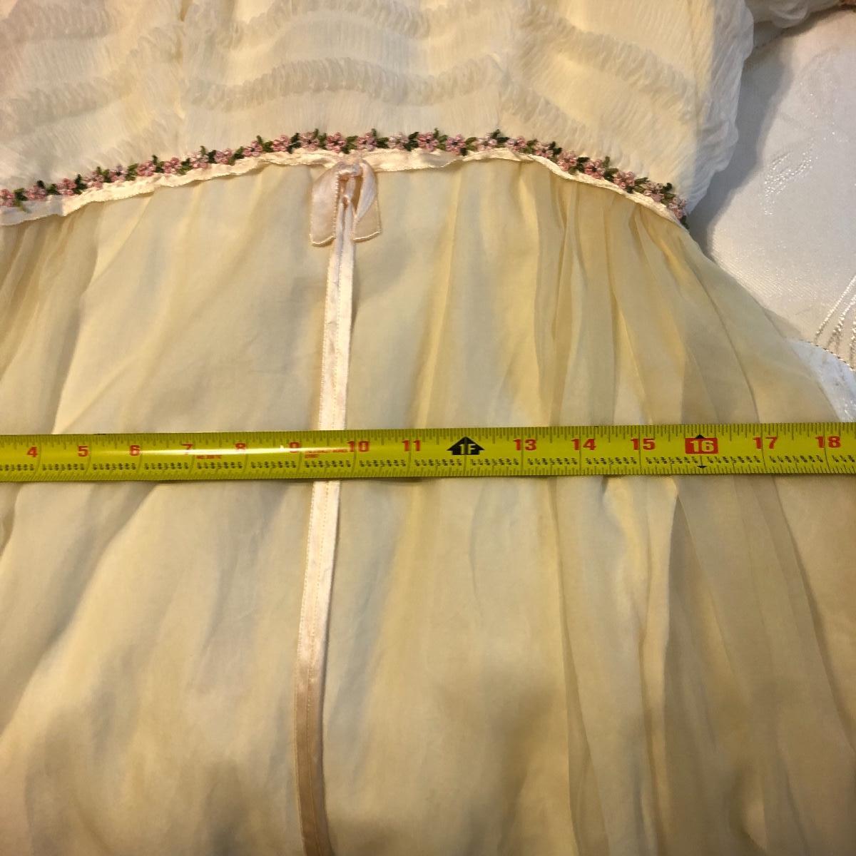 This vintage empire waist dress is exquisite with its ruffled white top section with dainty pink silk flowers and ruffled cuffs with an ivory toile layered skirt section (measurements are in images). Also included is a gorgeous spaghetti strap nightdress and more vintage sleepwear. Also included are five padded hangers and some shoe trees.