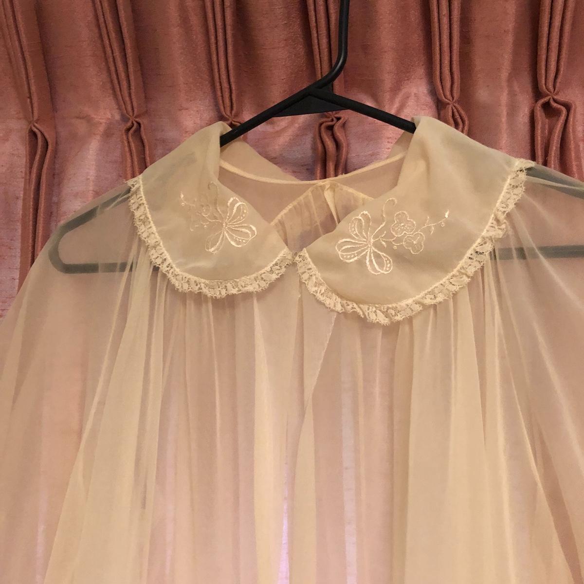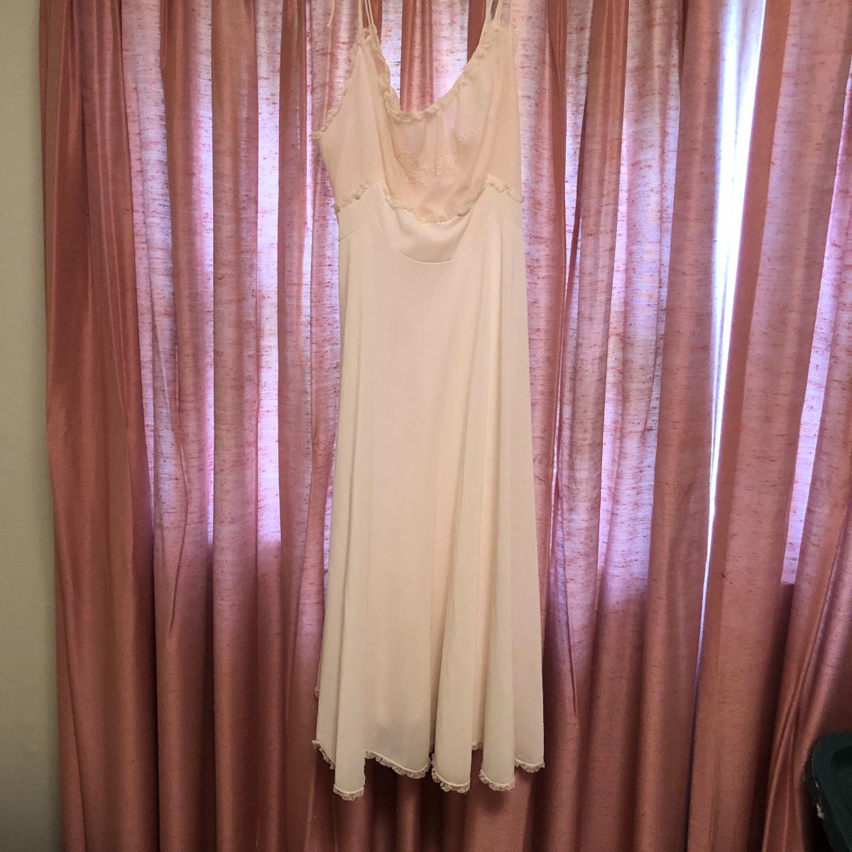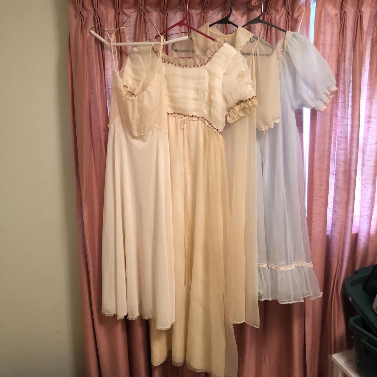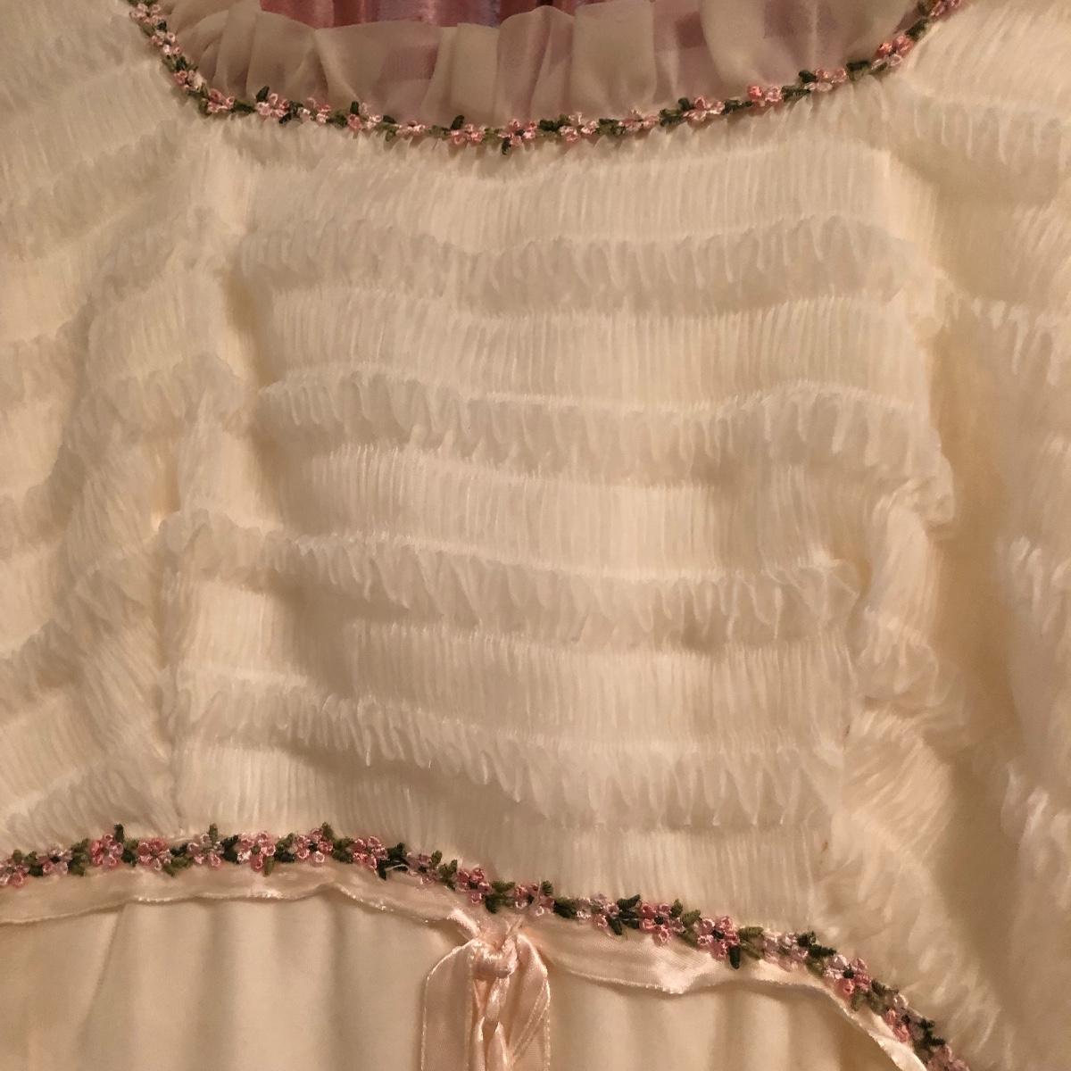 This vintage empire waist dress is exquisite with its ruffled white top section with dainty pink silk flowers and ruffled cuffs with an ivory toile layered skirt section (measurements are in images). Also included is a gorgeous spaghetti strap nightdress and more vintage sleepwear. Also included are five padded hangers and some shoe trees.