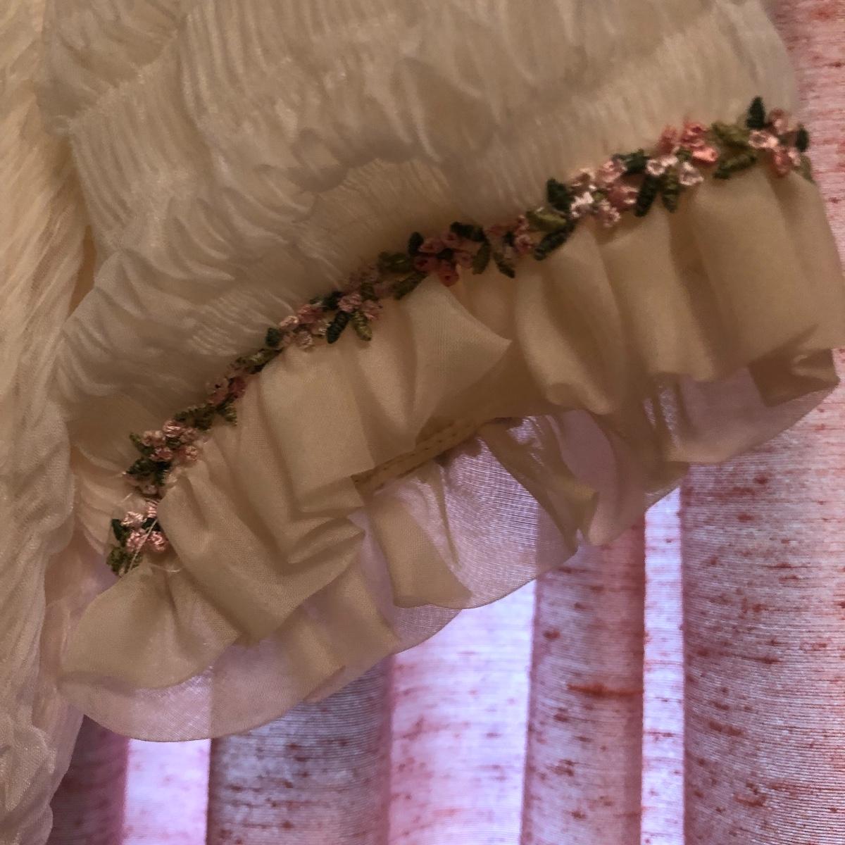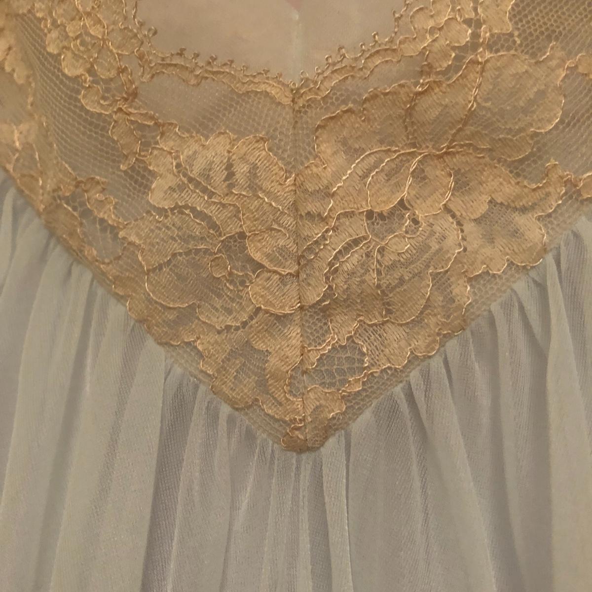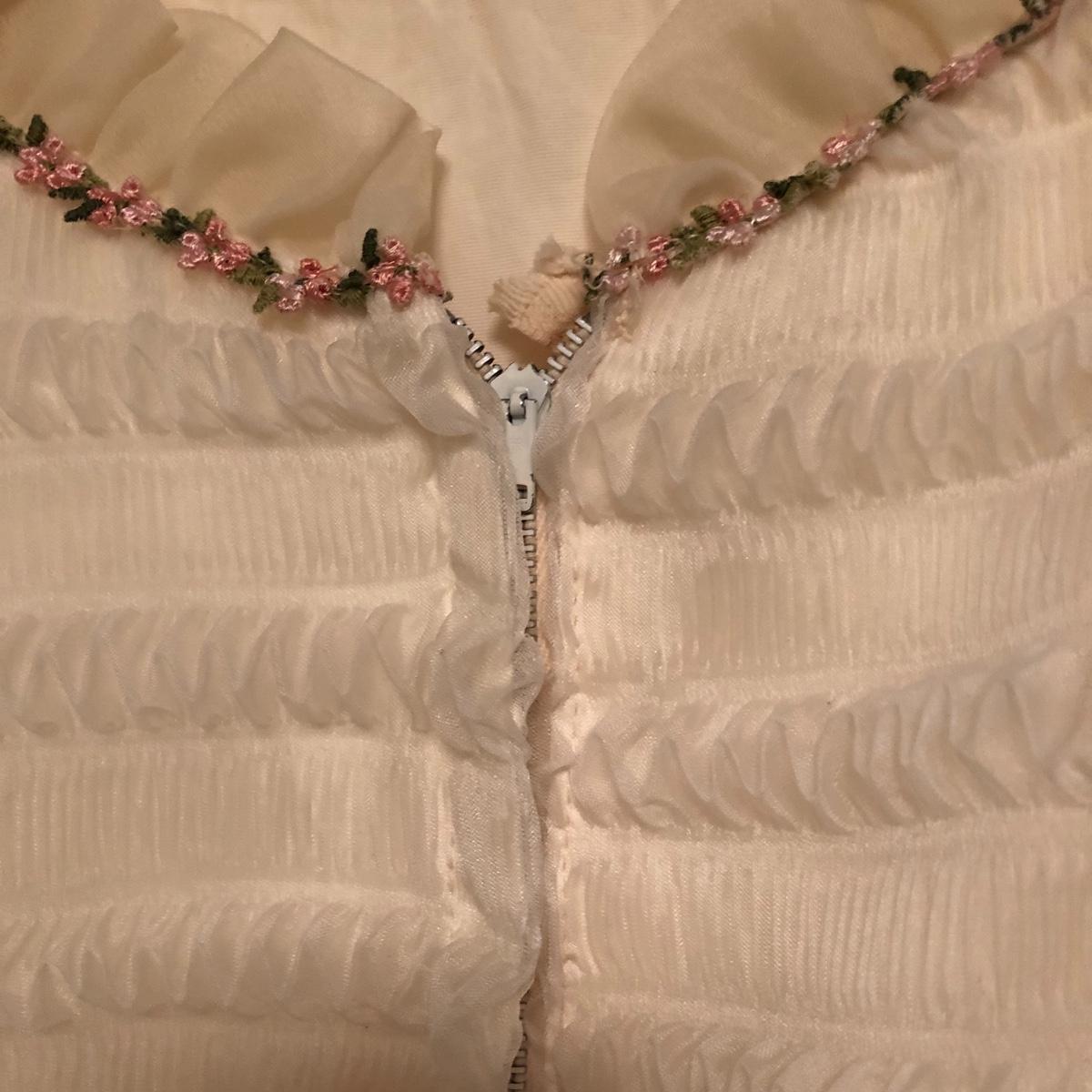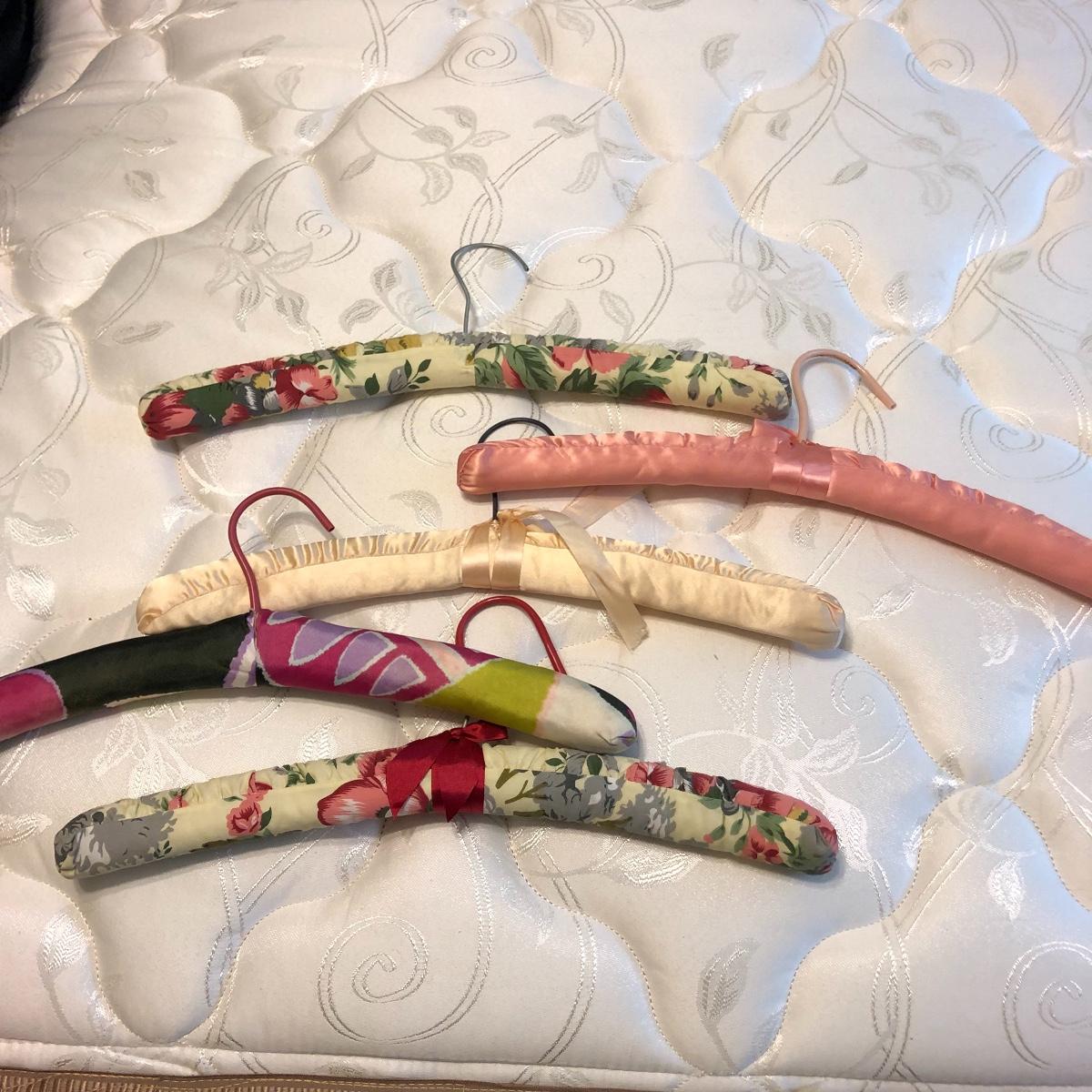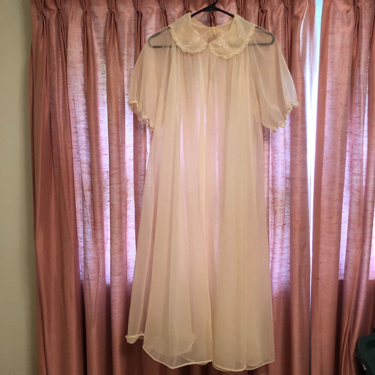 This vintage empire waist dress is exquisite with its ruffled white top section with dainty pink silk flowers and ruffled cuffs with an ivory toile layered skirt section (measurements are in images). Also included is a gorgeous spaghetti strap nightdress and more vintage sleepwear. Also included are five padded hangers and some shoe trees.