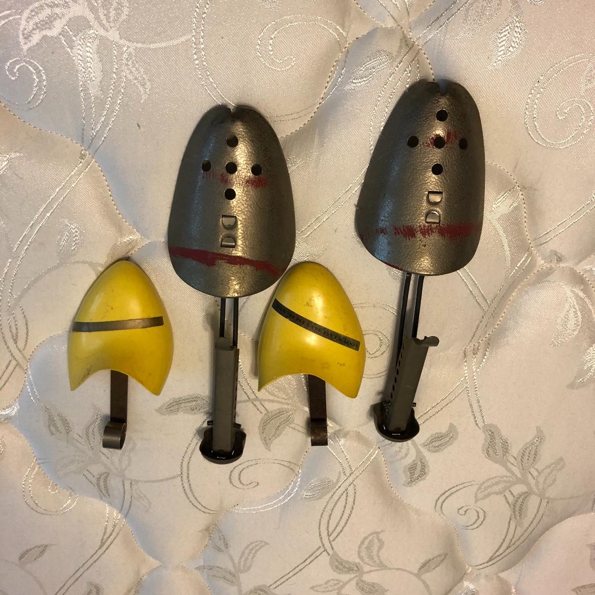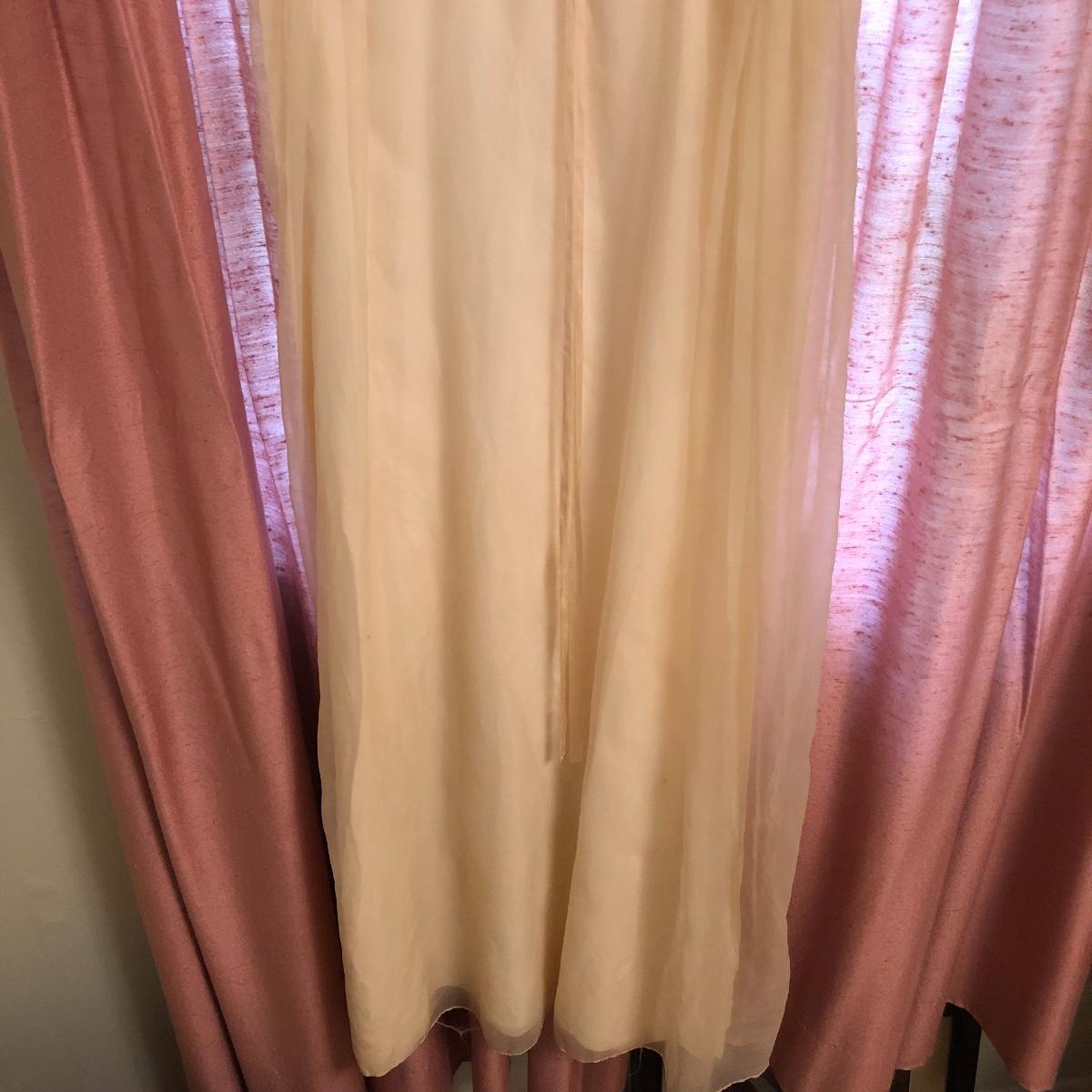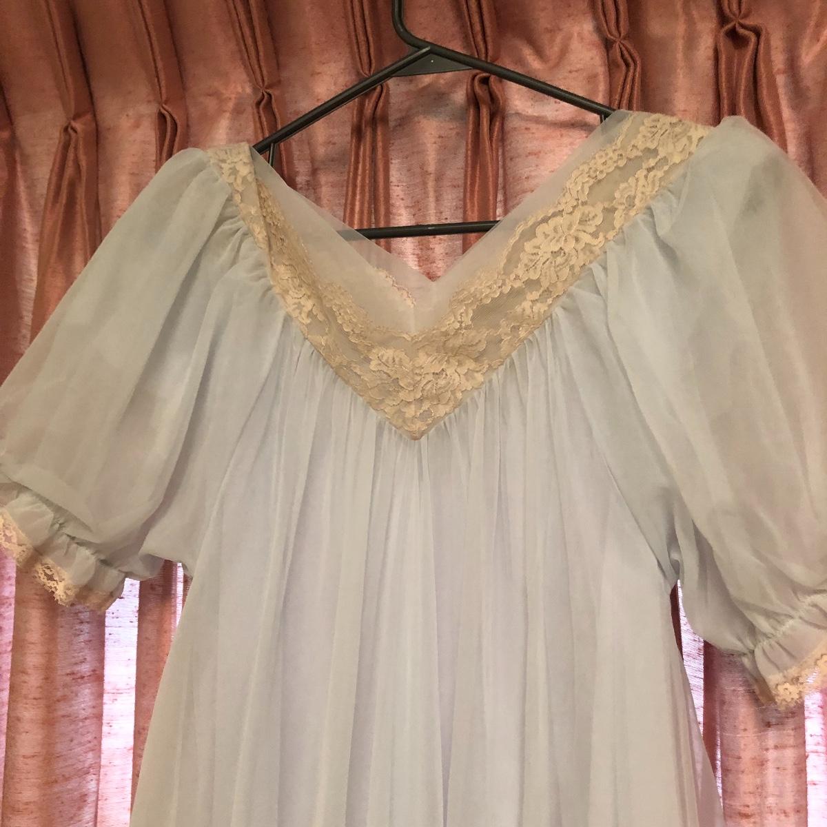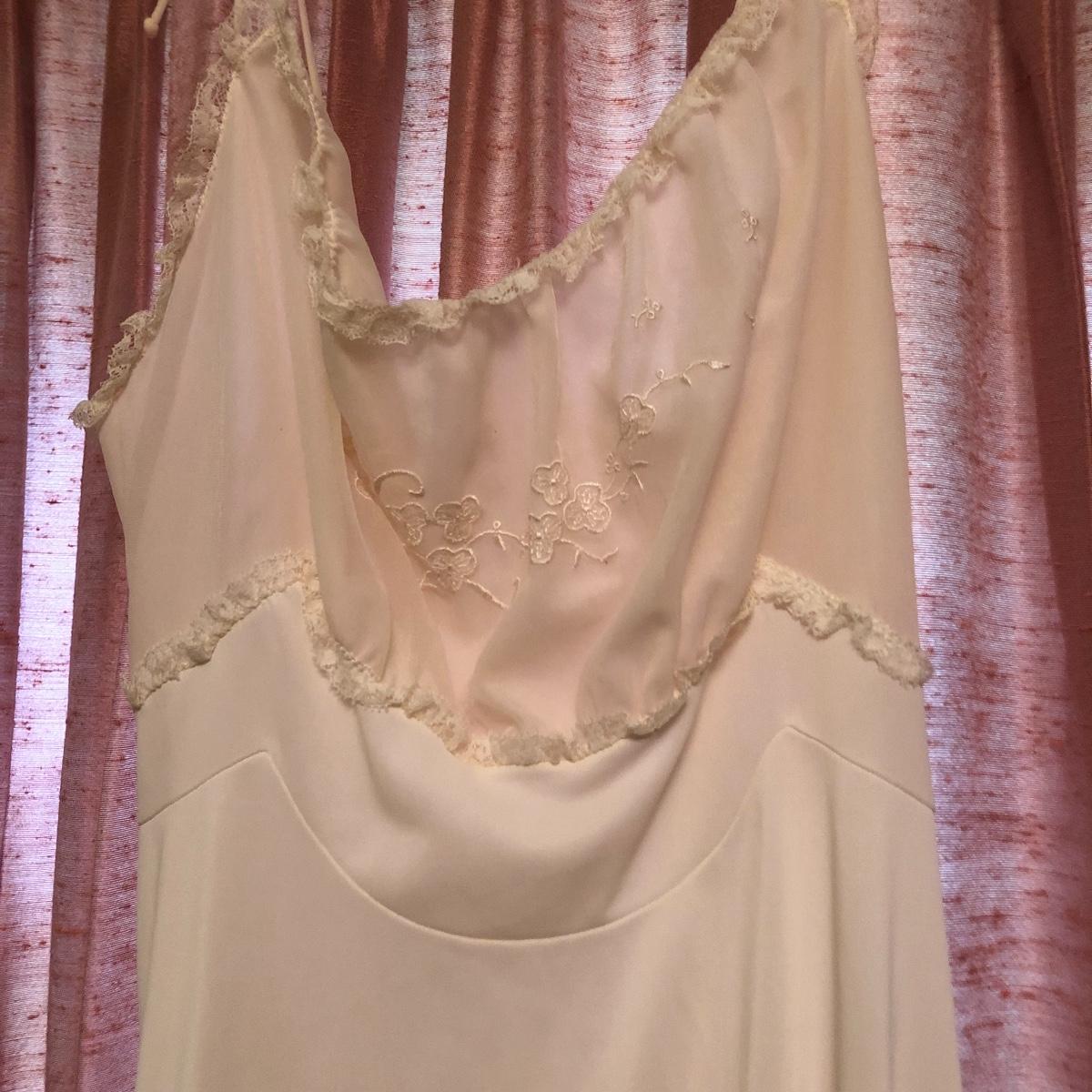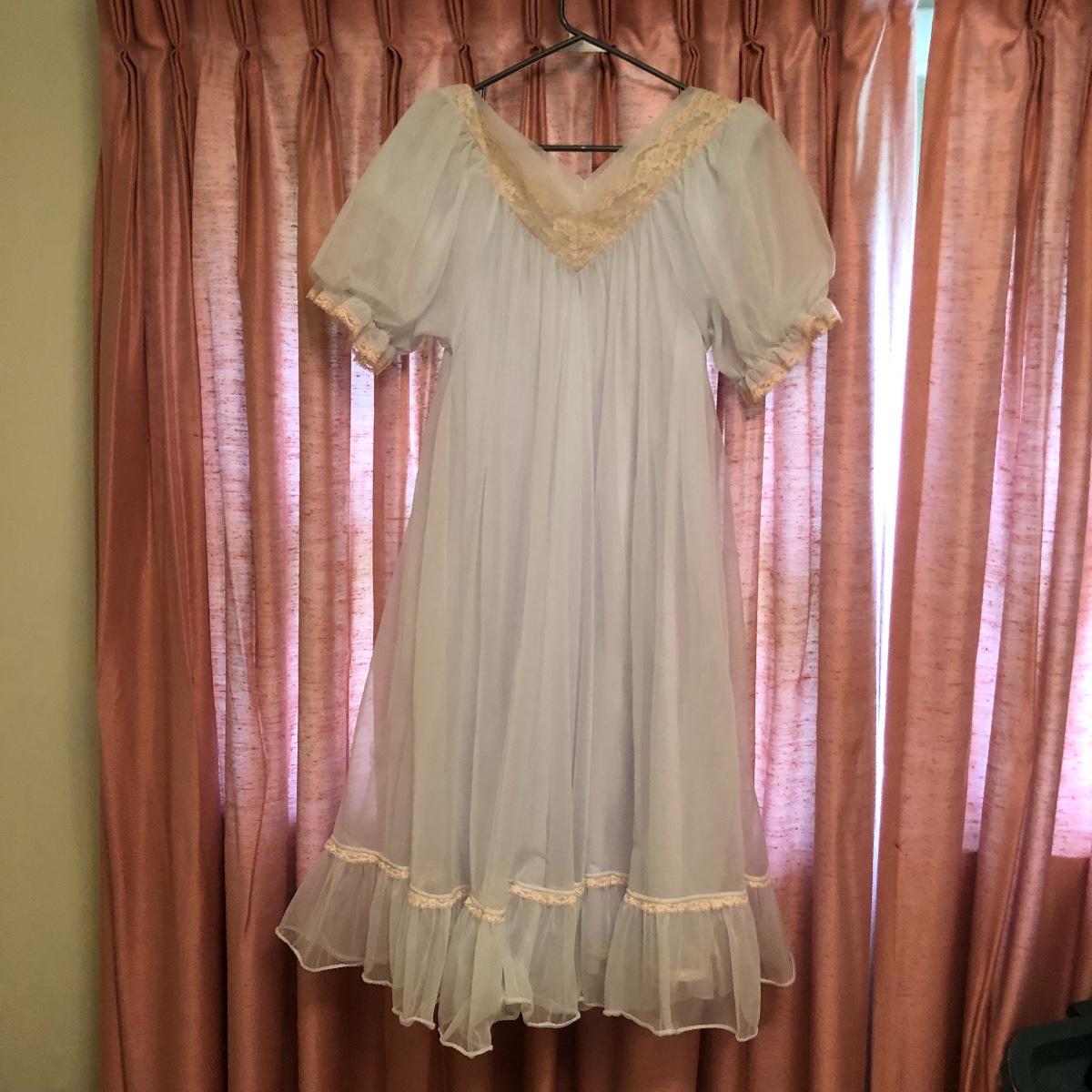 This vintage empire waist dress is exquisite with its ruffled white top section with dainty pink silk flowers and ruffled cuffs with an ivory toile layered skirt section (measurements are in images). Also included is a gorgeous spaghetti strap nightdress and more vintage sleepwear. Also included are five padded hangers and some shoe trees.