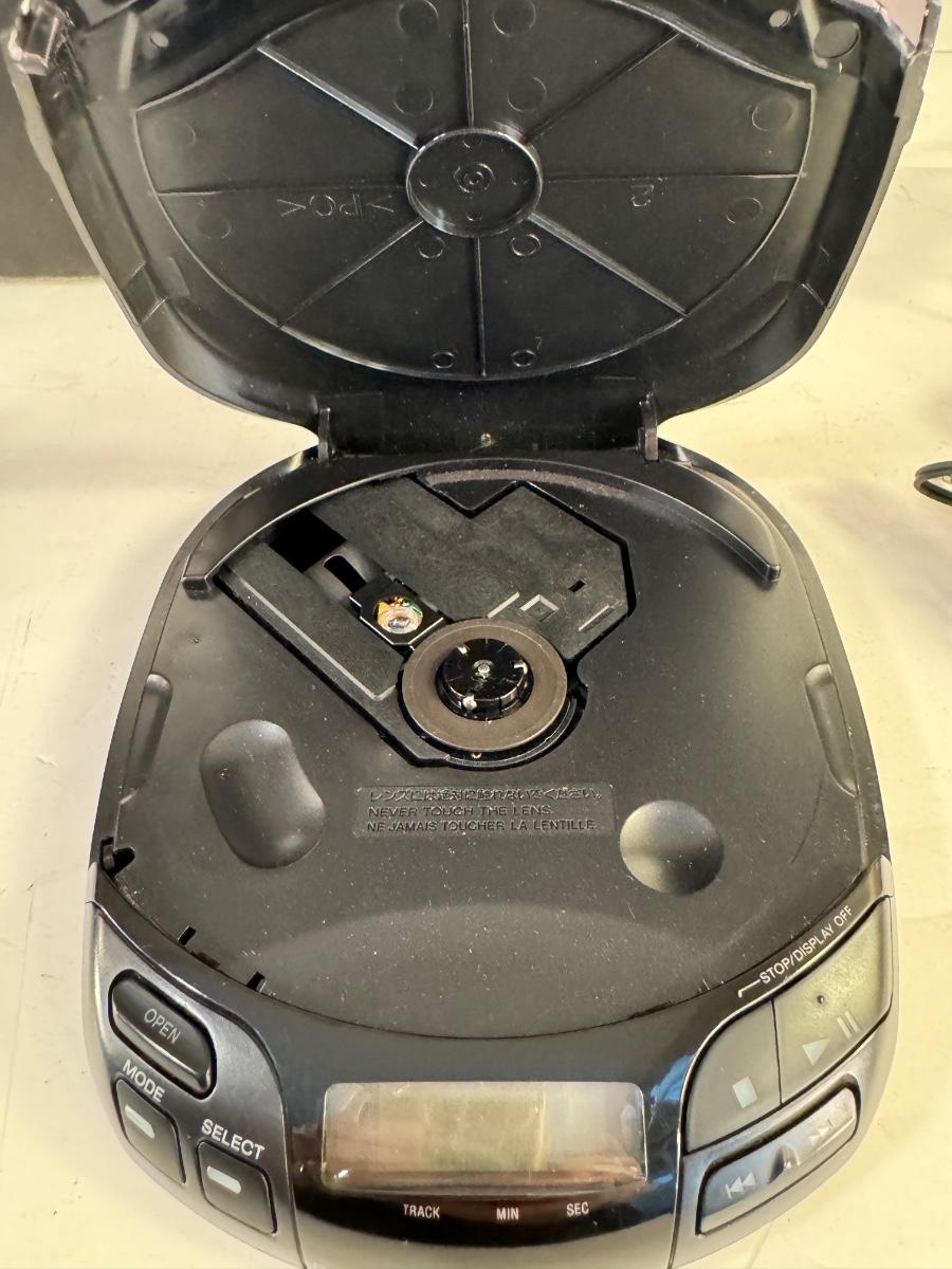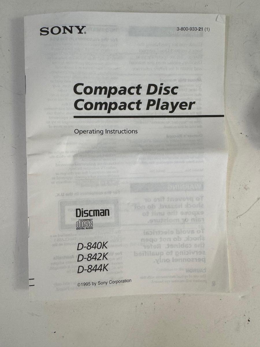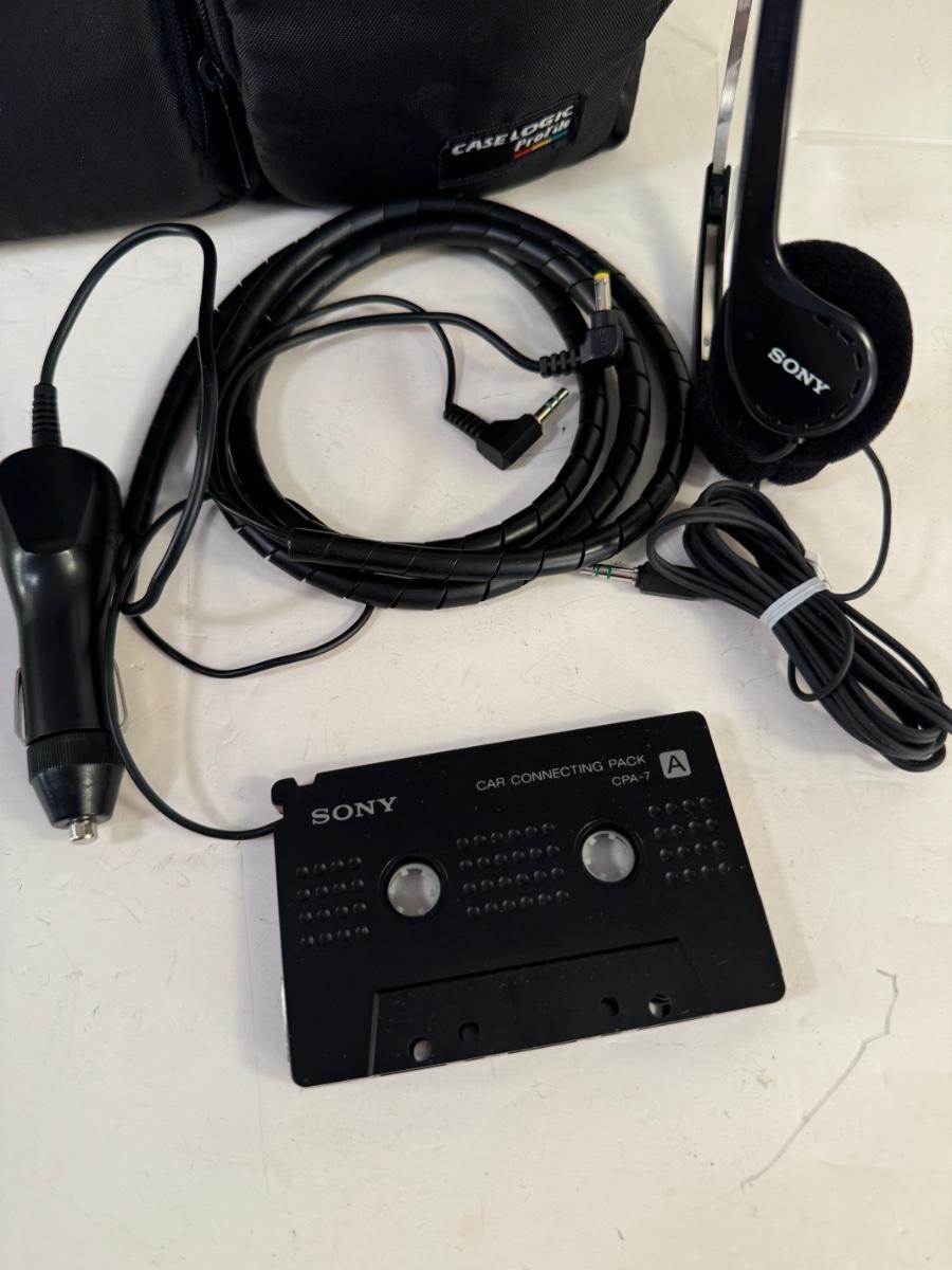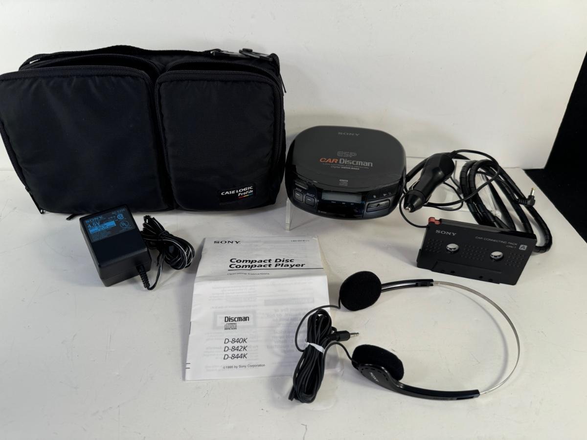 Includes Sony ESP CarDiscman Super Electronic Shock Protection digital Mega Bass CD player, headphones, car connecting pack, AC power adapter, instruction manual and carry case.