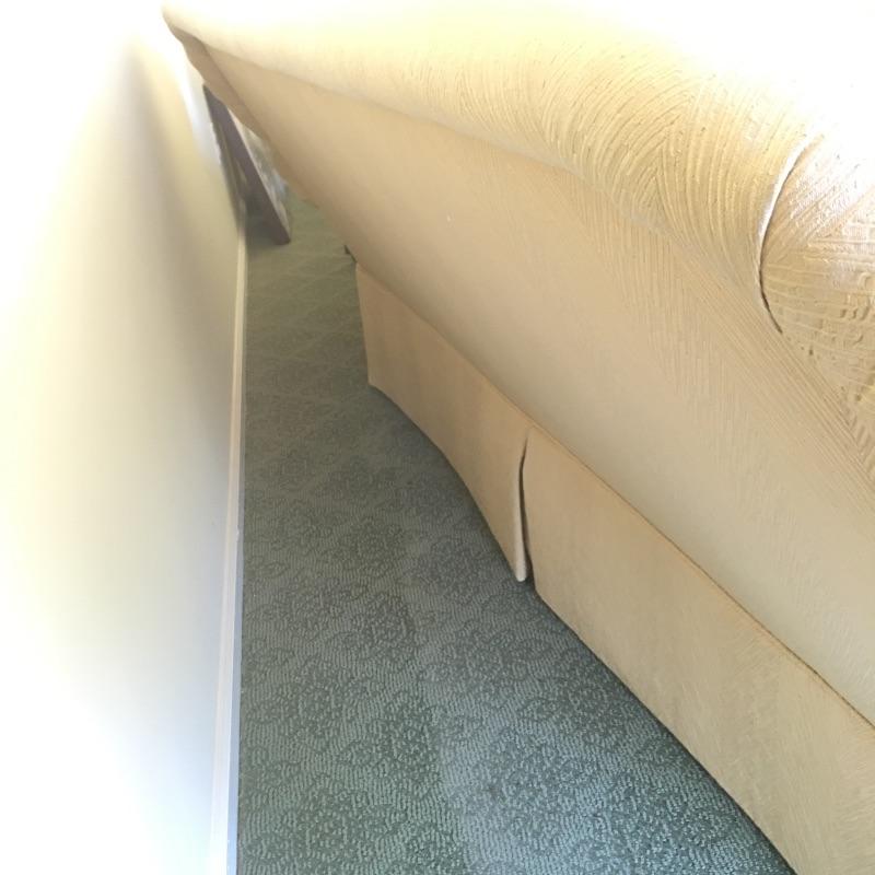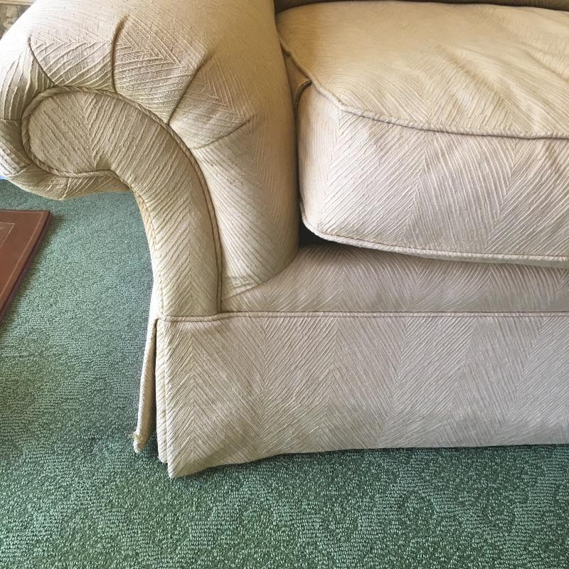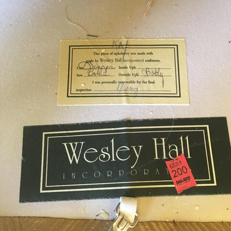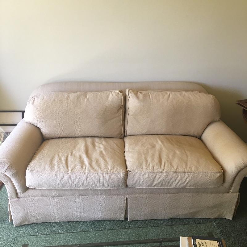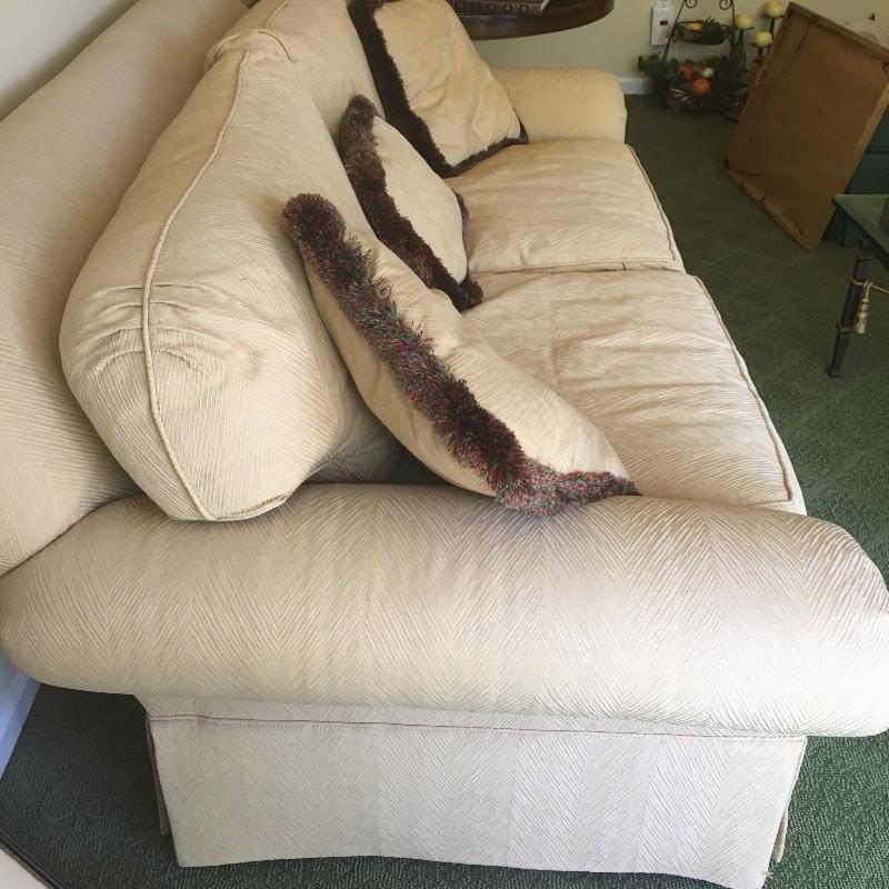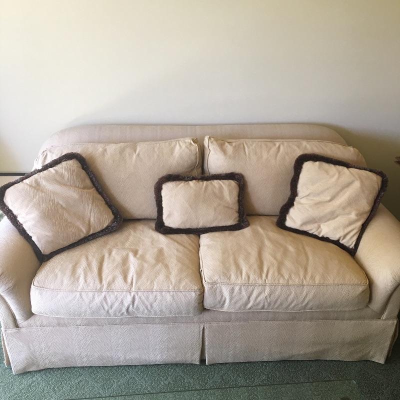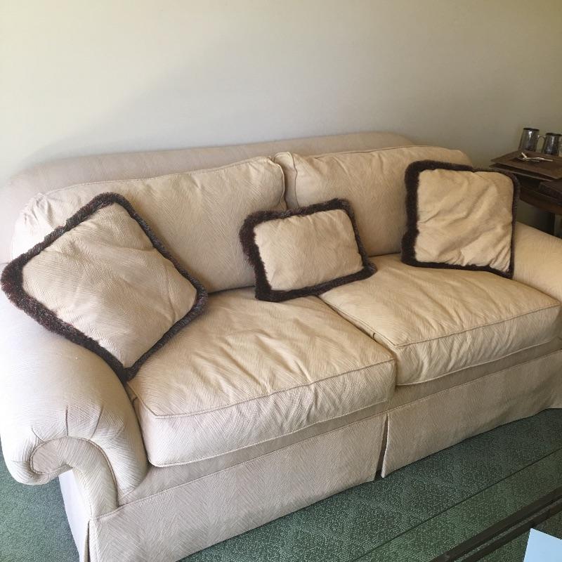 Wesley Hall couch with three throw pillows. Nice comfortable couch will be great in any room in your home. Color is a butter yellow and white pattern.