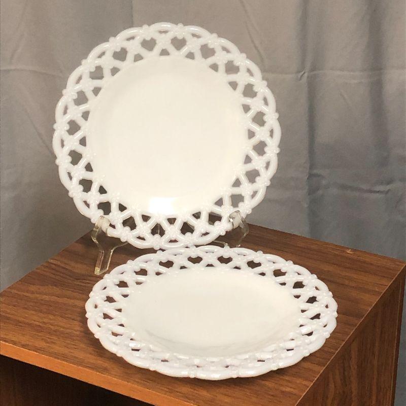 These two plates are in excellent condition and were made by Westmoreland beginning in 1947. They are 8.5" in diameter and have the Westmoreland mark on the backside of each.