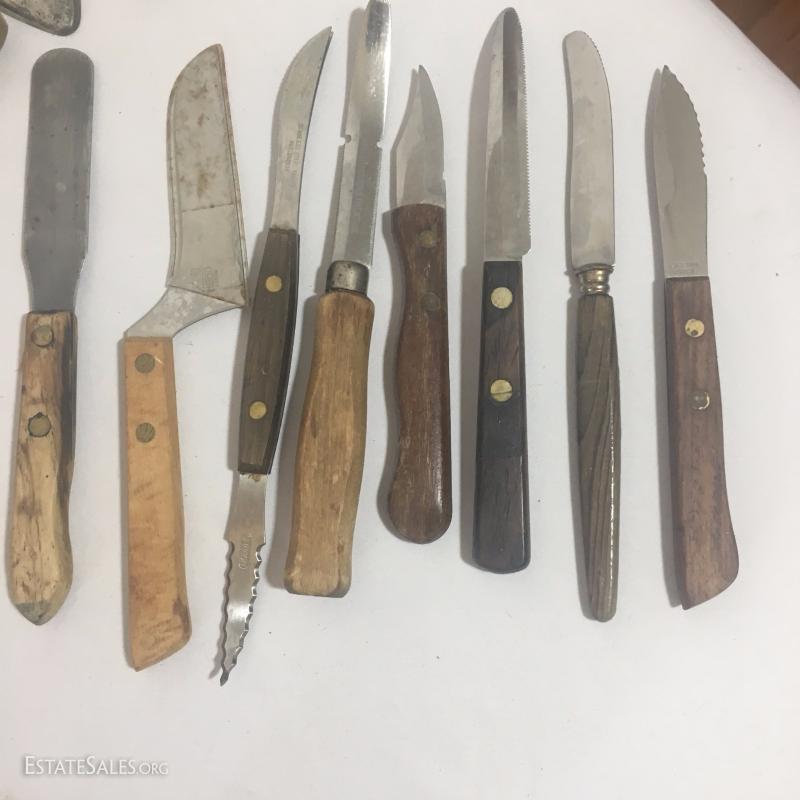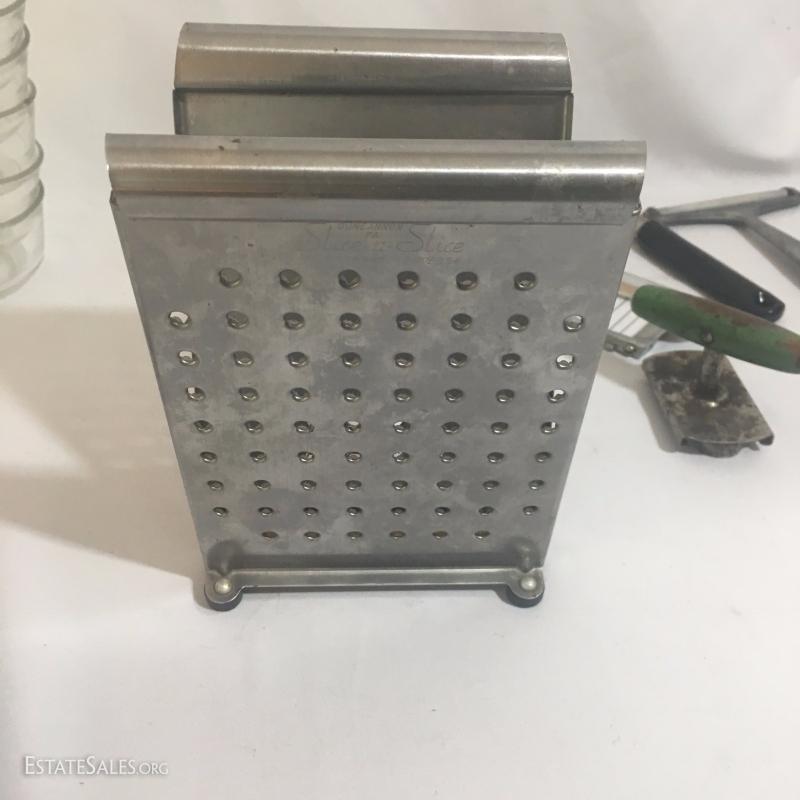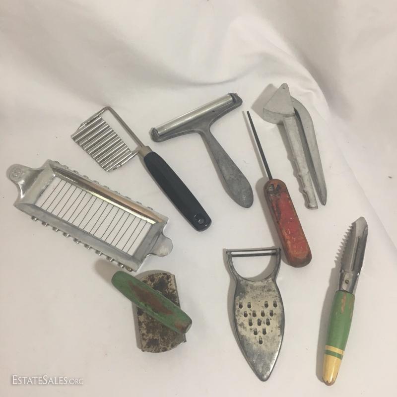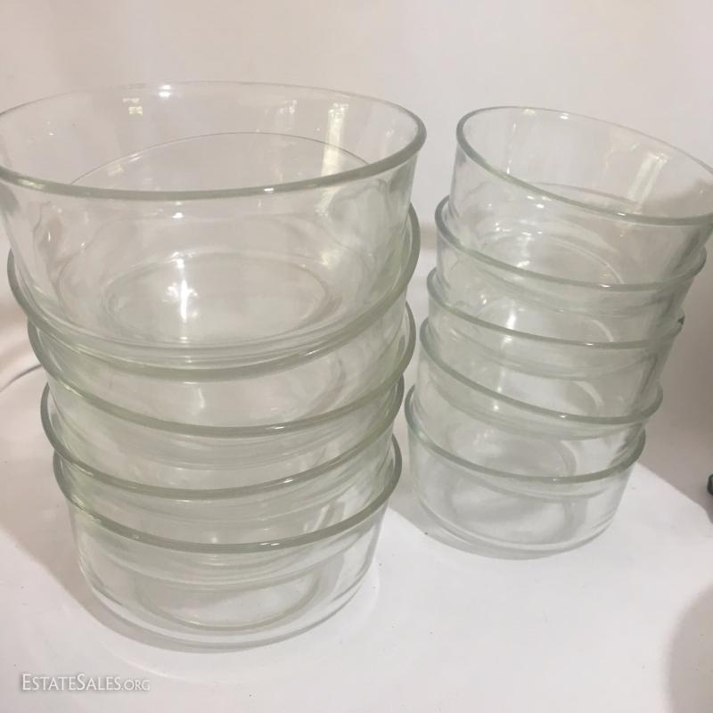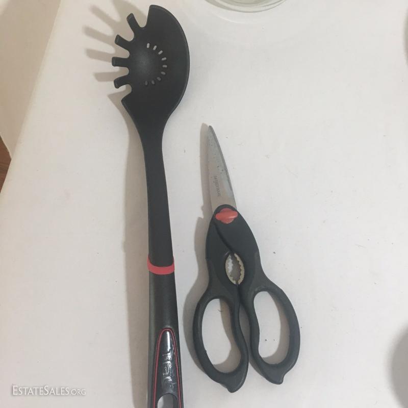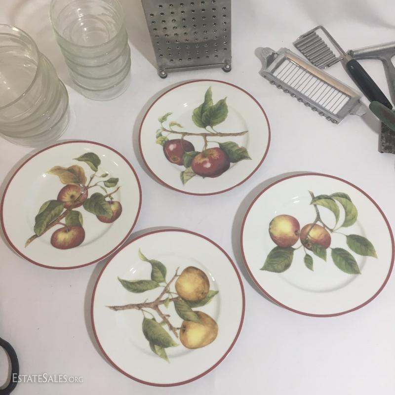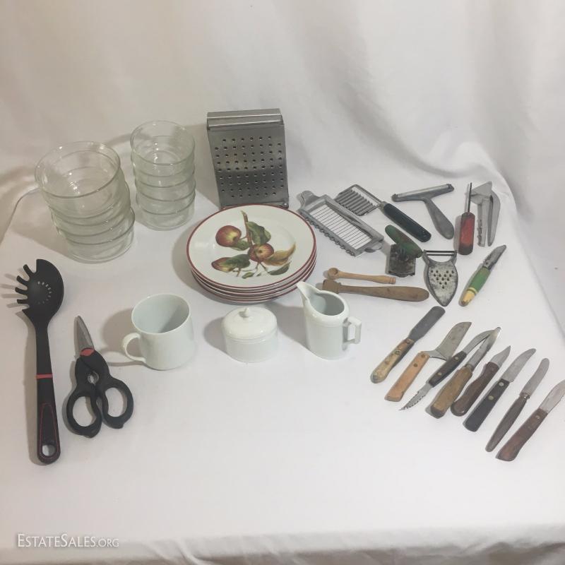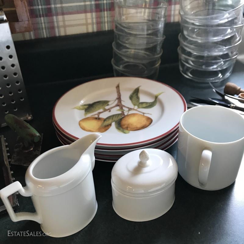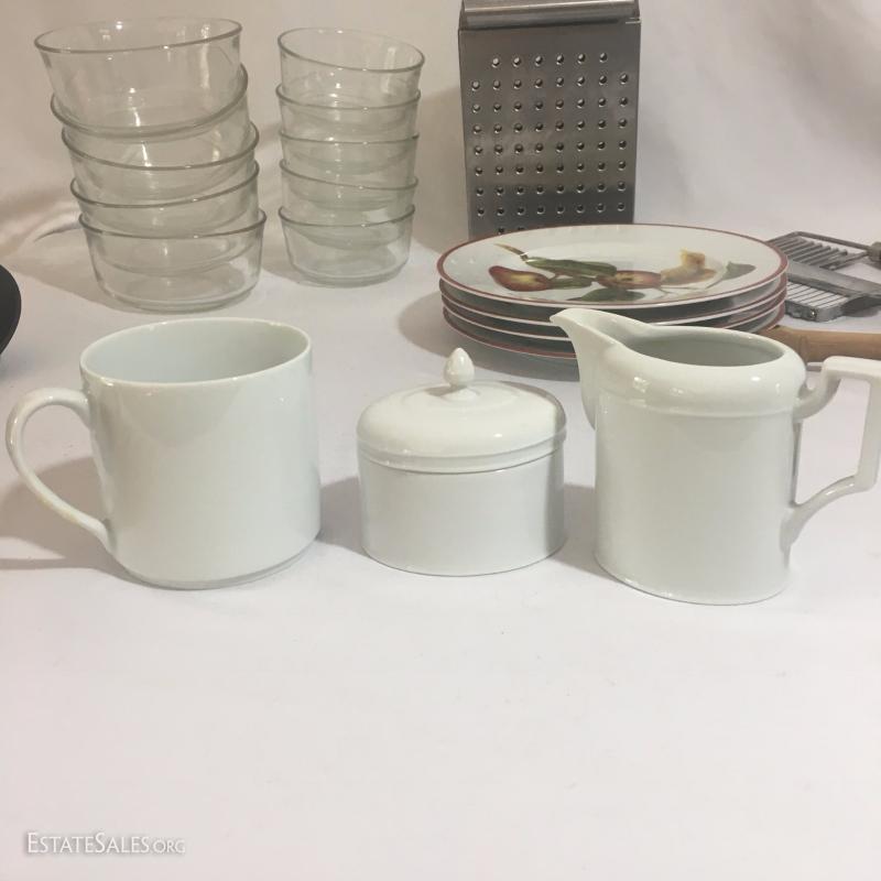 Four Williams-Sonoma apple plates. (8.5"d), Furstenberg coffee/creamer set from Germany. Several vintage and modern day utensils included. As well as five small and five large glass bowls.
