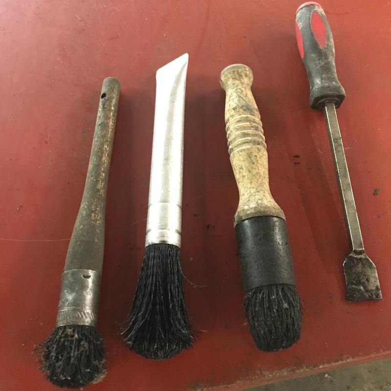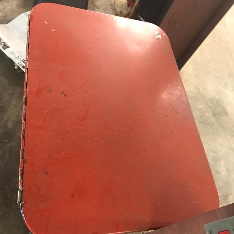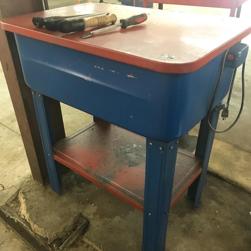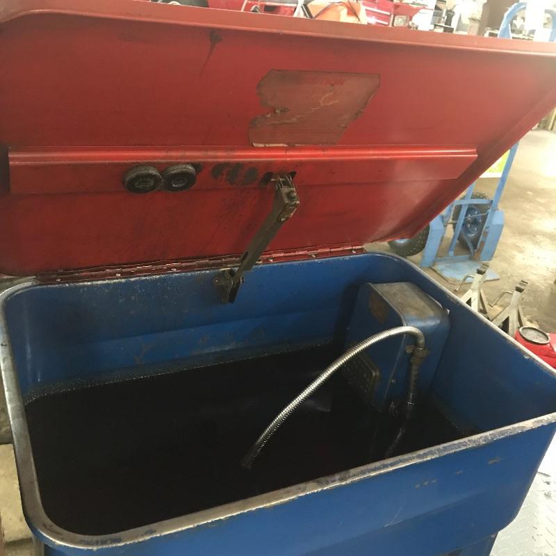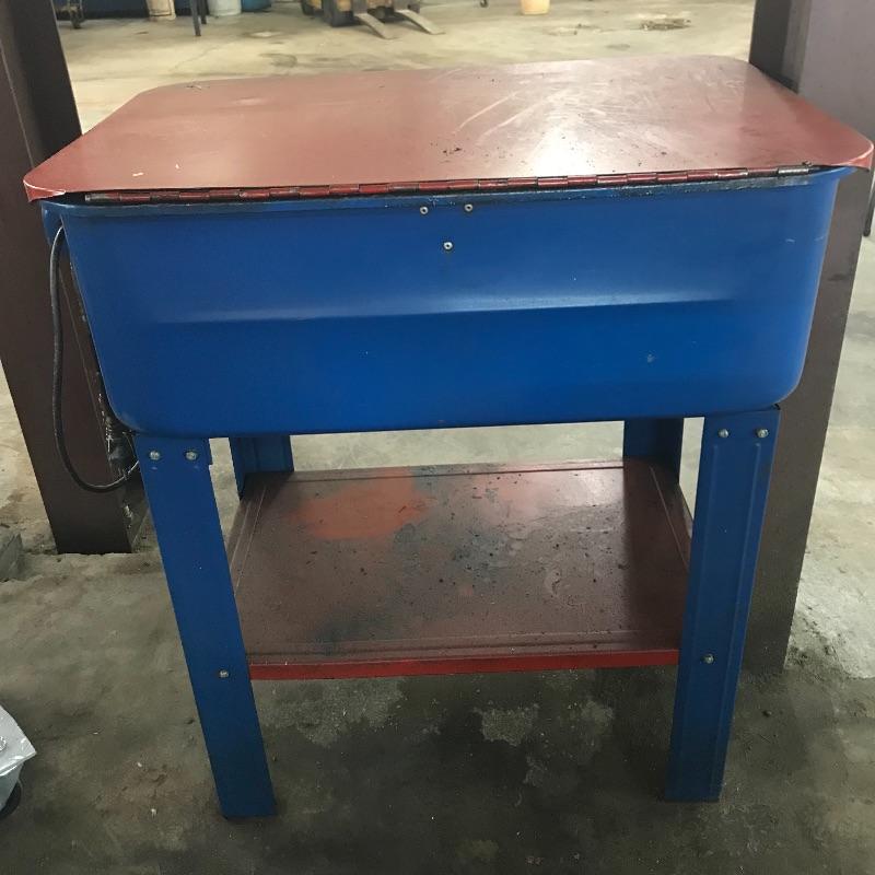 Blue and red parts washer in working order. Equipment stands 30.5” x 21.5” x 35” and turns on when plugged in. See photos. Four tools to help get the job done includes. No shipping.