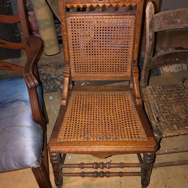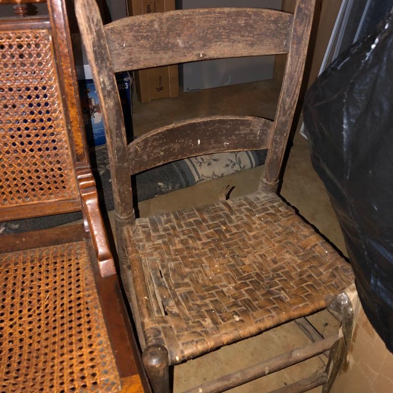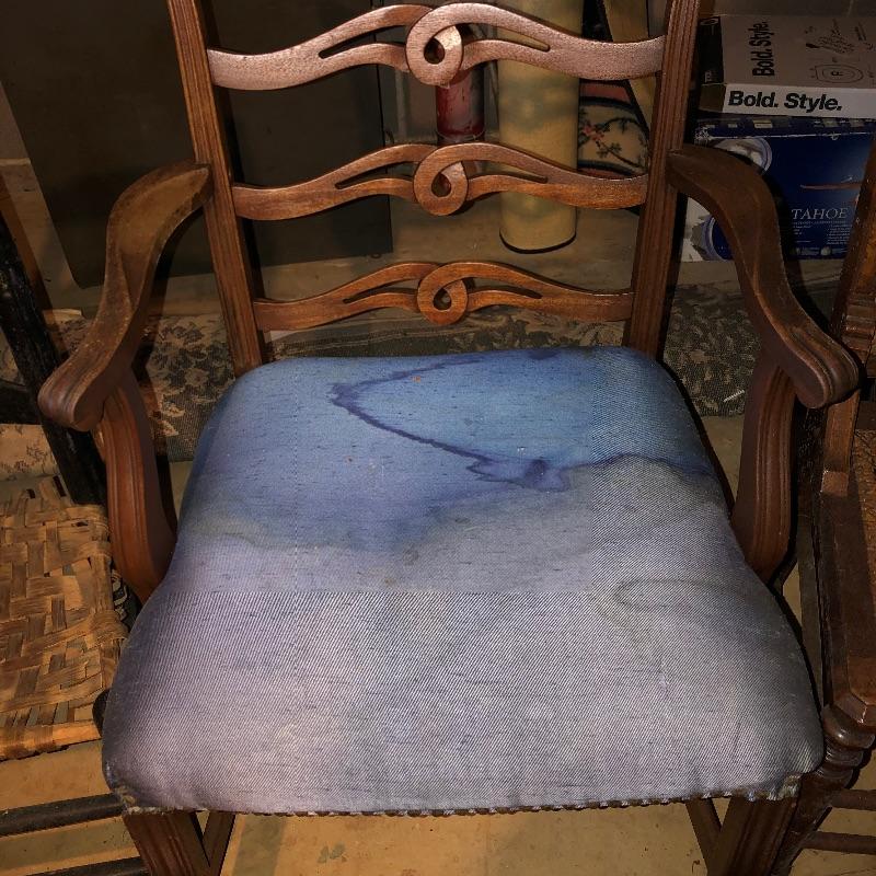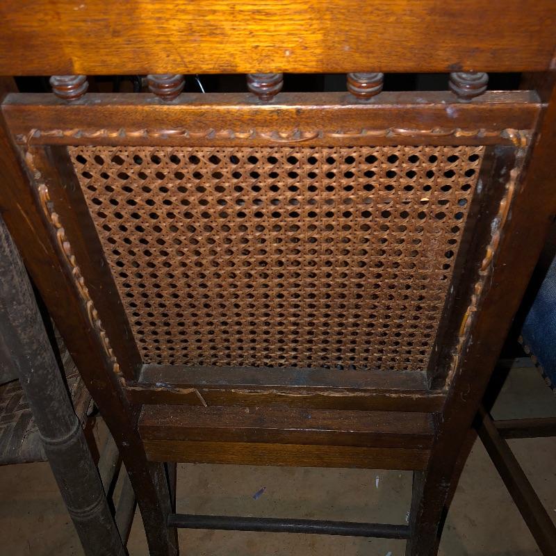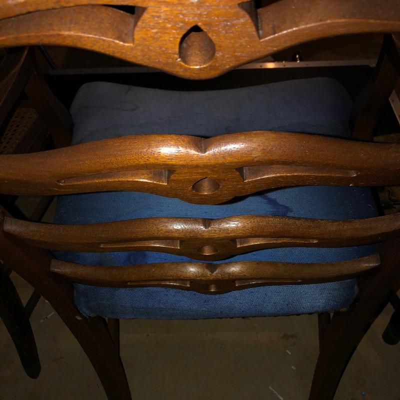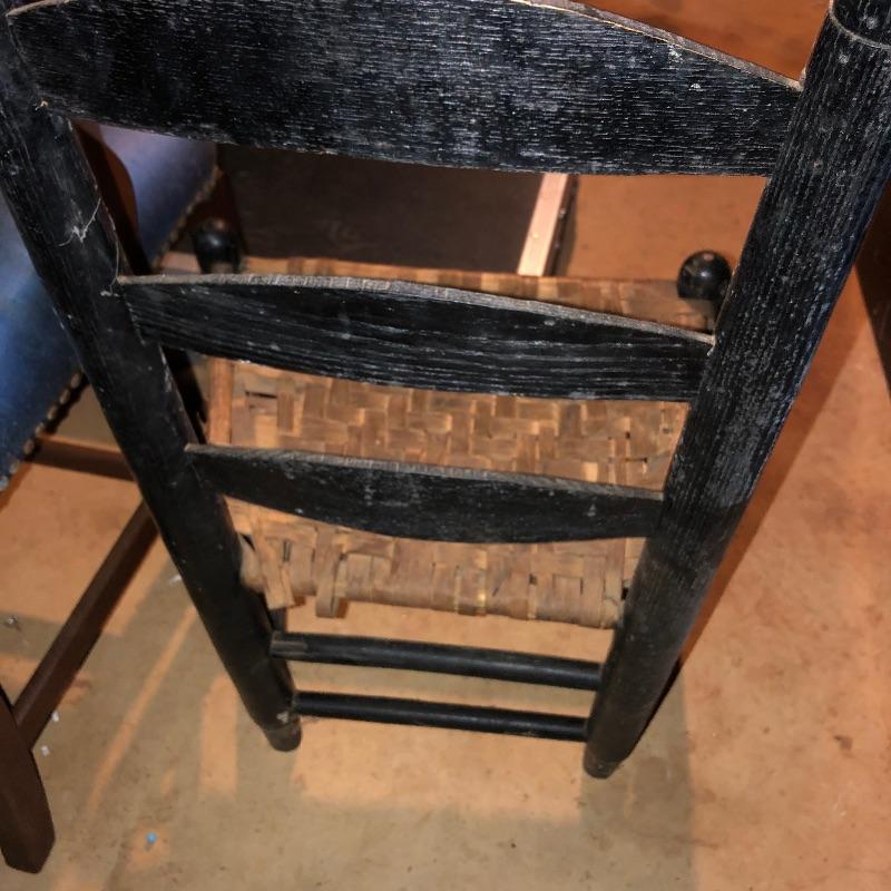 These four chairs have great bones, they just need some love! Included in this lot is one small wooden black painted chair, one large wooden chair with intricate back design a blue cushion(has stain. 24.5”w x 21”d x 37.5”h), one small antique wooden chair(17”W x 14”d x 33.5”h) and one rattan and wood chair. Clearly the seats need some repair in these but have fun with this project! No shipping.