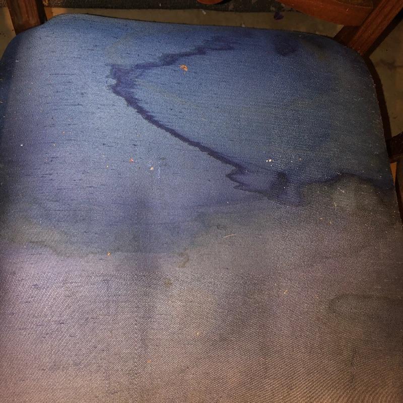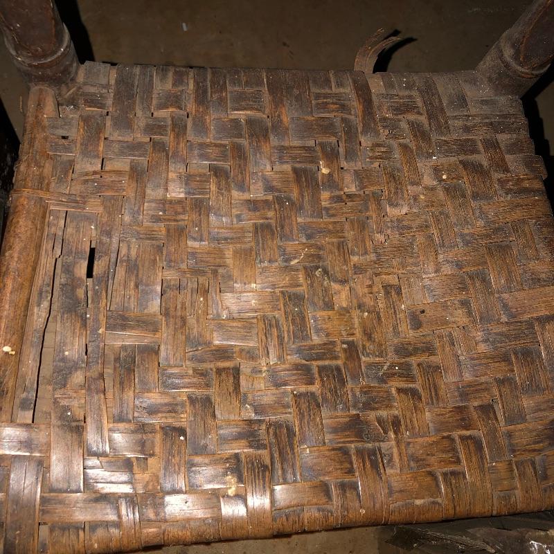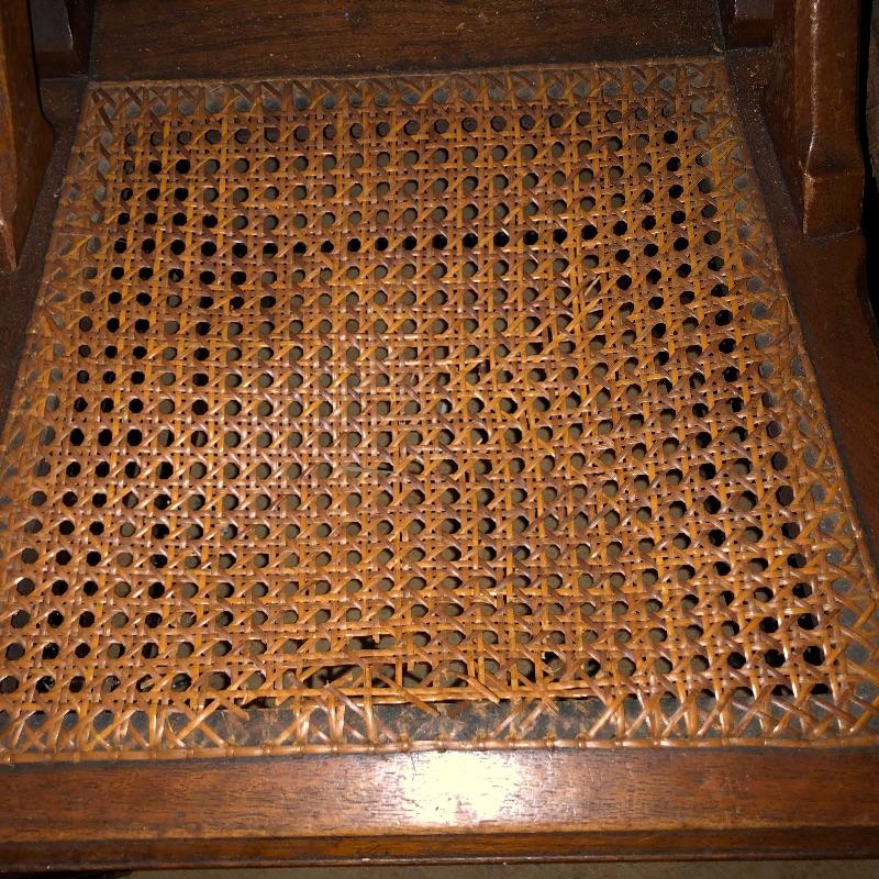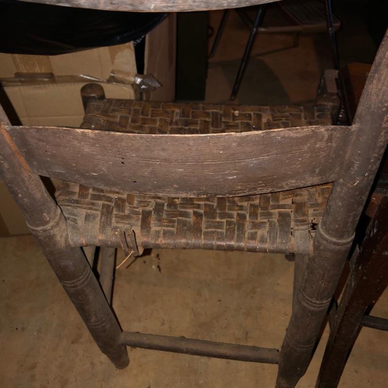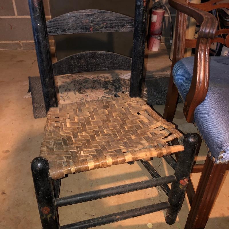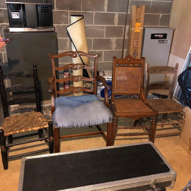 These four chairs have great bones, they just need some love! Included in this lot is one small wooden black painted chair, one large wooden chair with intricate back design a blue cushion(has stain. 24.5”w x 21”d x 37.5”h), one small antique wooden chair(17”W x 14”d x 33.5”h) and one rattan and wood chair. Clearly the seats need some repair in these but have fun with this project! No shipping.