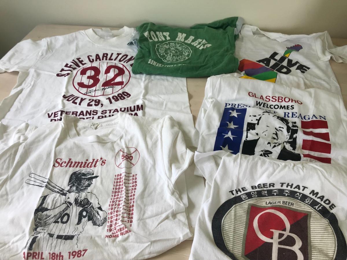 Live Aid just had it's 35th anniversary, Ronald Regan and Schmidt are two greats who passed our way. Sizes vary. Live Aid shirt looks small. Pictures are the best representation of the items listed and items are untested unless indicated in description. Thank you for looking and have fun bidding!