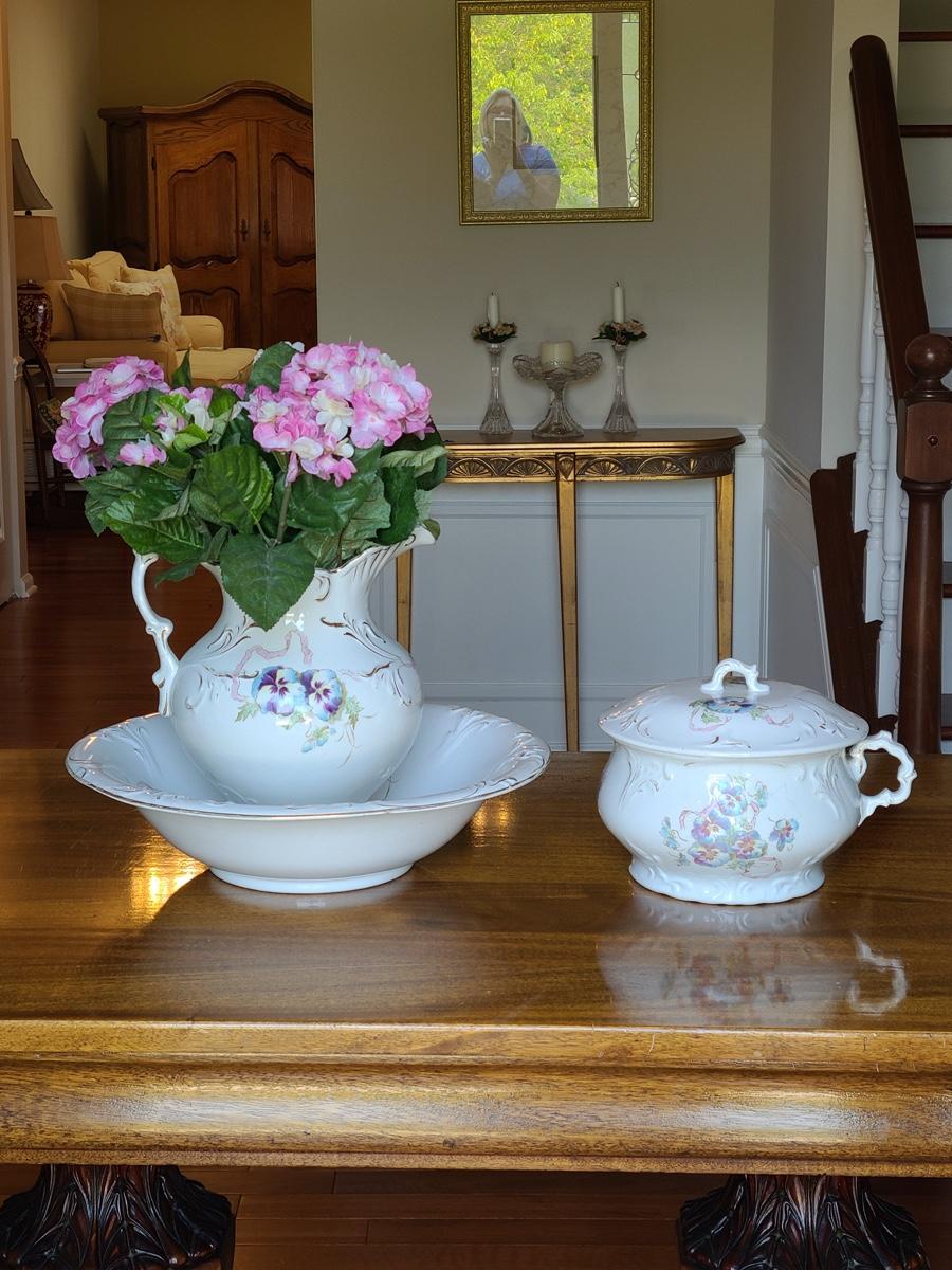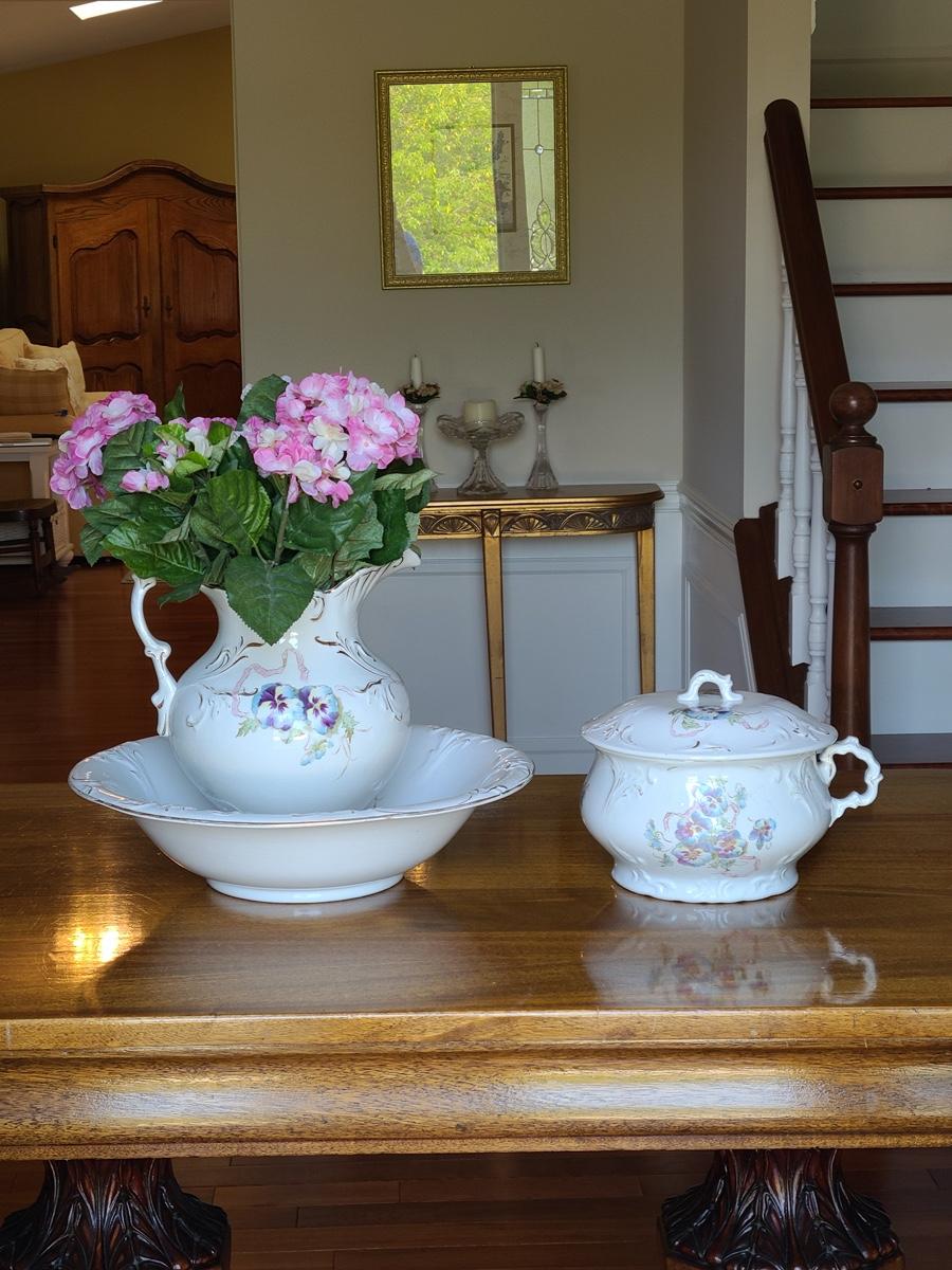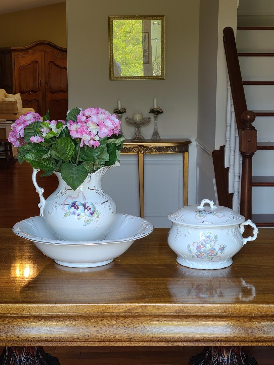 This set was used as an accent in the home and it is gorgeous. Due to age there are some condition issues including a break in the handle that has been repaired. Still lovely and functional. Please see all pictures as they are the best representation of the items in the lot, the condition of the lot, and will show measurements if taken. If purchasing furniture you must be able to move yourself with your own help, and truck. This is located on the first floor.