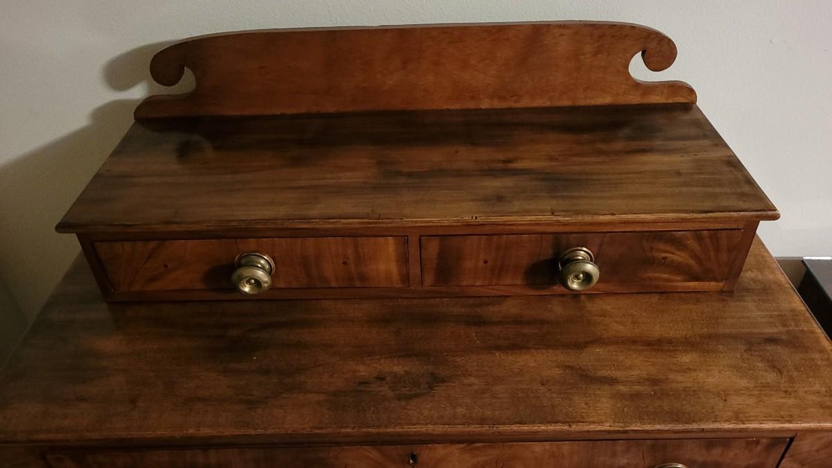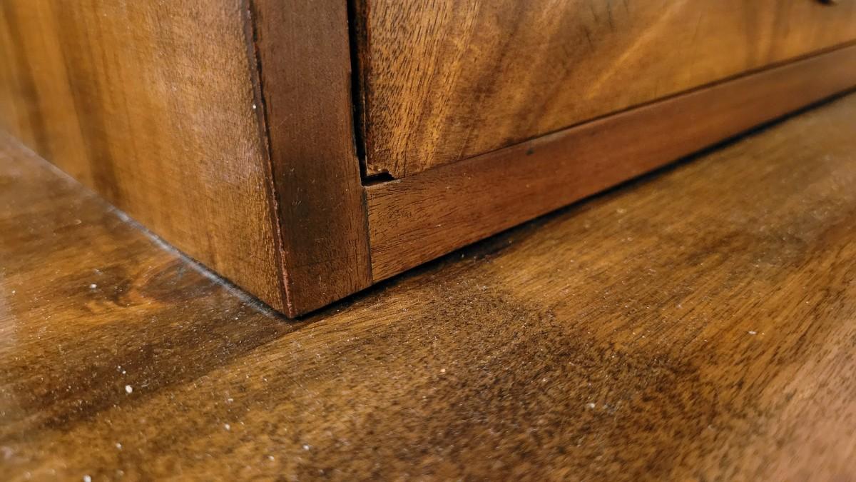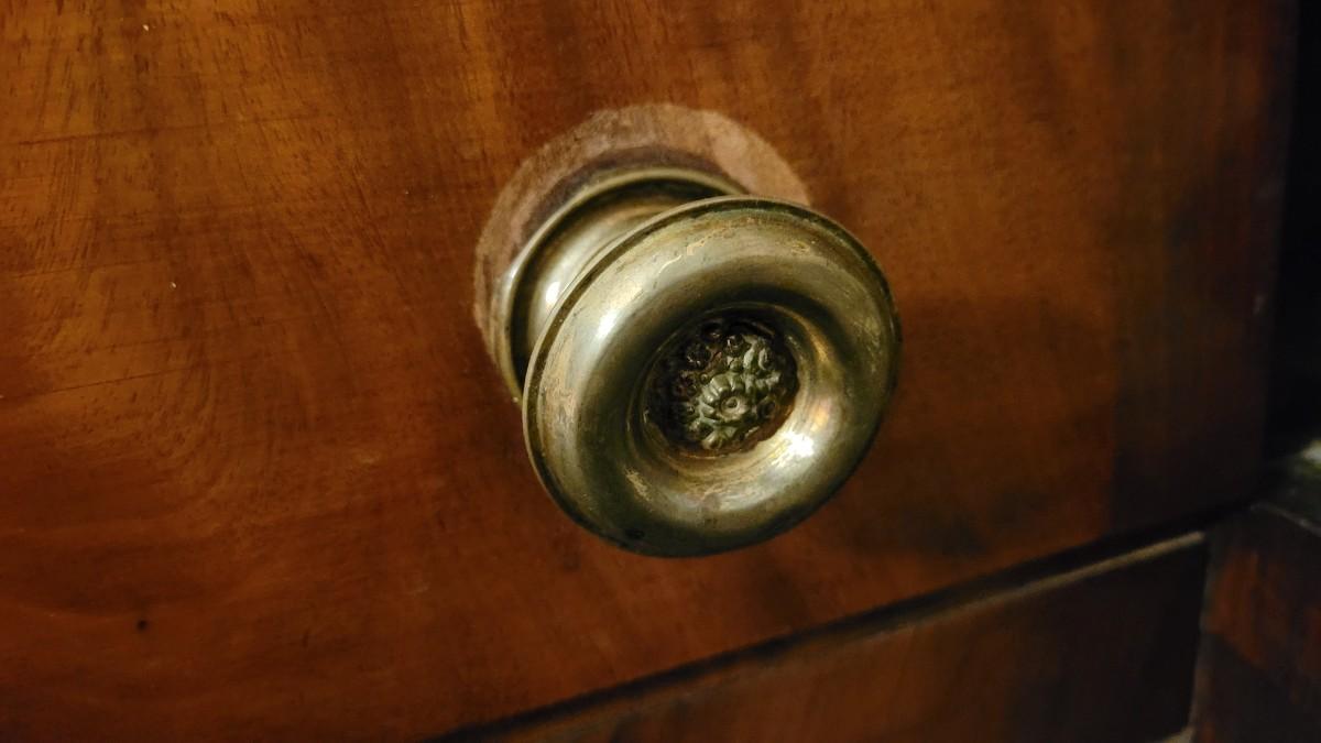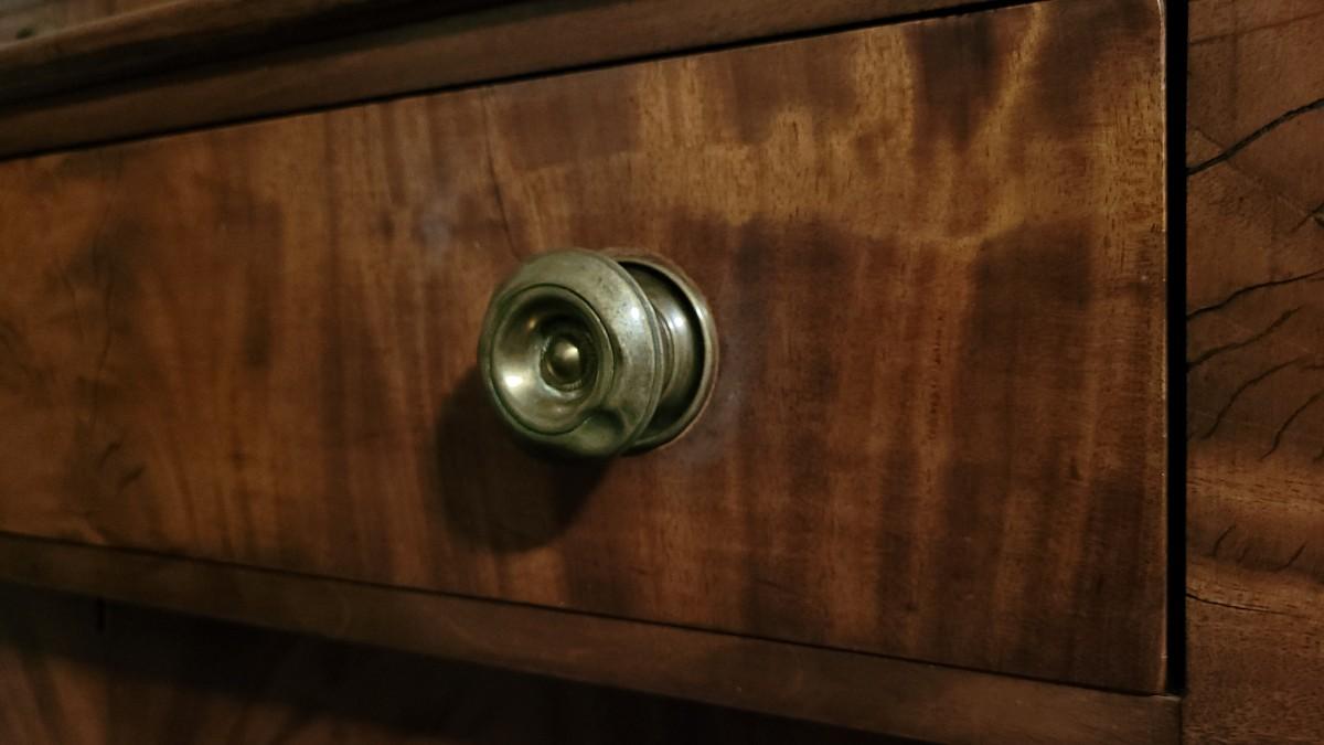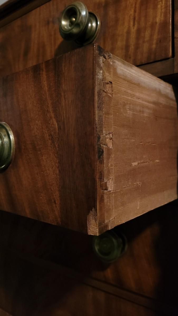 A few small defects to be expected with age and use but overall a quite fine example. The drawers slide nicely and the top and side sections are in great condition without any noticeable rings or other common damage. We've done pur best to show any issues that are visible during inspection. One of the pulls (lower right) is losse and needs a new nut to catch the original bolt properly so it recedes as intended to sit flush.