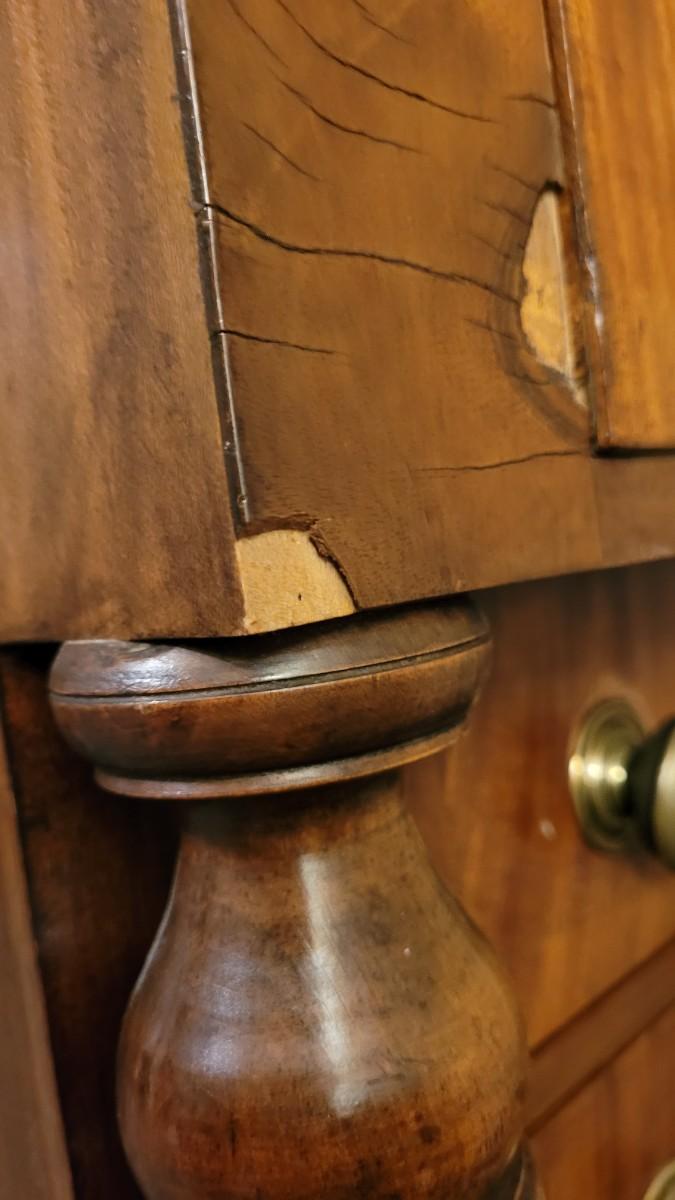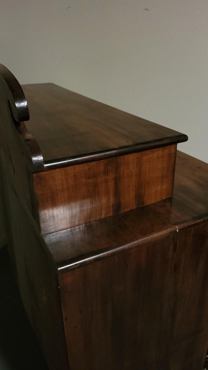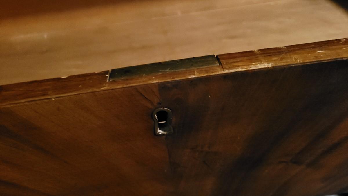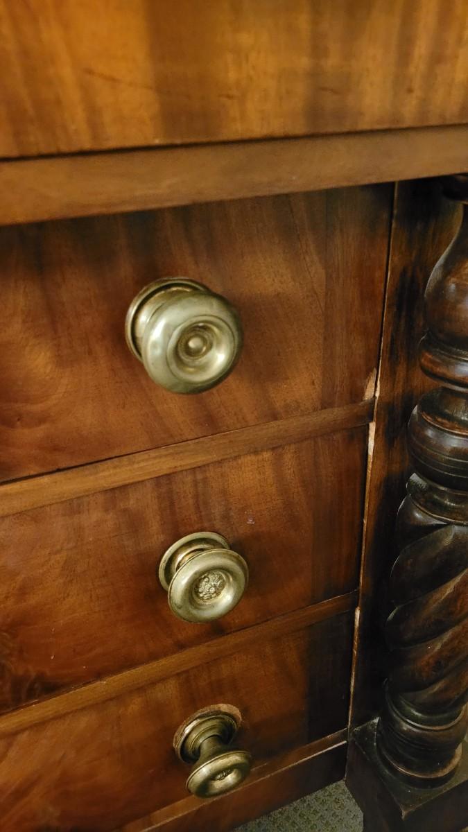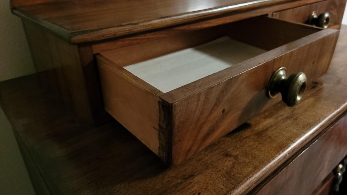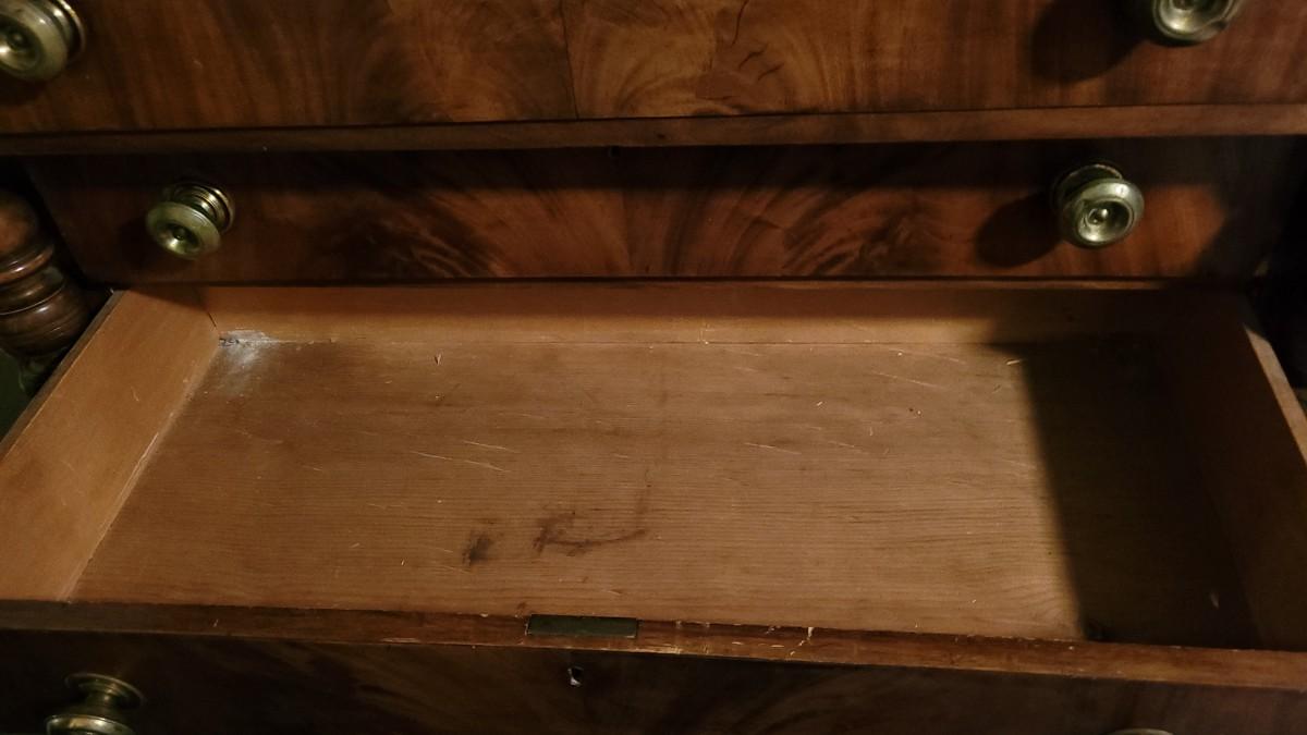 A few small defects to be expected with age and use but overall a quite fine example. The drawers slide nicely and the top and side sections are in great condition without any noticeable rings or other common damage. We've done pur best to show any issues that are visible during inspection. One of the pulls (lower right) is losse and needs a new nut to catch the original bolt properly so it recedes as intended to sit flush.