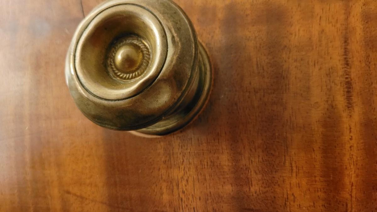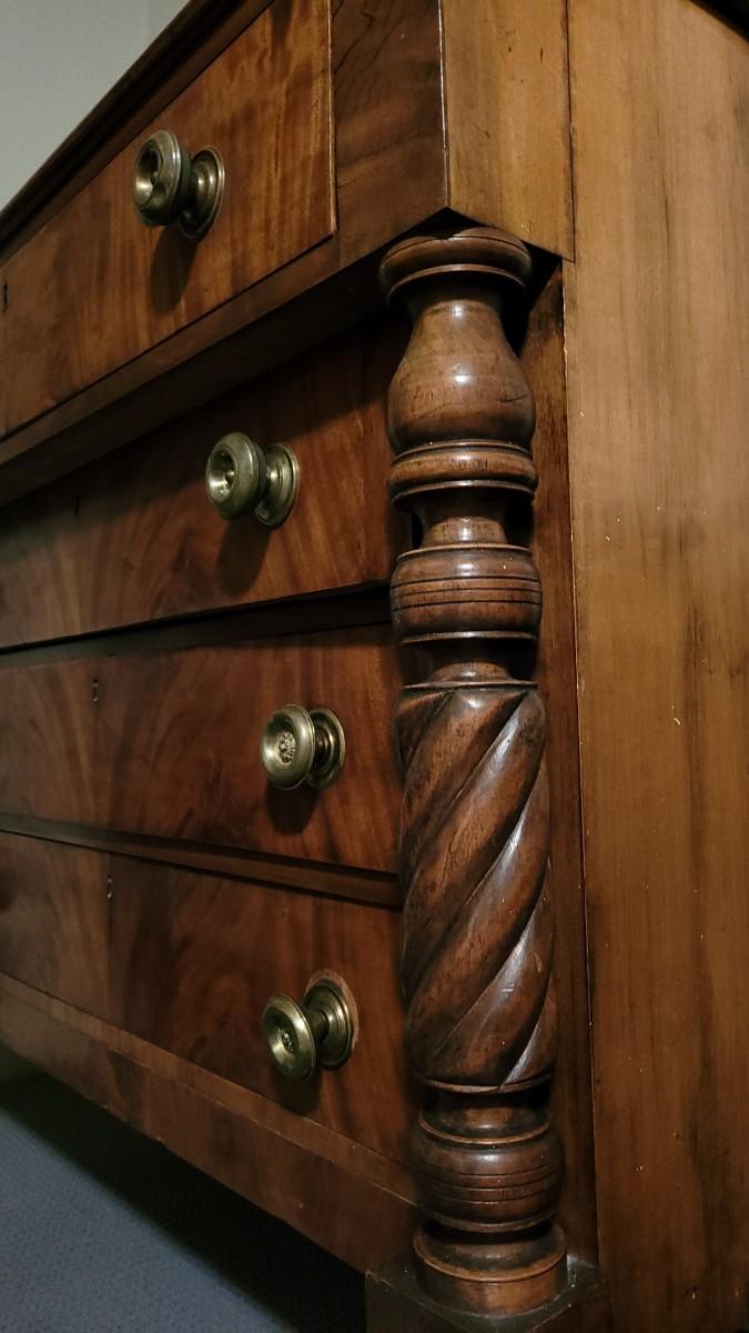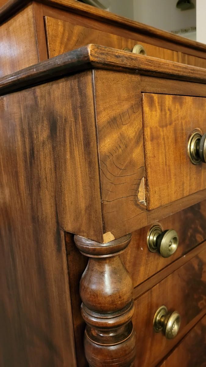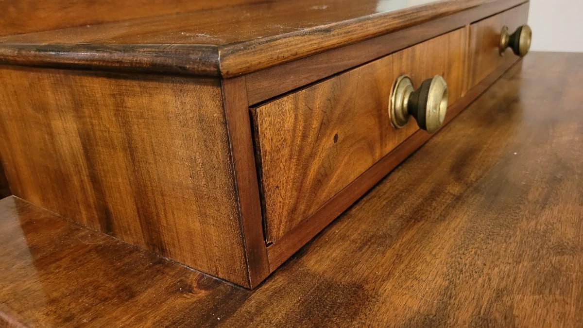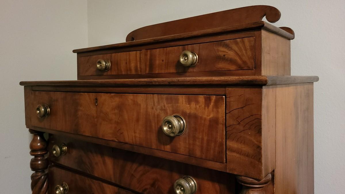 A few small defects to be expected with age and use but overall a quite fine example. The drawers slide nicely and the top and side sections are in great condition without any noticeable rings or other common damage. We've done pur best to show any issues that are visible during inspection. One of the pulls (lower right) is losse and needs a new nut to catch the original bolt properly so it recedes as intended to sit flush.