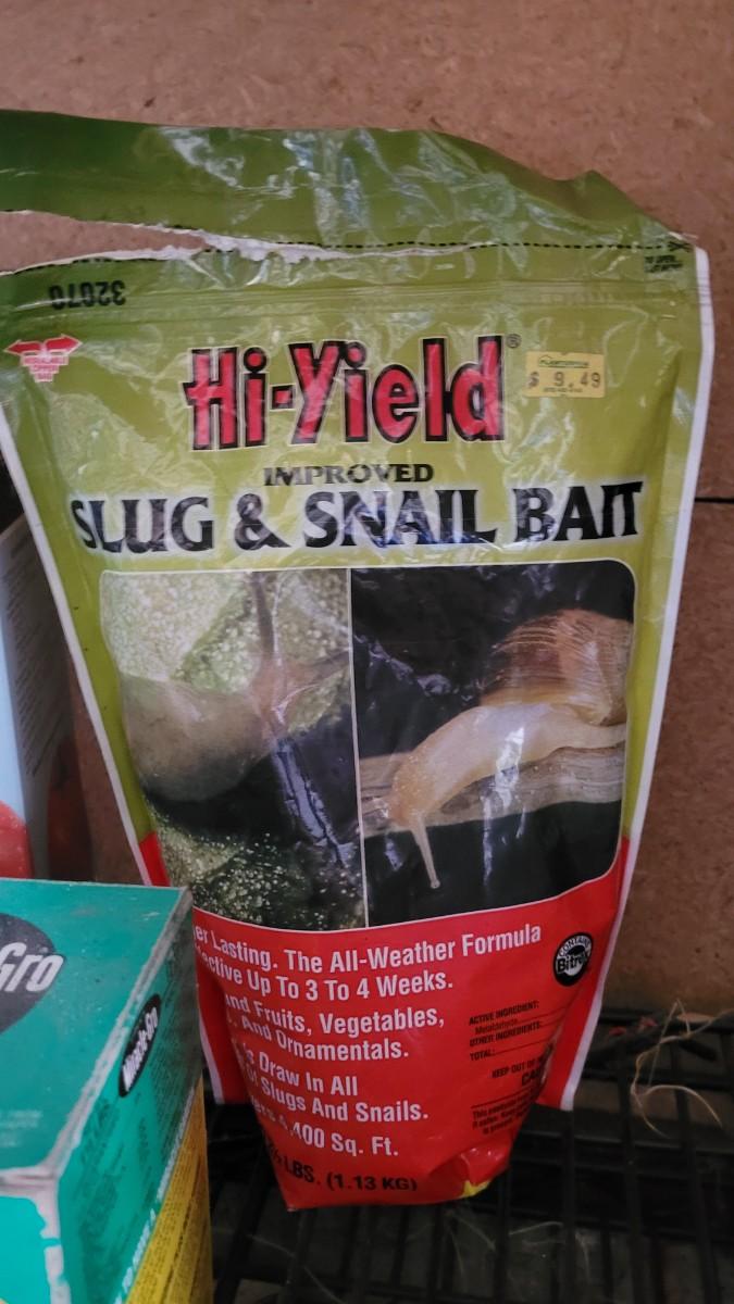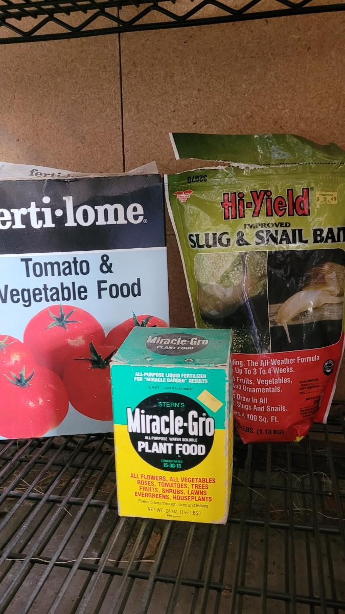 Gardening chemicals. Miracle Gro and Tomato Food are more that 3/4 Full. The slug and snail is about a quarter full.