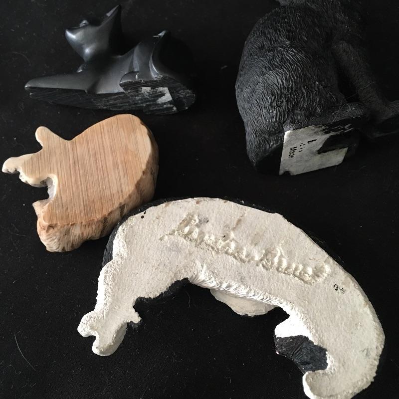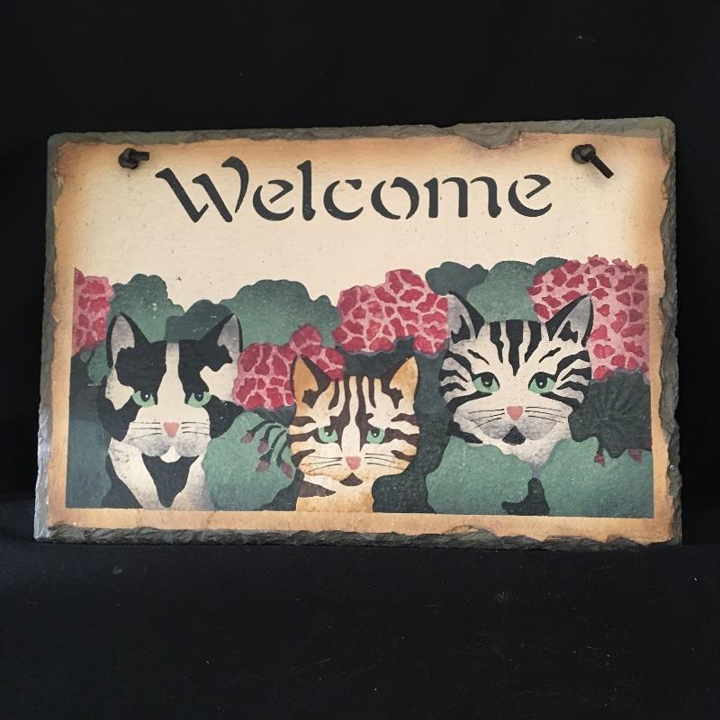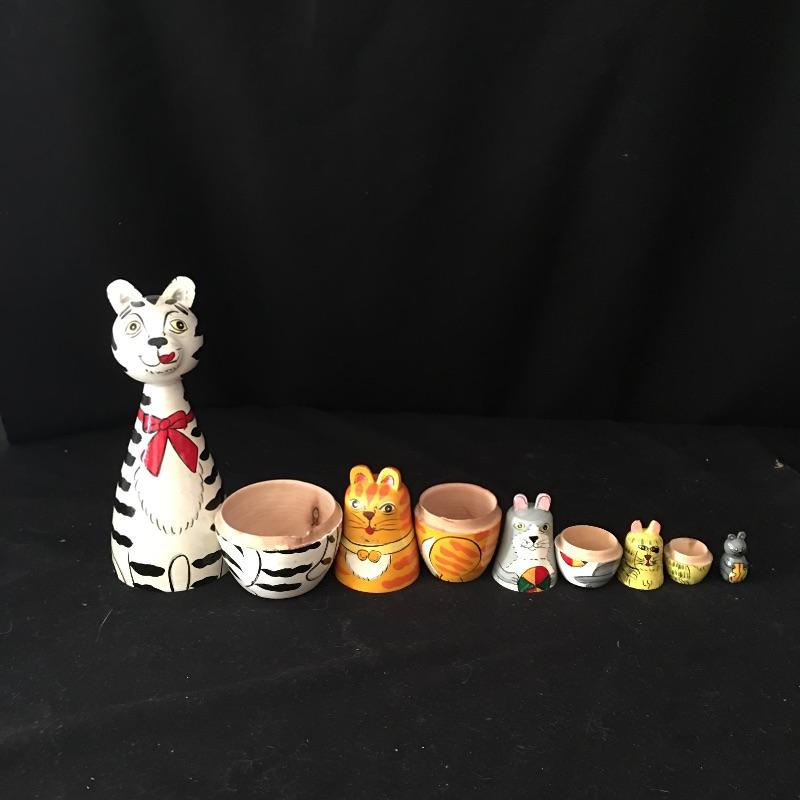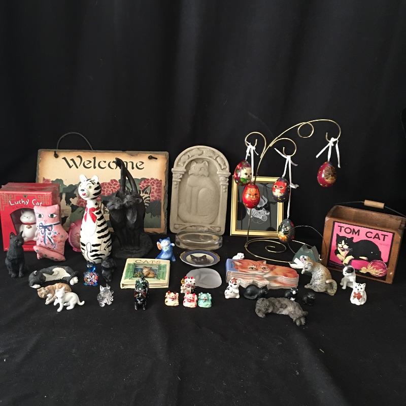 This is a great collection for the cat person. Gorgeous stamped Paul Jenkins cat statue measures 6” x 7.5”Look at the cute nesting cat doll that end with a mouse! Lot includes Lucky Cat, five cat ornaments with stand, slate welcome sign, cat artwork, two mini books, wooden box with handle, mini plate and cat figurines in a variety of sizes, styles and materials. Welcome sign measures 8” x 12”.