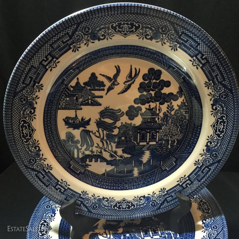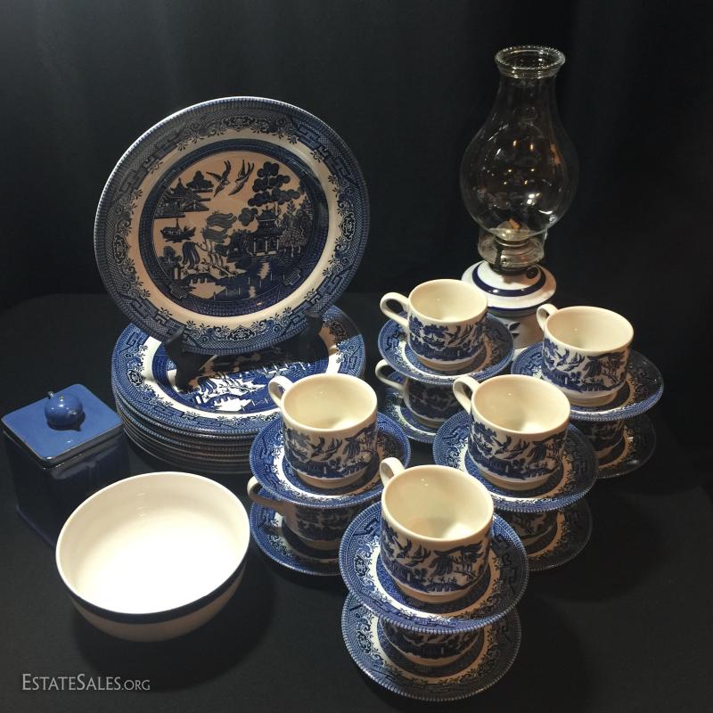Blue & White Churchill, Staffordshire England: 10 plates and 10 cups & saucers. Also a blue & white bowl by Mainstays and a misc blue tea bag holder and a blue & white oil lamp.