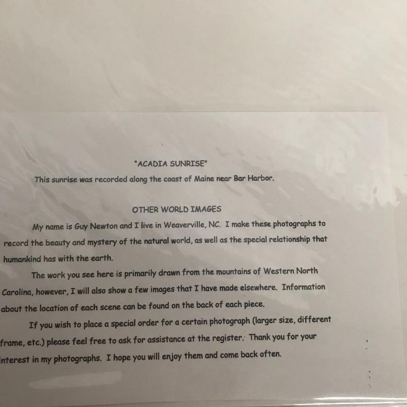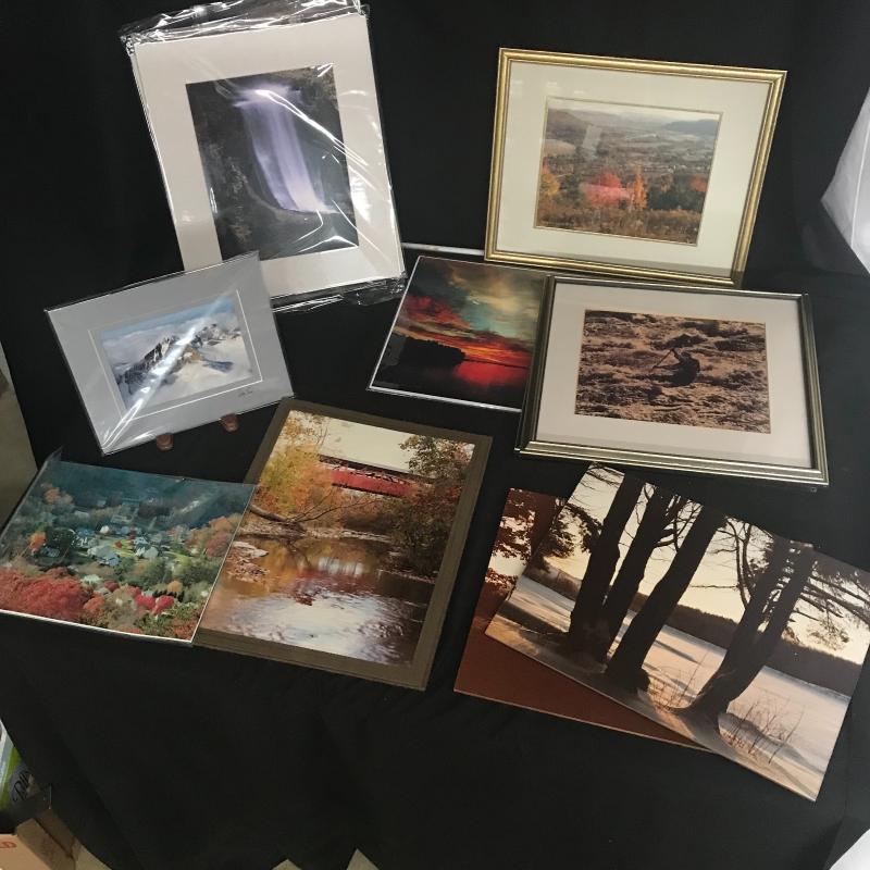 Lot 190 - Collection of Outdoor Photography to include local artist Guy Newton’s “Acadia Sunrise”, several color shots by John Suliot, framed Larry W. Hoey, William Ervin’s Rocky Mtn Matted scene, two matted waterfall prints, two framed sepia toned kayaker photos (these are the largest in Lot 15” x13”), Two seasonal photos on boards. Local pick up only.