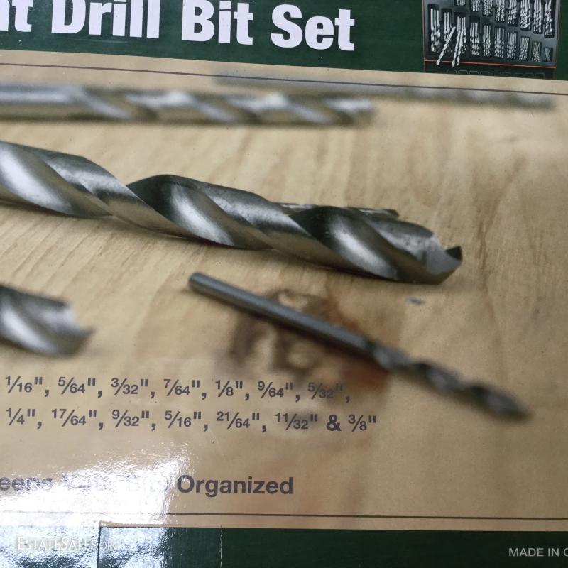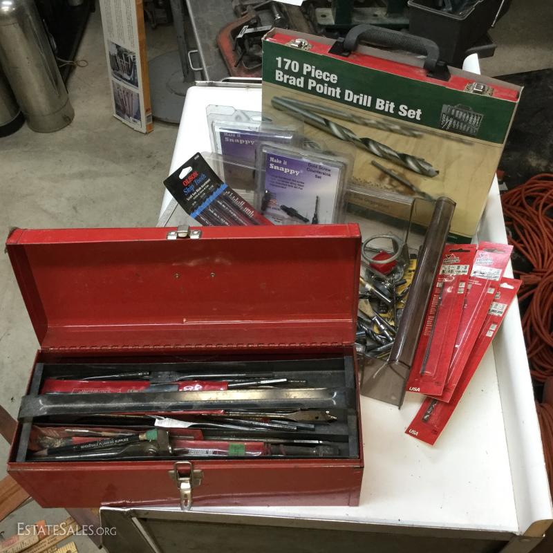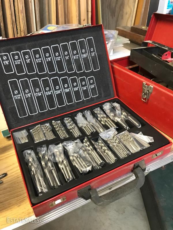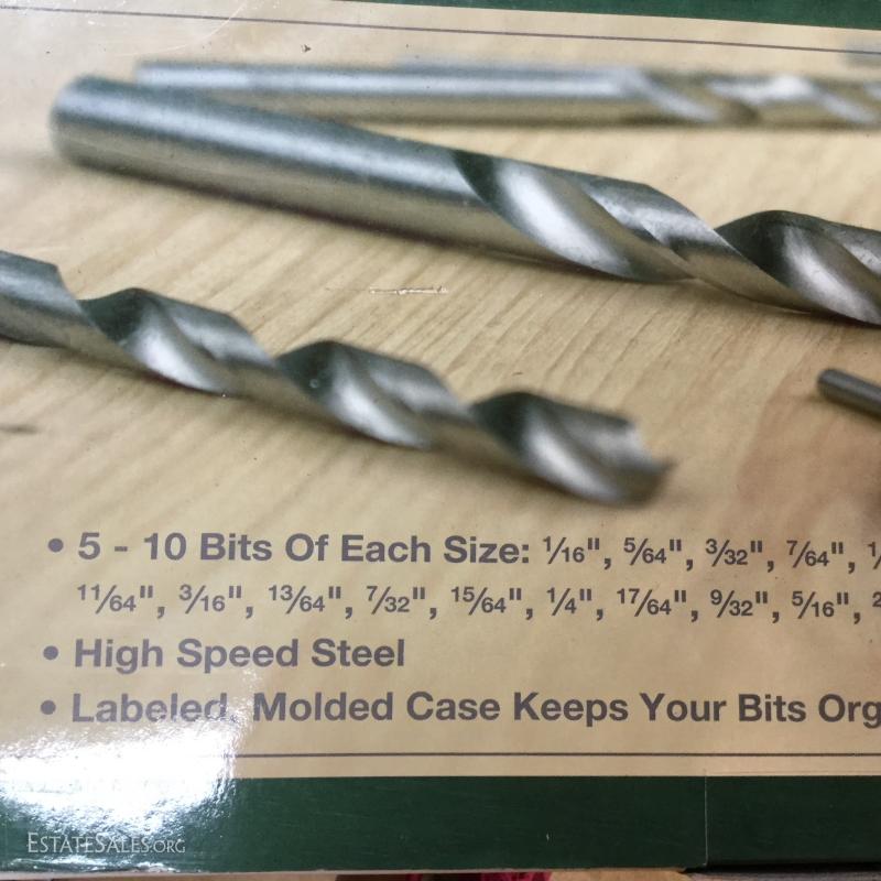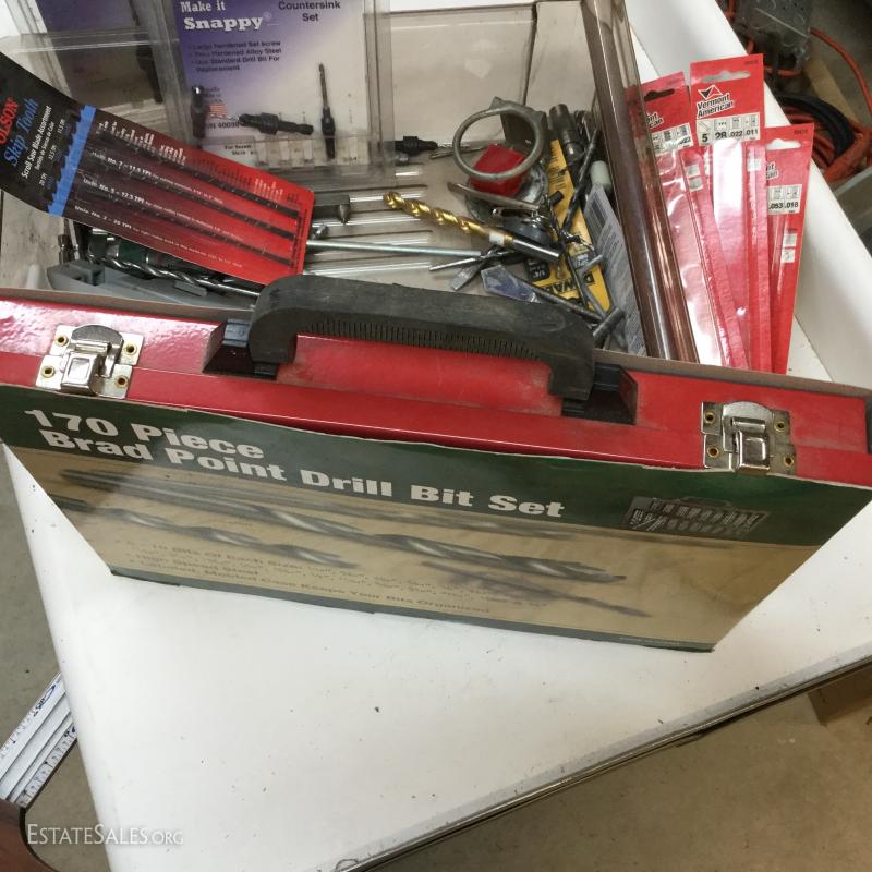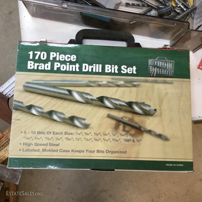 Drill bits, lots of sizes. Hole saw blades and router wood bits. New in box 170-piece set of drill bits in 19 sizes.