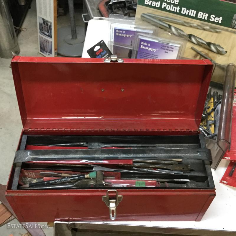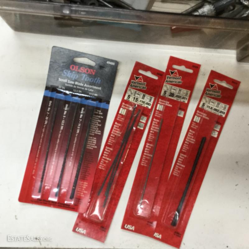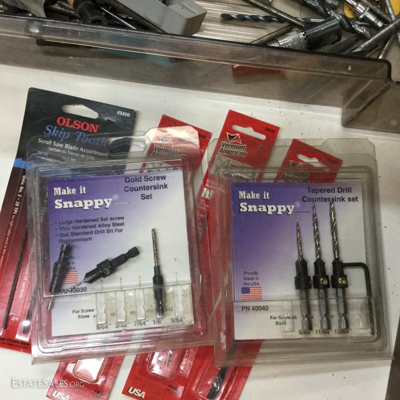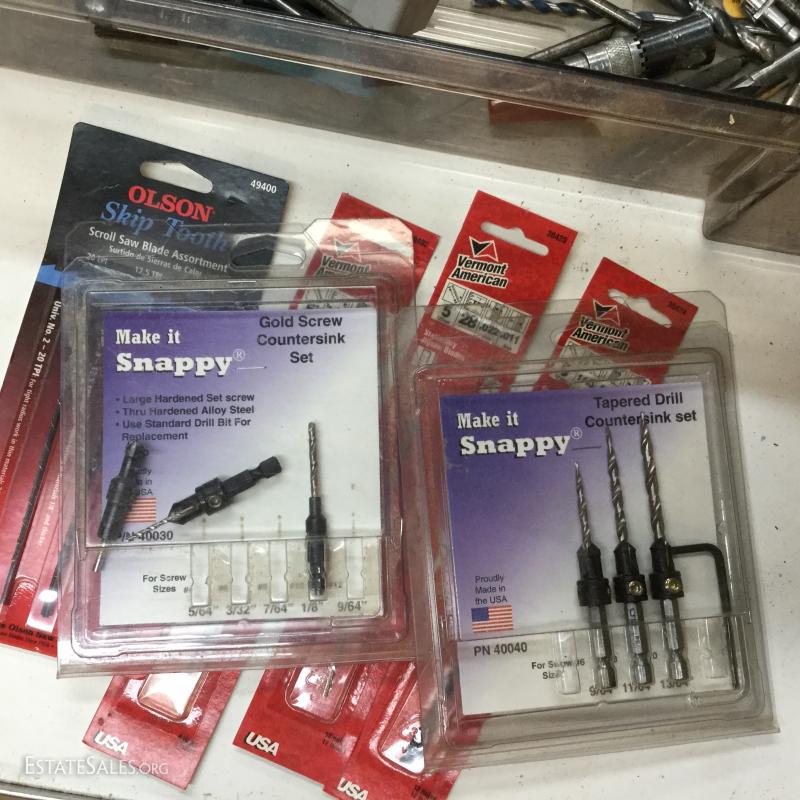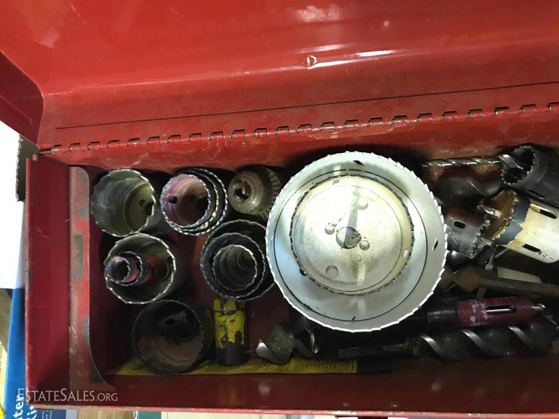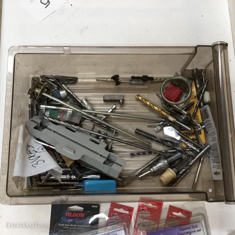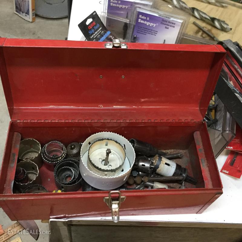 Drill bits, lots of sizes. Hole saw blades and router wood bits. New in box 170-piece set of drill bits in 19 sizes.