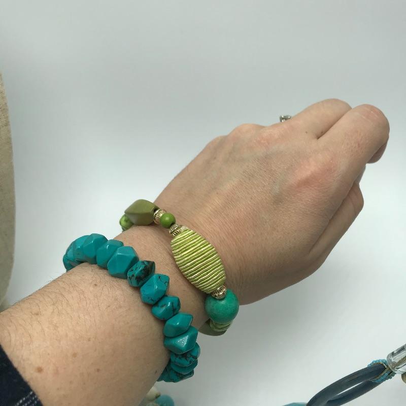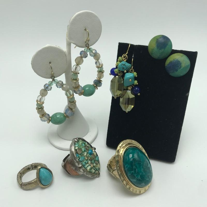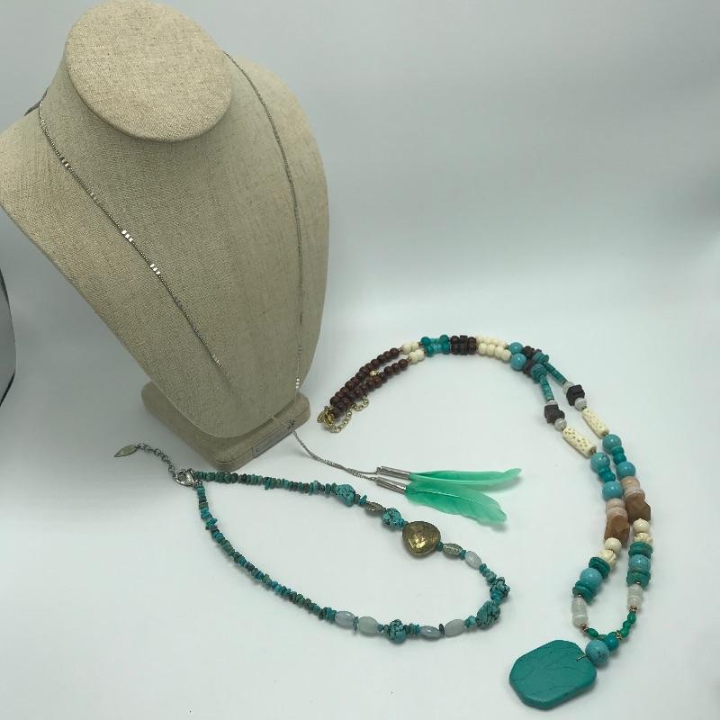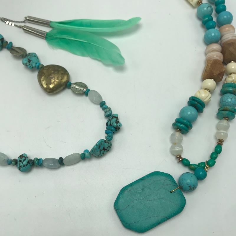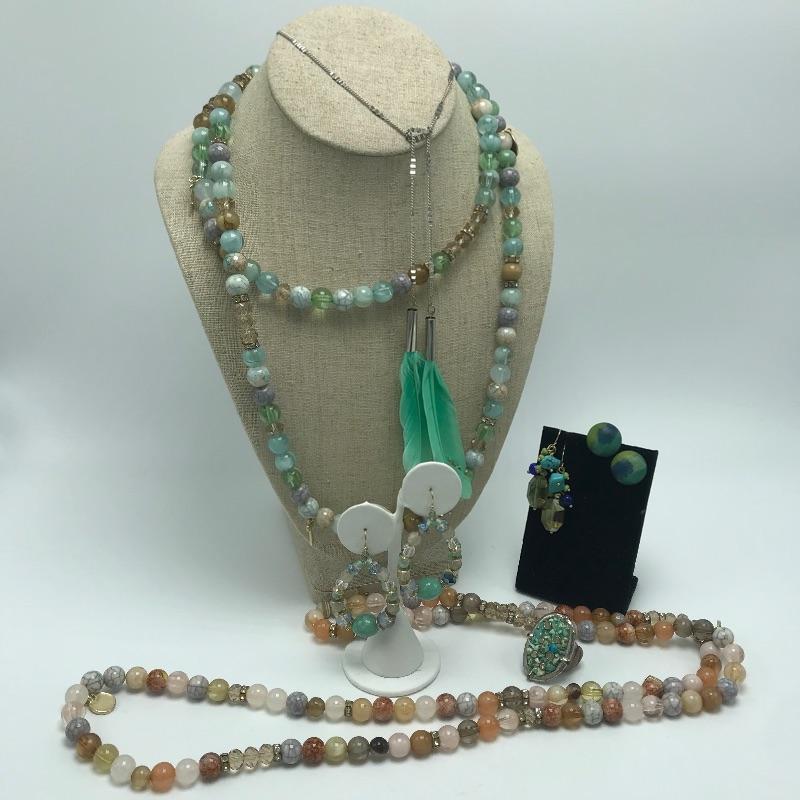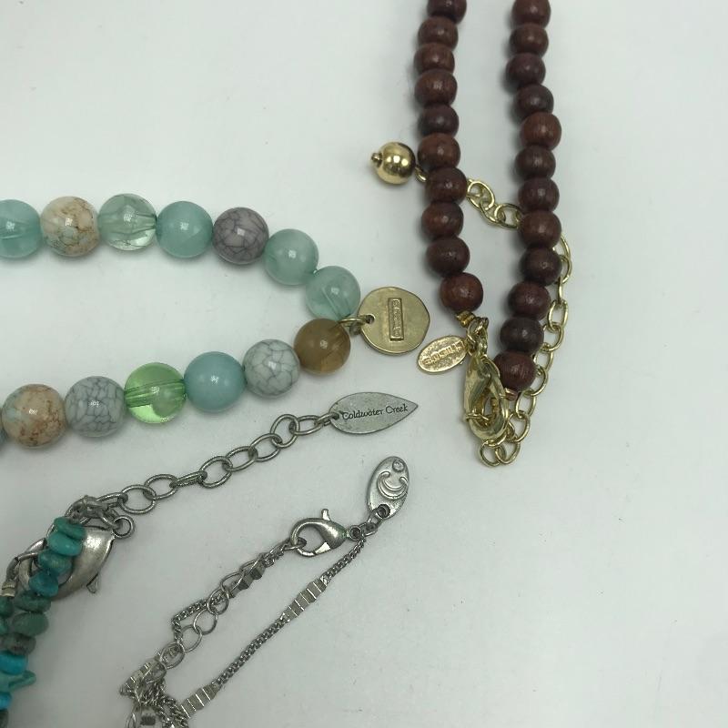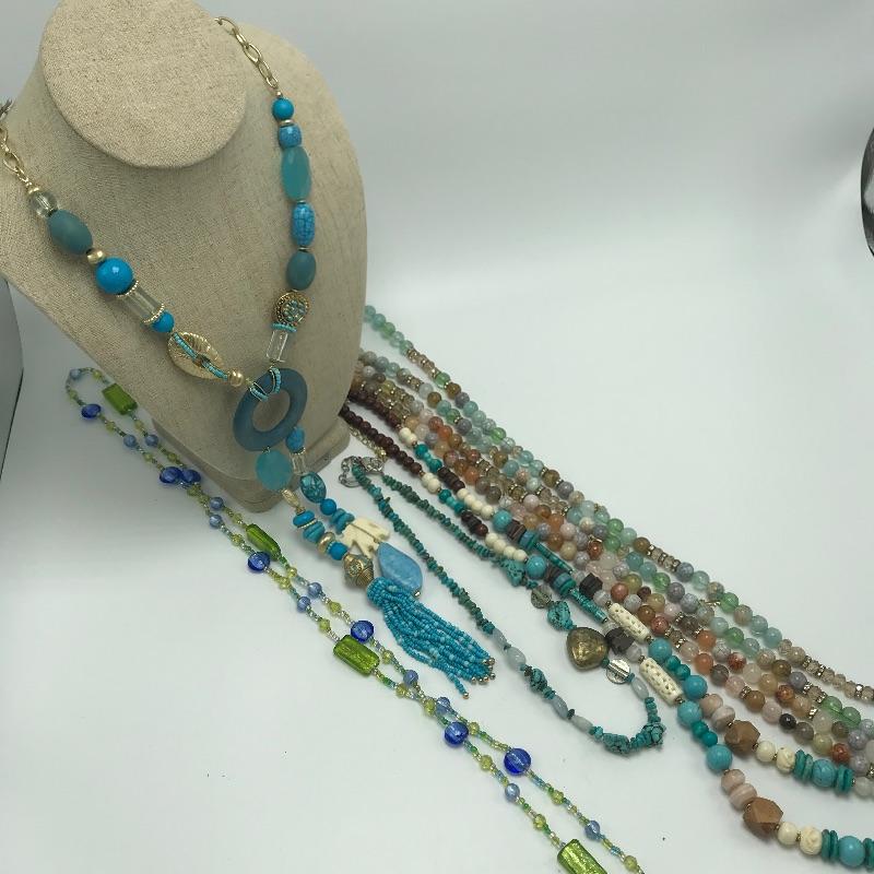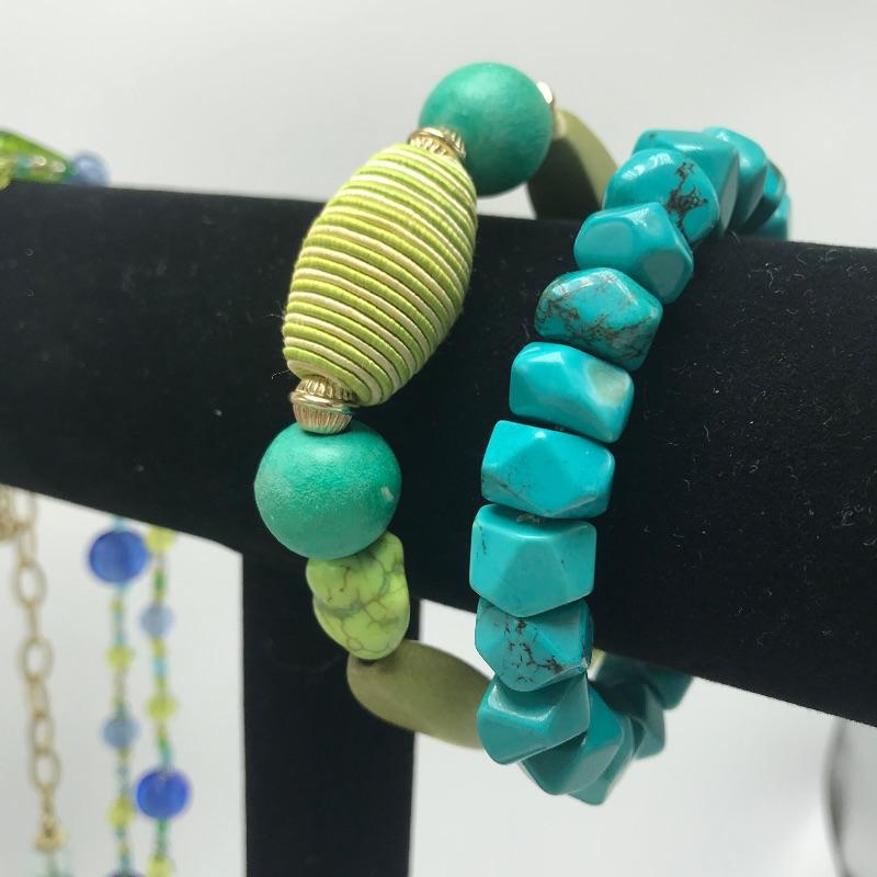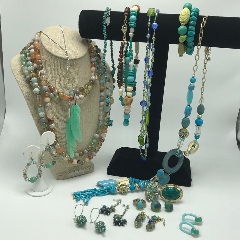 Stunning lot of natural and man made beauty. Stones reminiscent of turquoise, faux ivory, stones with beads, glass and more. Brand names include Chico’s, Coldwater Creek and Charming Charlie’s. Two bracelets included in lot are both stretch style.