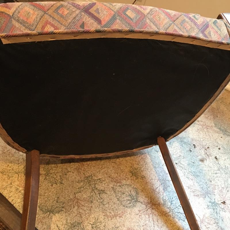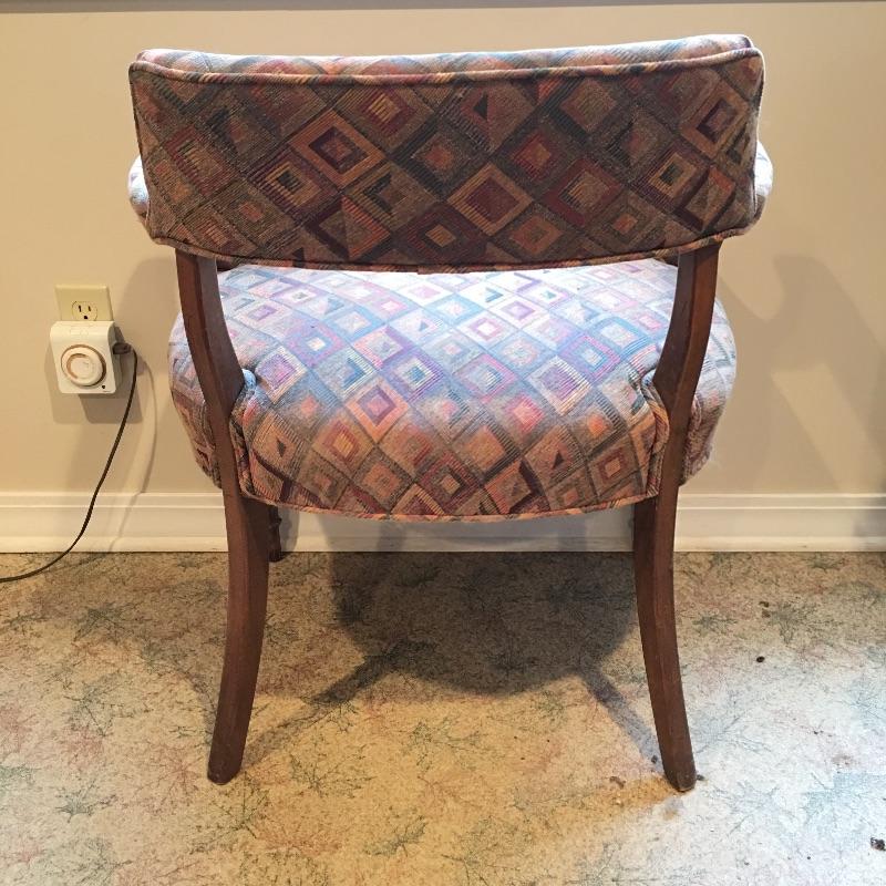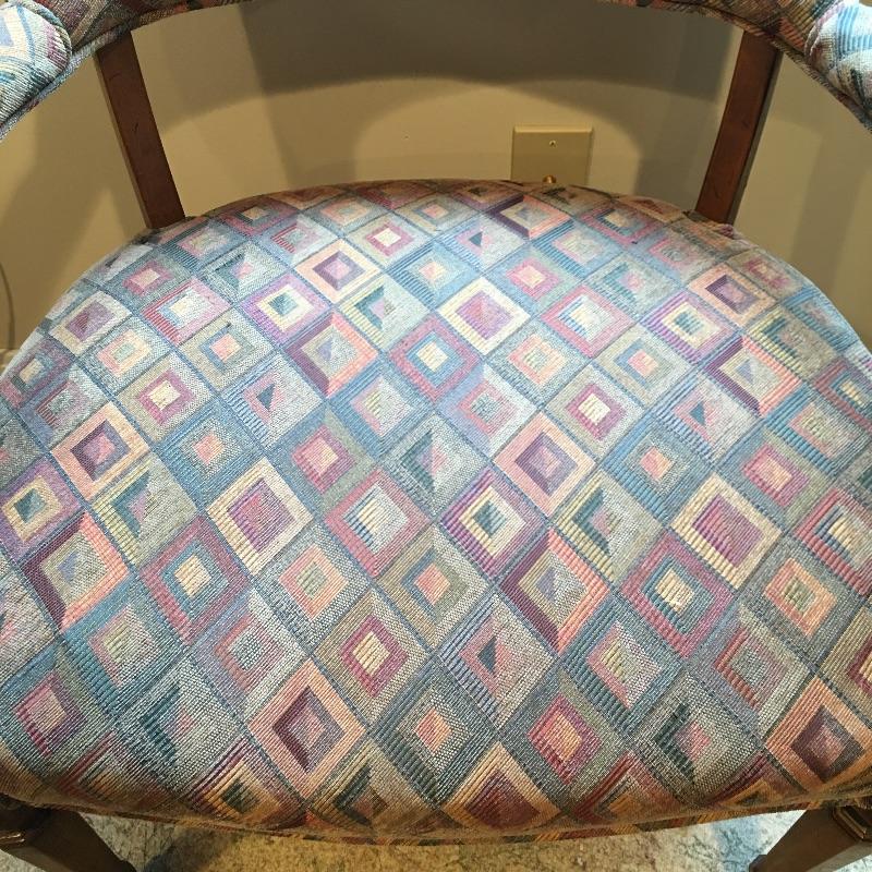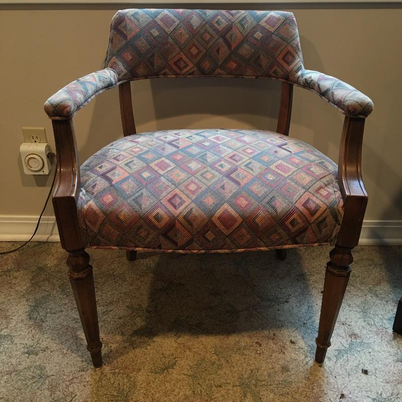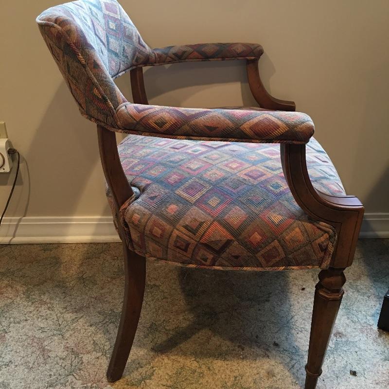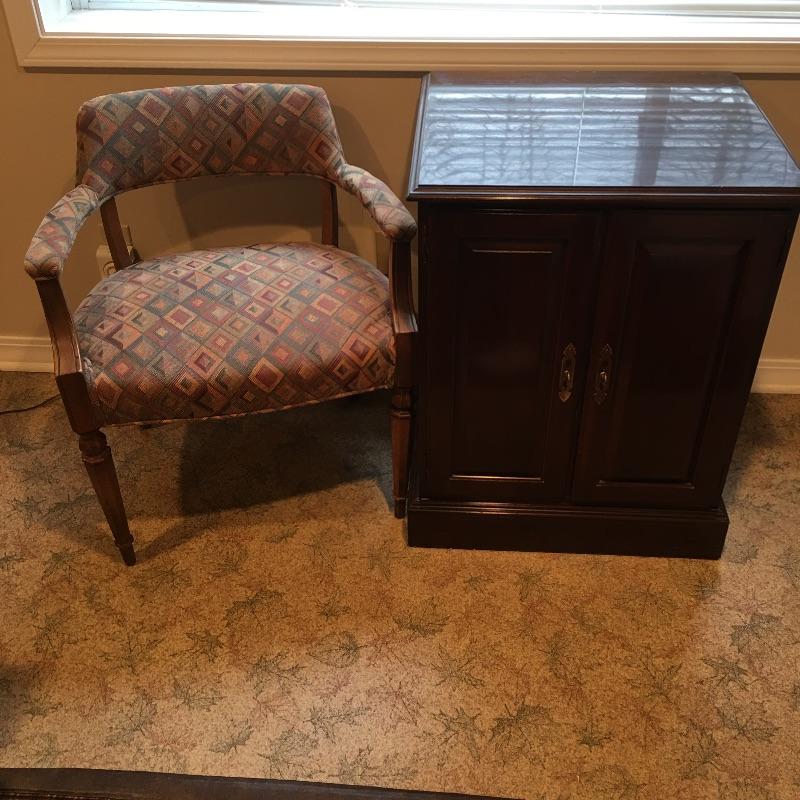 Ethan Allen Cabinet with three shelves is great for storage. This is paired with a cute side chair with colorful fabric that matches anything. Wood accents on chair. Cabinet has some scratches, see pictures.