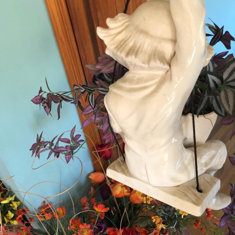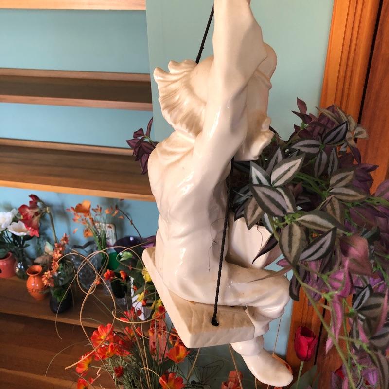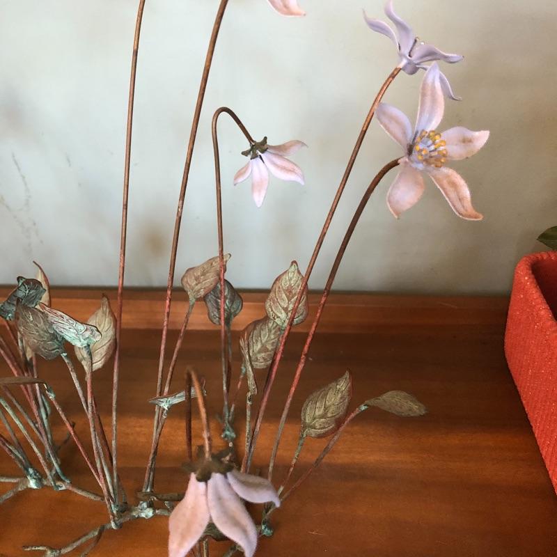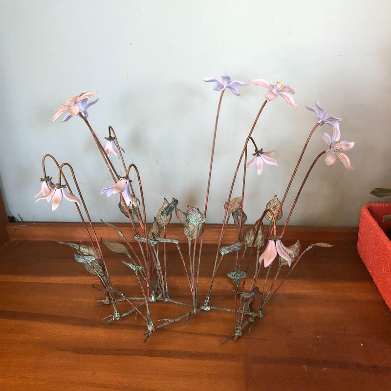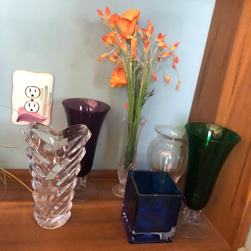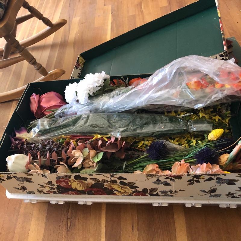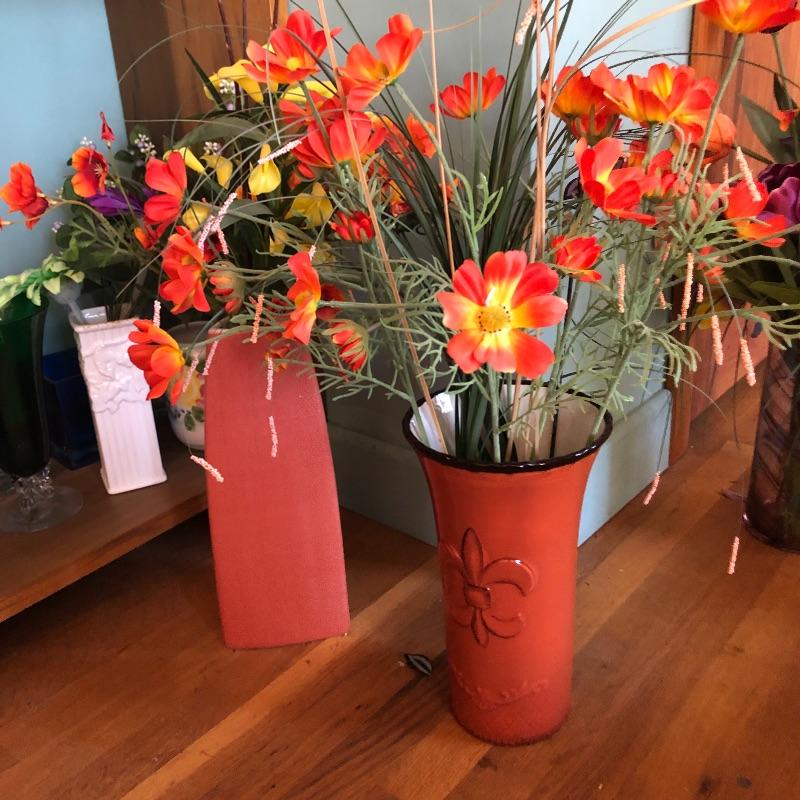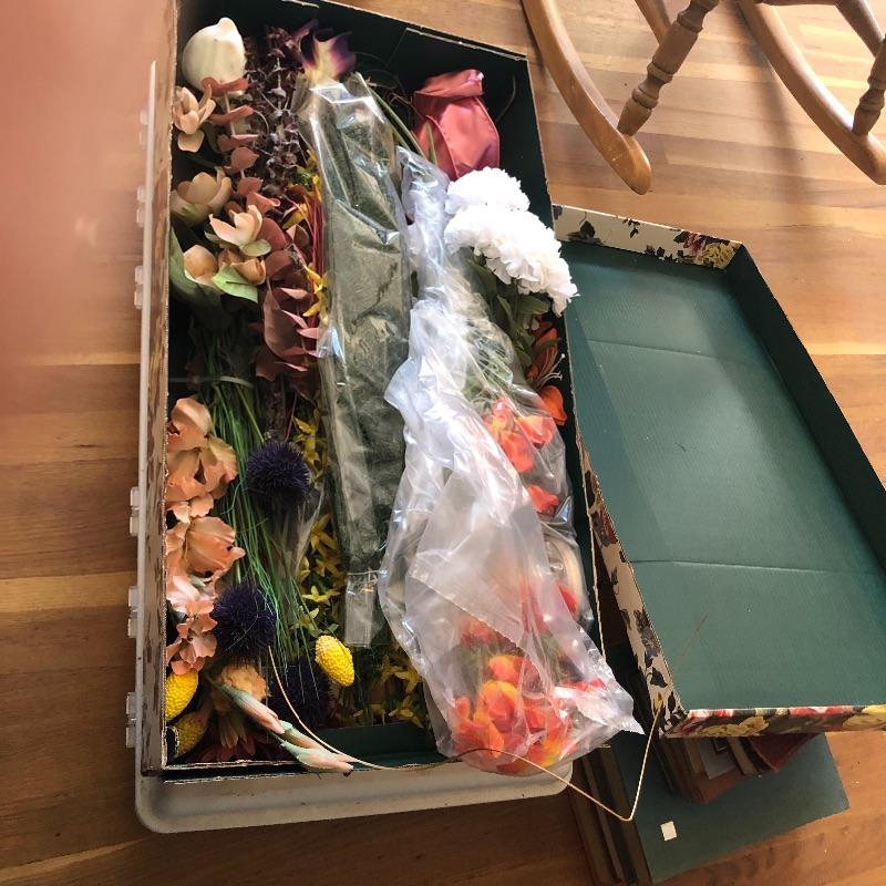 Brighten your entire winter home with this huge lot of faux floral plus vases. From white Camellias to fiery red Rananculus, this lot will cheer you up. In addition to over 10 arrangements in vases there are 2 boxes full of more flowers and plenty more vases to put them in. Vases are glass and ceramic. Also included are two metal accent pieces, a copper and bronze vintage watering can and a hanging ceramic clown with faux foliage. Watering can has some oxidation marks and measures 6” in diameter and 8” tall.