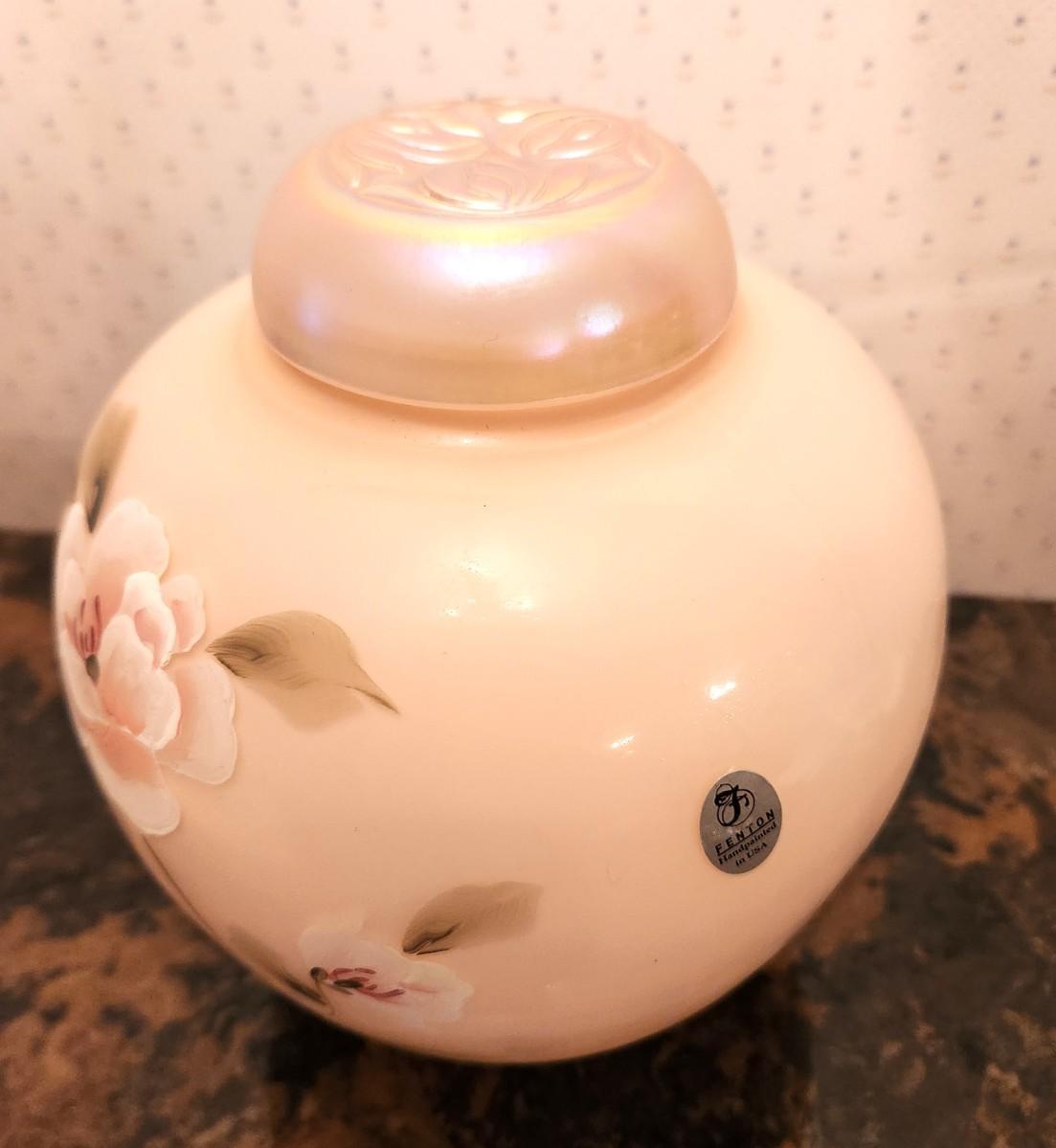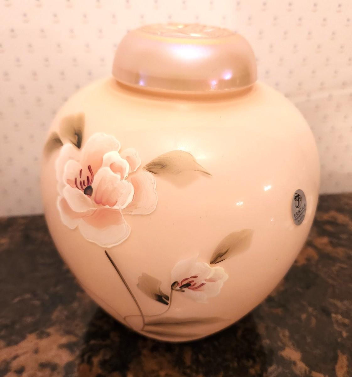 2002 Glass messenger club exclusive - not sold in store - Fenton Art Glass Peach Ginger Jar - signed. 7" tall Good condition.
