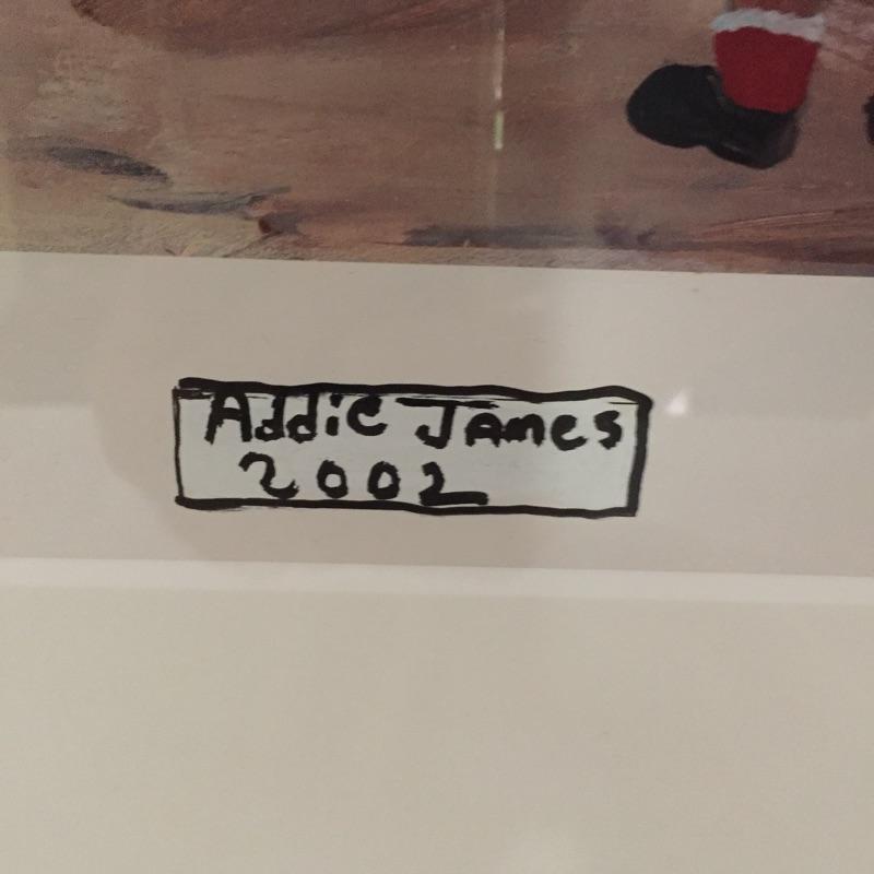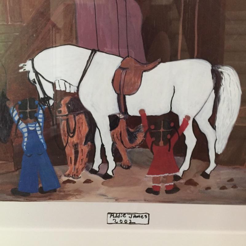 Own a piece of North Carolina art from one of the states premier Folk artists Addie James who lived in Statesville, N.C. This wonderful painting was done in 2002 and portrays a charming scene of children with a horse and dog.