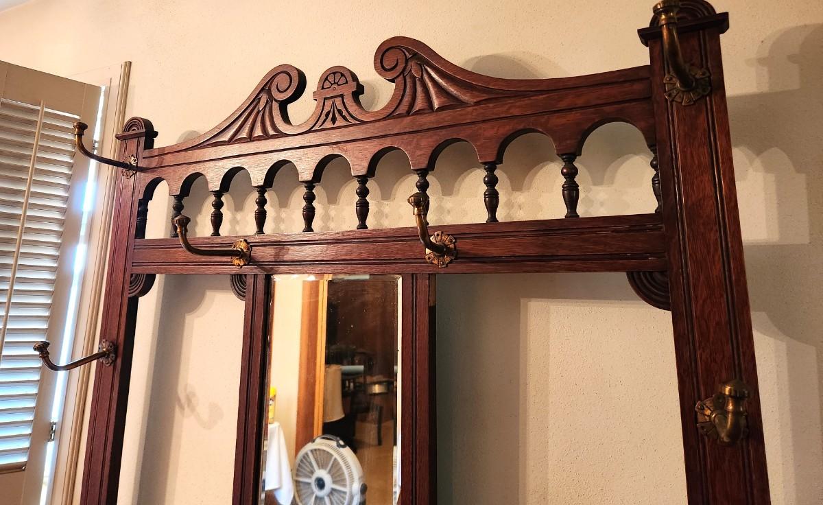 I can say this is the nicest Hall Tree I've had in 15 years of running estate sales. Turn of the Century - oak - Beveled mirror, 6 hooks (all original), drawer, beautiful undamaged Majolica tiles across the back - even the umbrella drain pans at the bottom are present = Art Nouveau era. 41" across, 17" deep, 78" tall. It's a beauty!