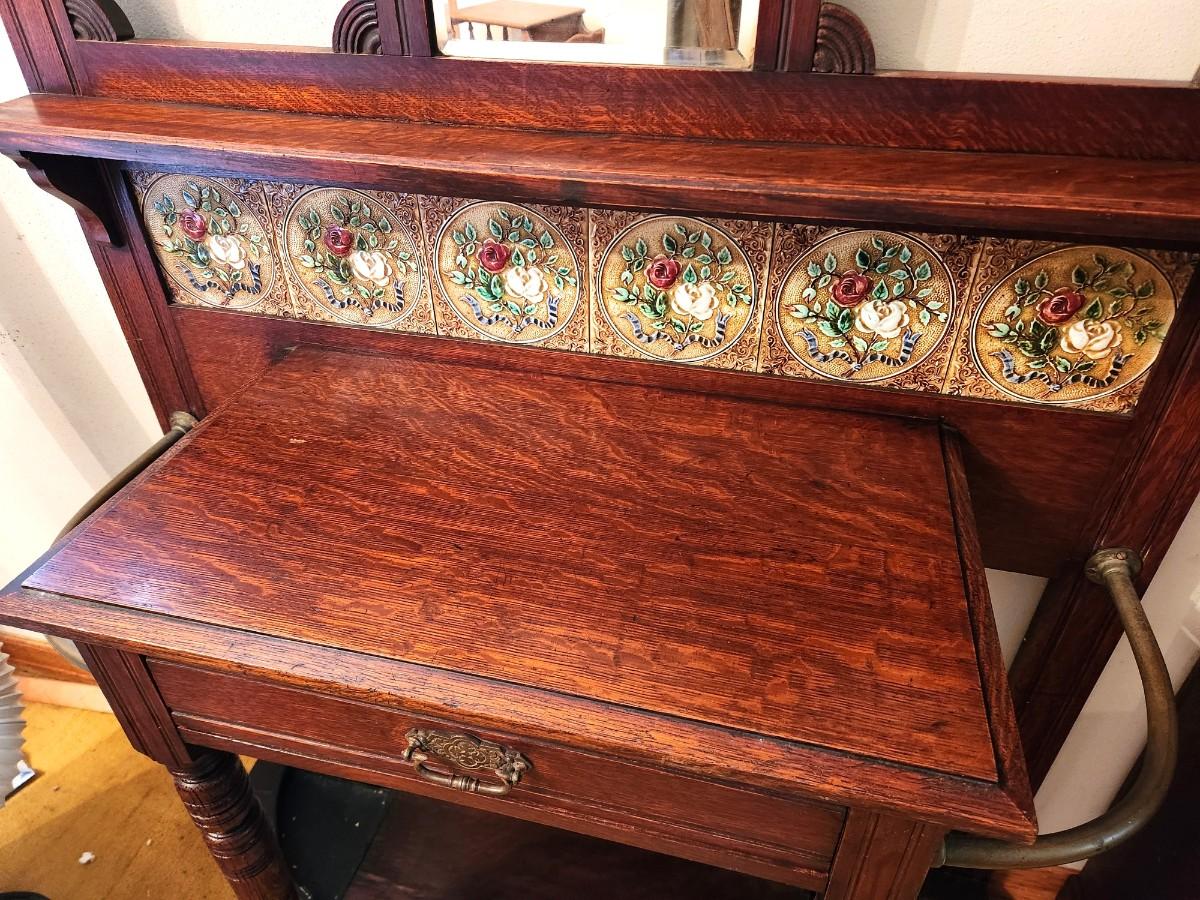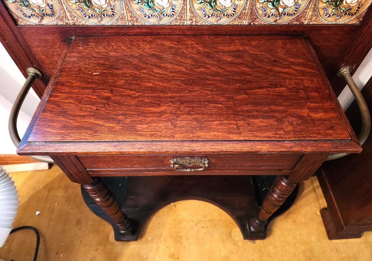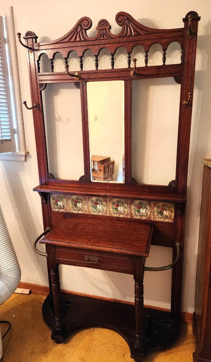 Lot #190 Gorgeous Antique Hall Tree - all original with Majolica Tiles