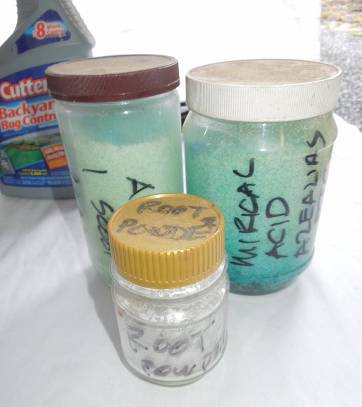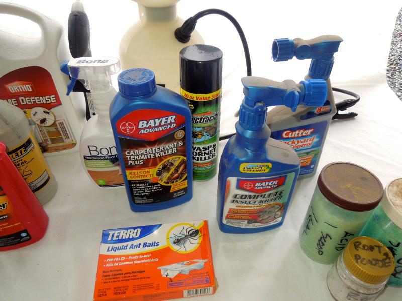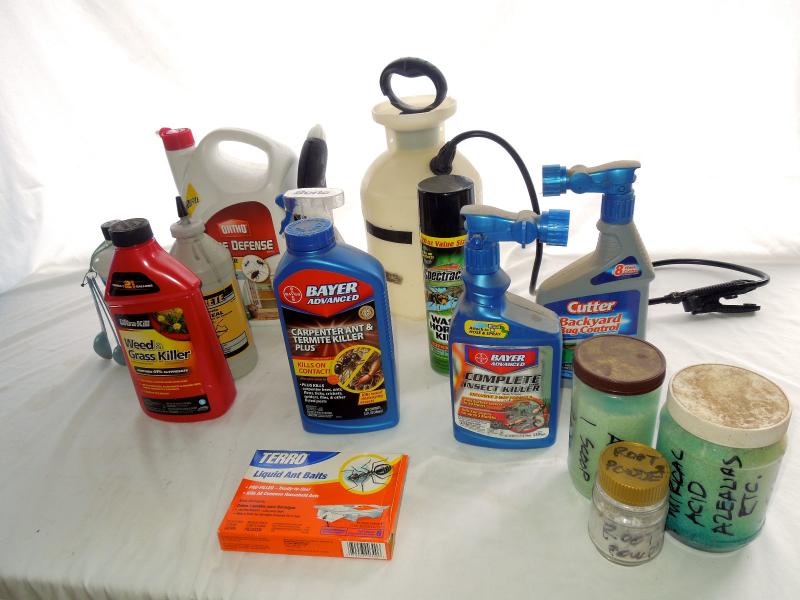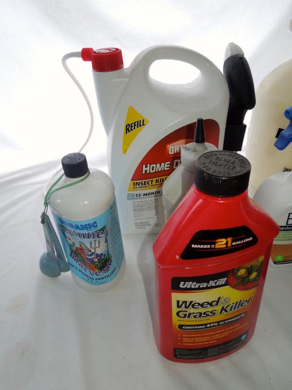 Weed and bug killers; ant bait; plastic pump sprayer; liquid fertilizer and more. Most are at least 3/4 full and some unused.