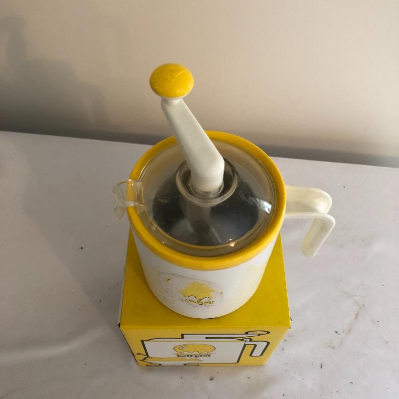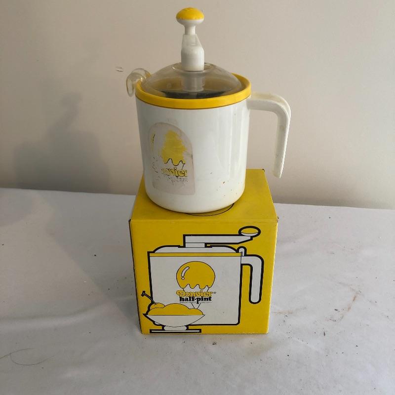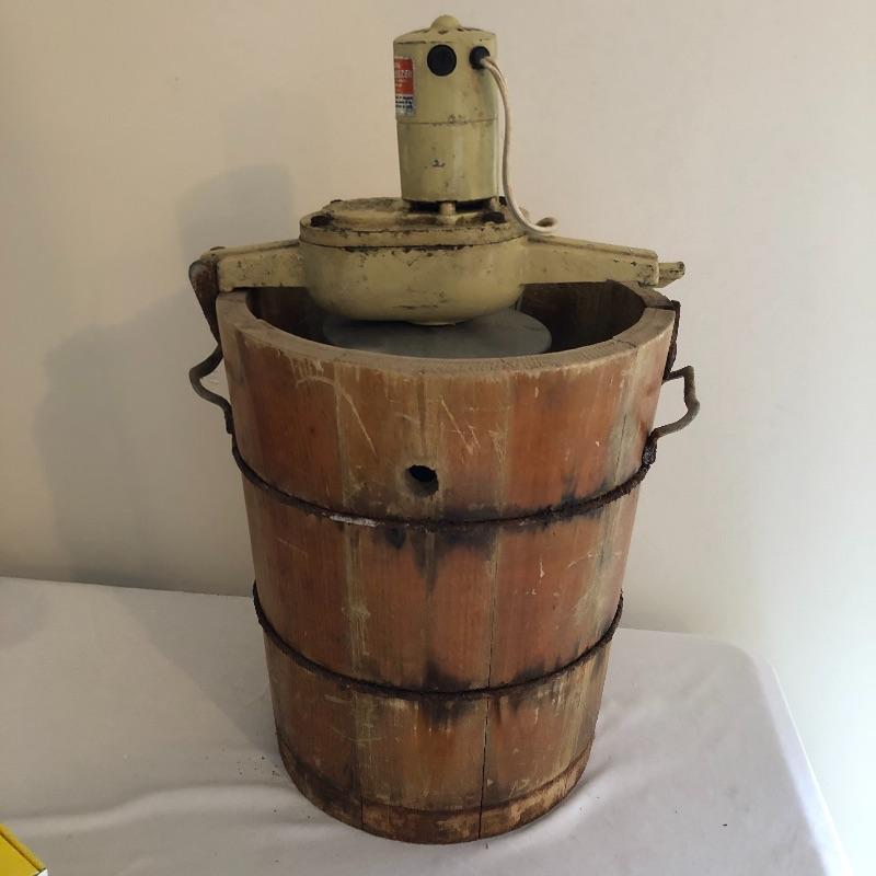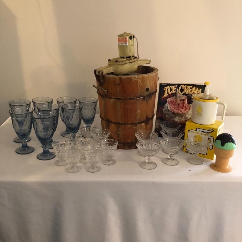 Make your own ice cream for you and your friends. Lot includes White Mountain ice cream maker, Donvier half pint ice cream maker, book titled Ice Cream and a selection of glasses. Ice cream maker measures 12”D x 21” tall. Ice cream maker powered on when tested.