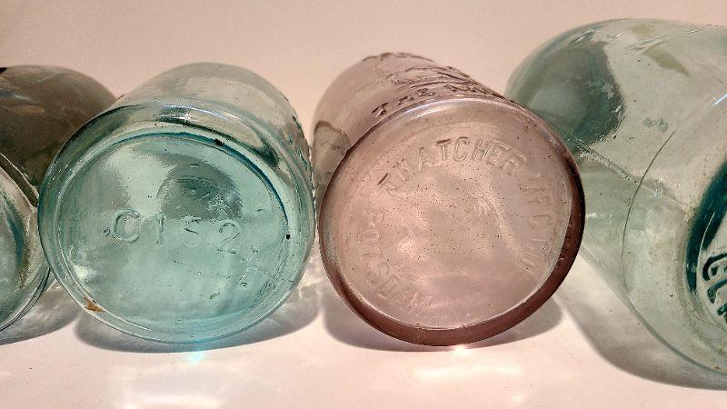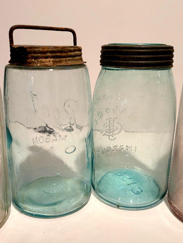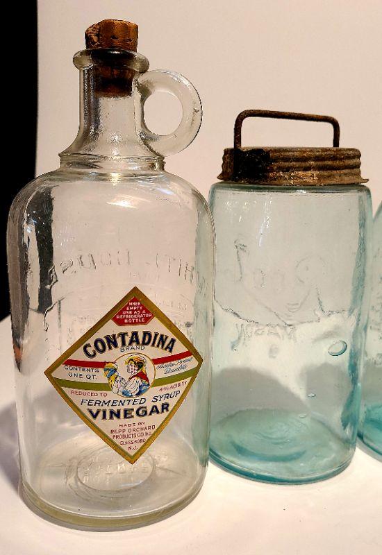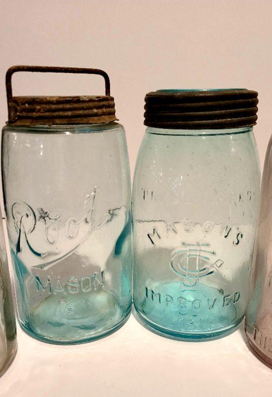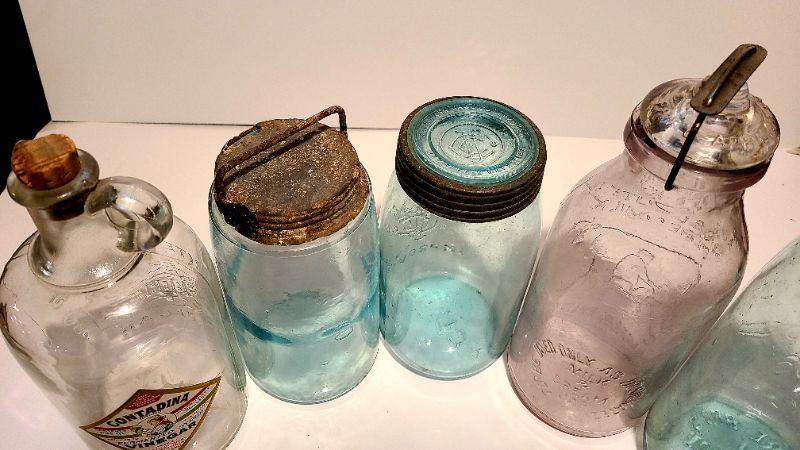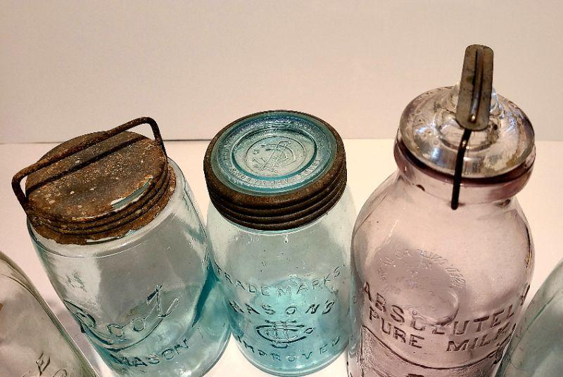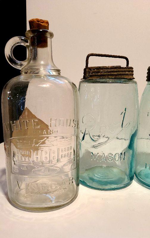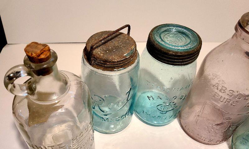 Antique Bottles: White House Vinegar, Root Mason with Handled Lid, Trademarks Mason Improved, Absolutely Pure Milk, Large Masons Moore Bros Clayton NJ. Each lot is unique and you will need to see all pictures. Pictures have been taken from all side to see condition and markings. What you see in the pictures is the actual content of the lot and the pictures are the best representation of the bottles. All bottles are sold-is according to the pictures. For further information please google the makers marks for age.