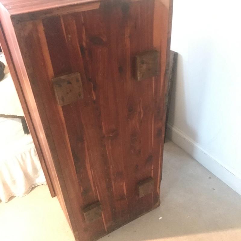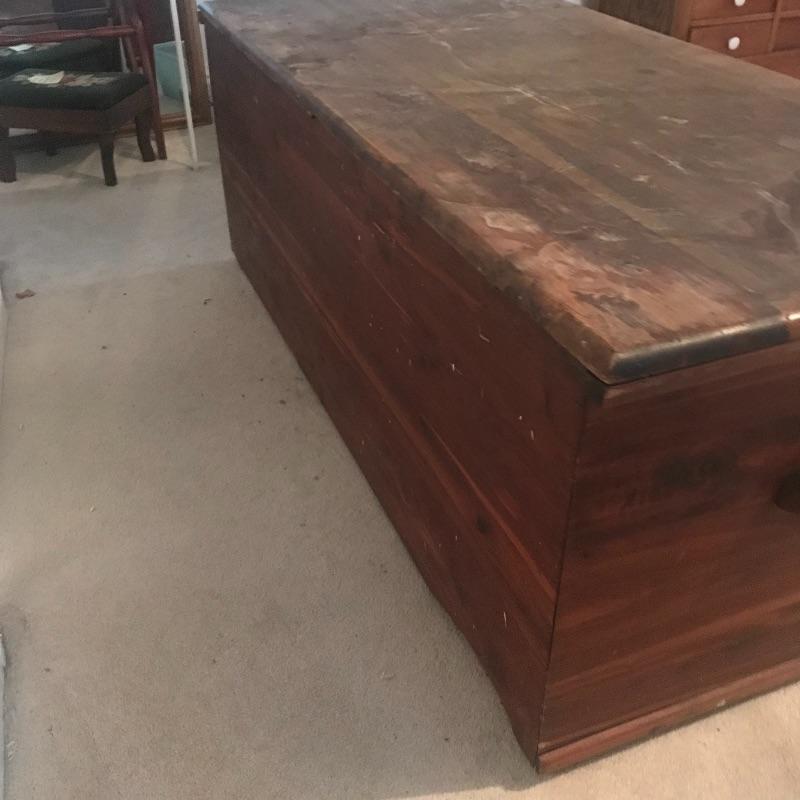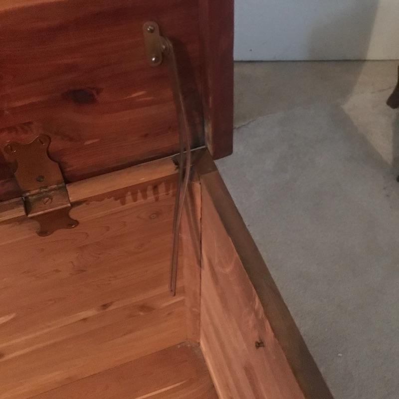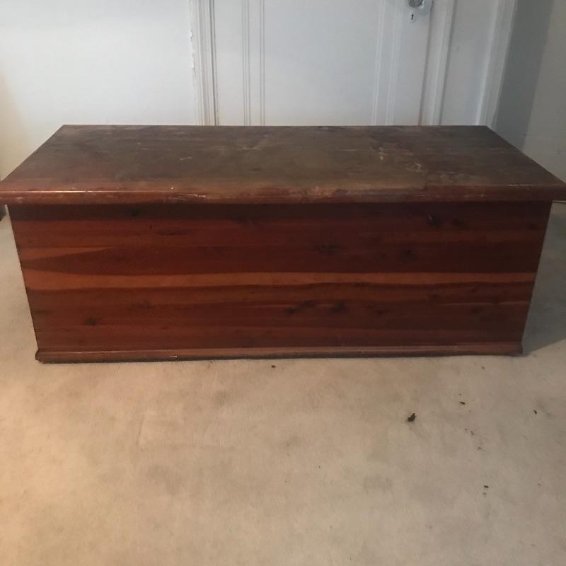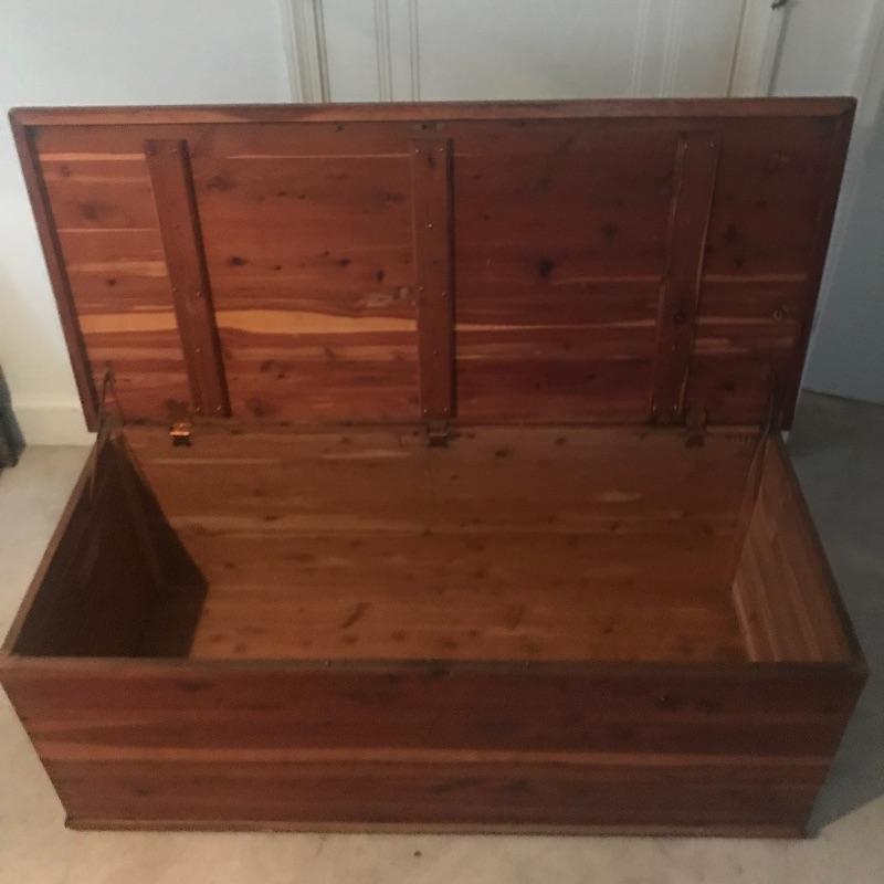 Substantial cedar Chest that still has the cedar smell inside. Wood handles and copper colored fixtures. One hinge is bent and top has a good bit of stains. Piece measures 55.5” x25.5” x20.5”. Local pick up only.