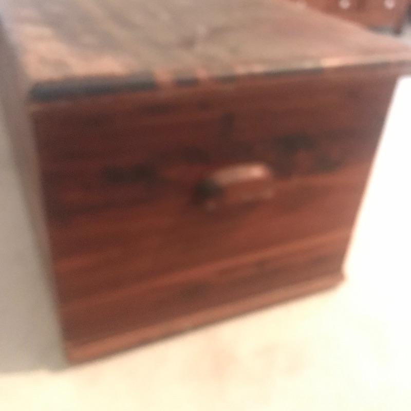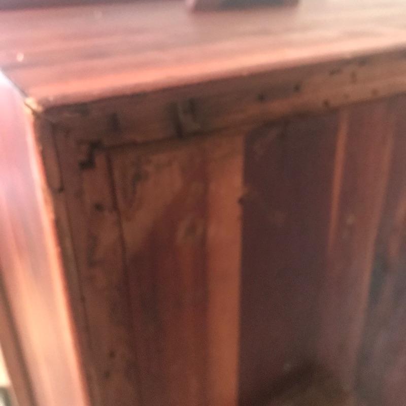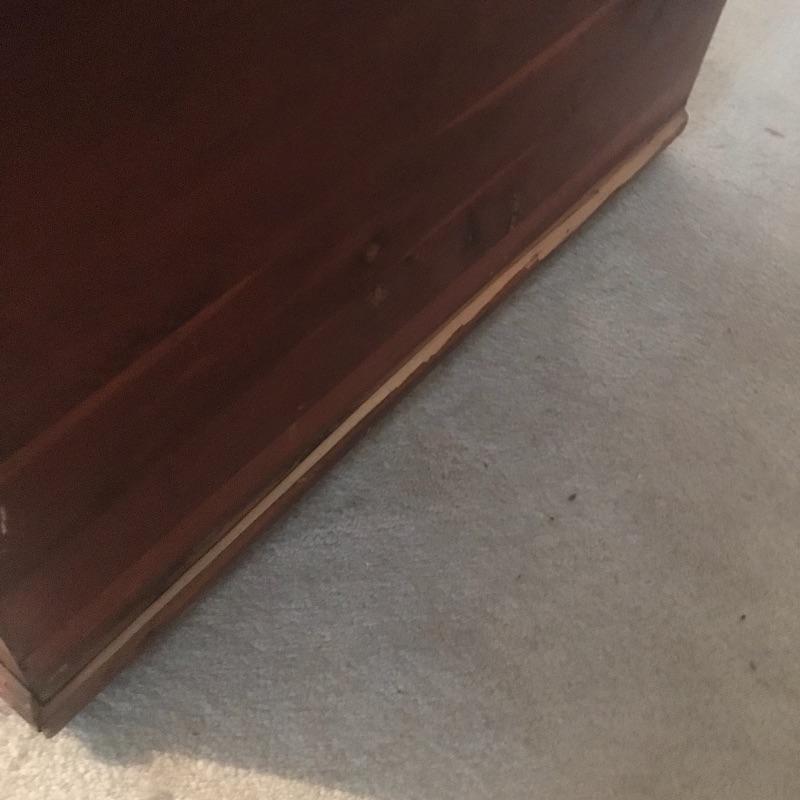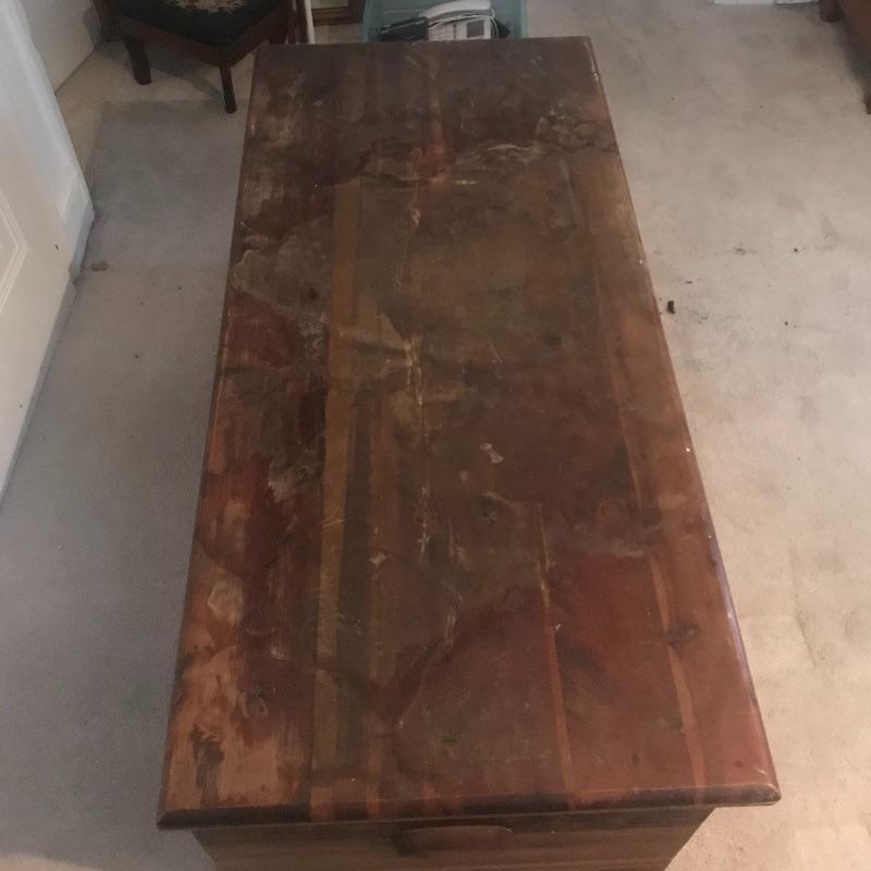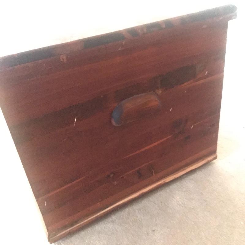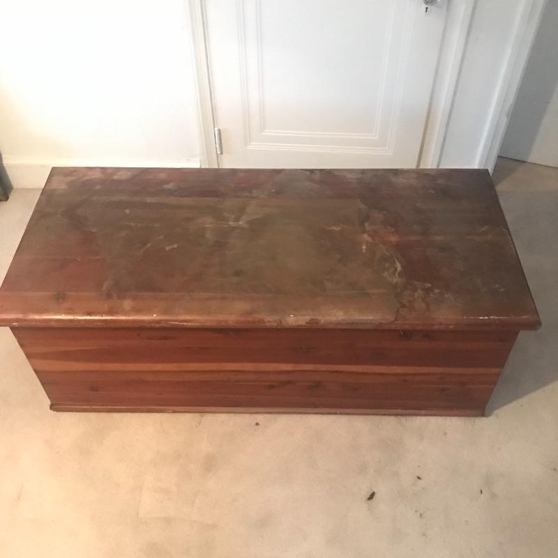 Substantial cedar Chest that still has the cedar smell inside. Wood handles and copper colored fixtures. One hinge is bent and top has a good bit of stains. Piece measures 55.5” x25.5” x20.5”. Local pick up only.